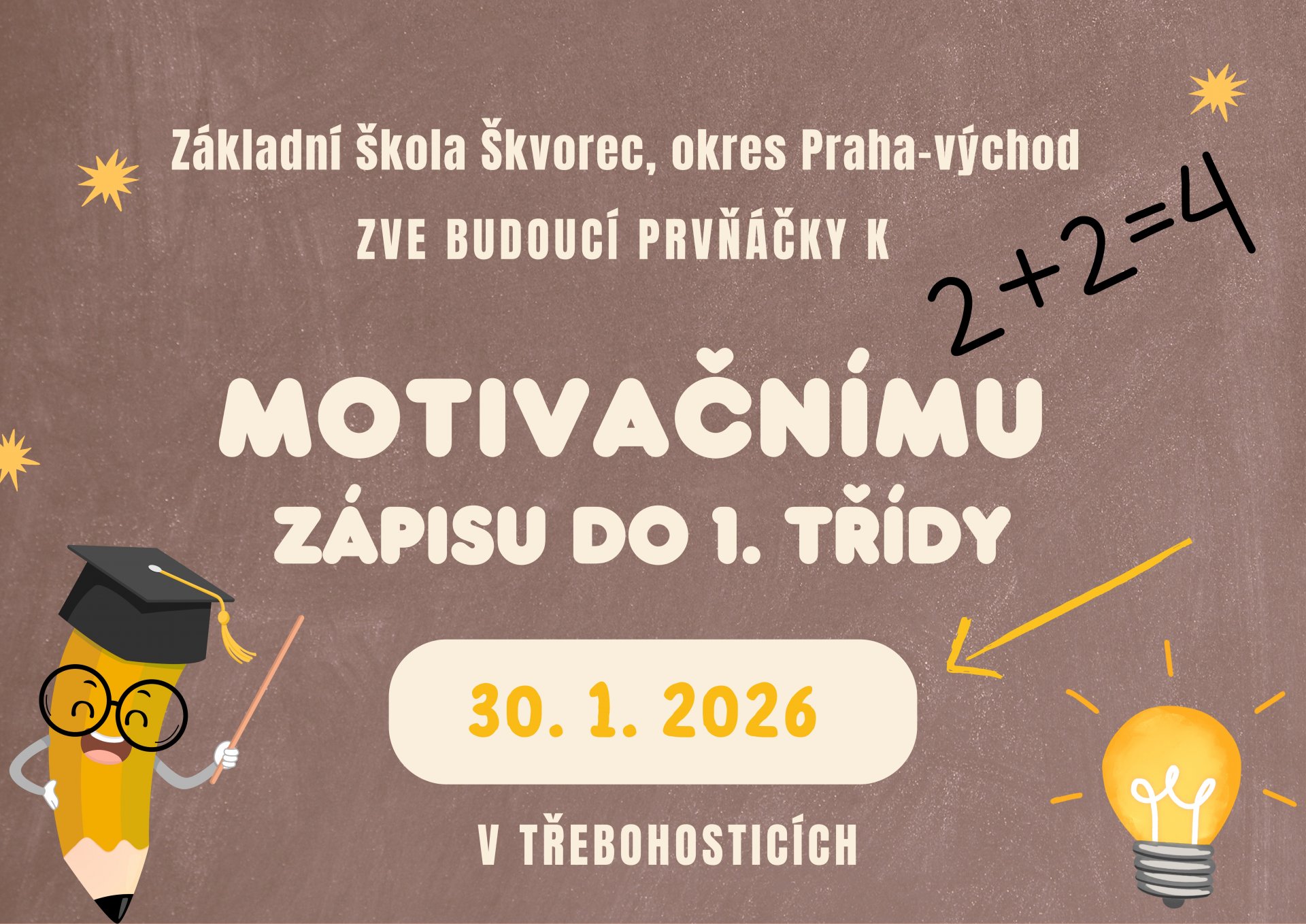 dne 30. 1. 2026 se v budově prvního stupně v Třebohosticích uskuteční motivační zápis do 1. třídy.