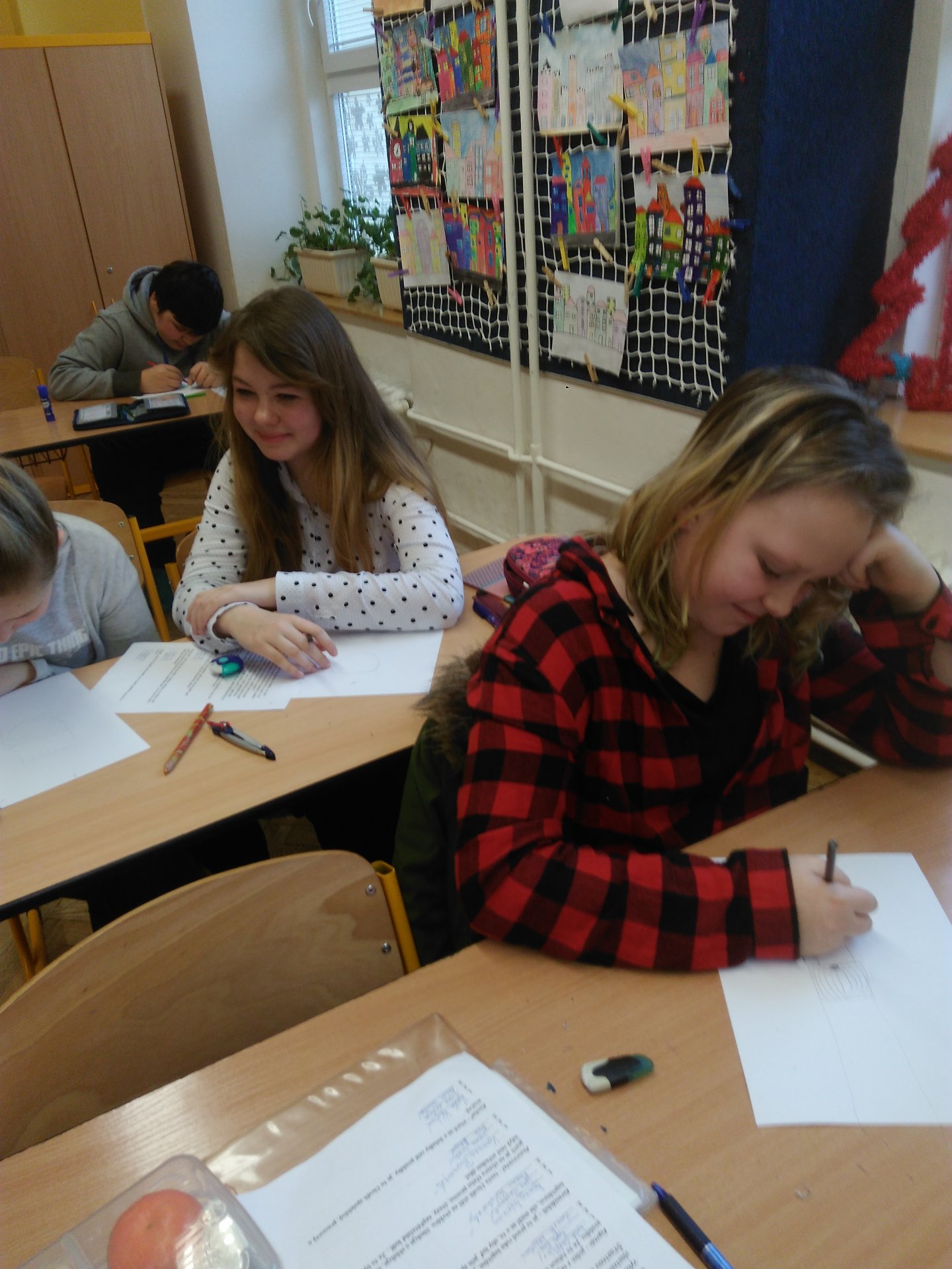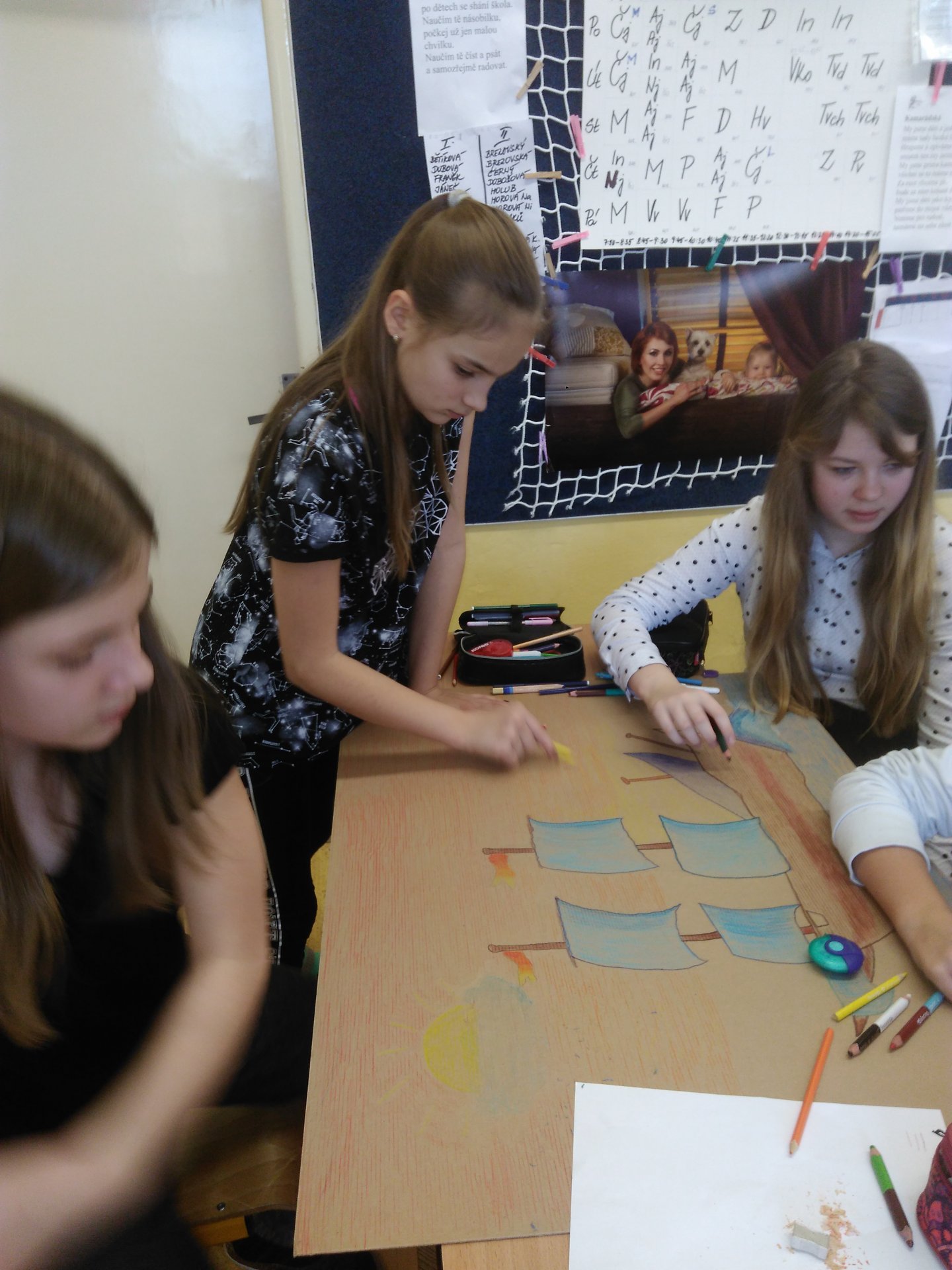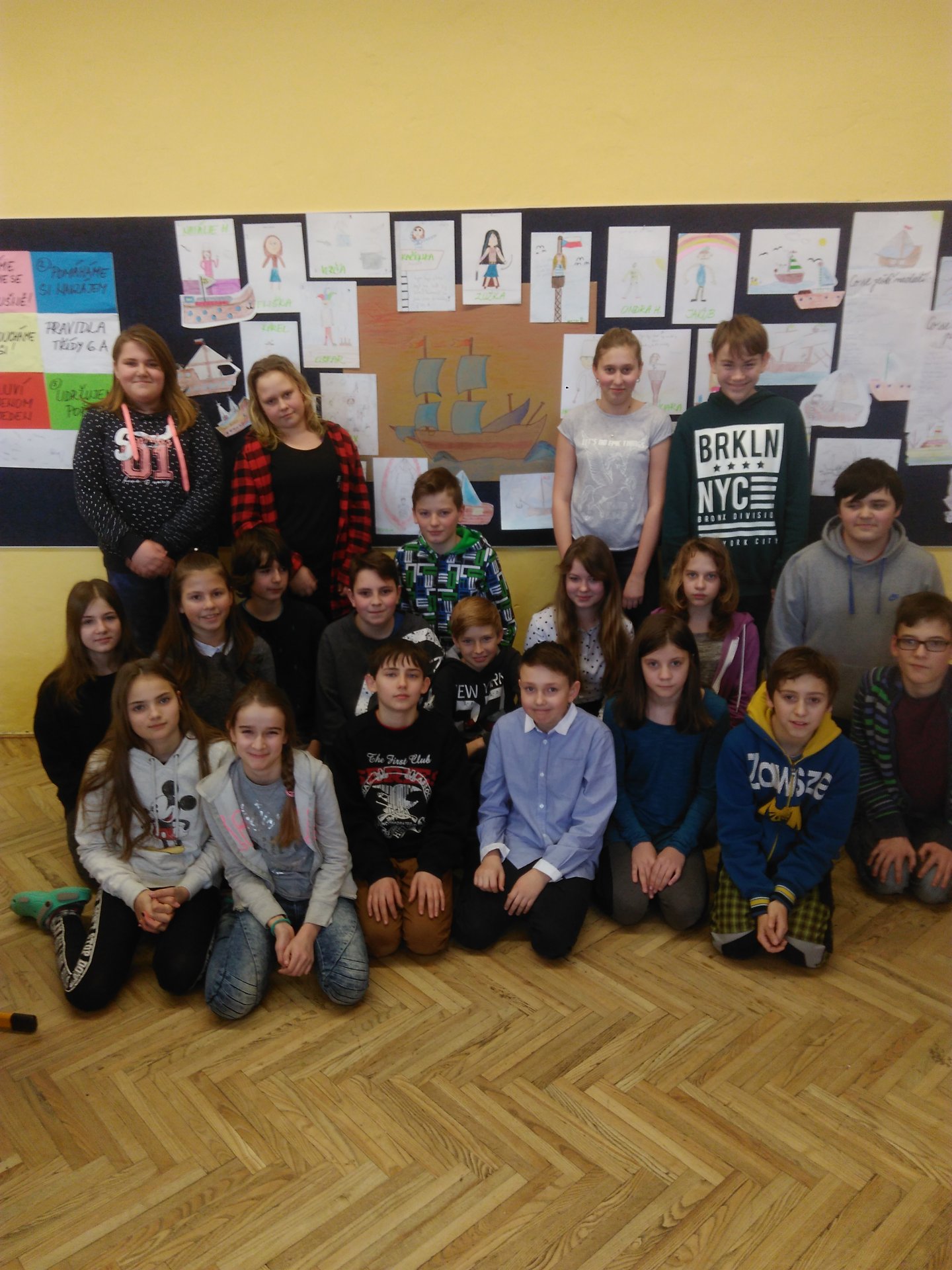 Dnešní dopoledne jsme věnovali projektové činnosti na téma Plavba časem a zrcadlení. Na pololetní projektový den jsme se připravovali dopředu již v hodinách výtvarné výchovy, kdy jsme si kreslili a malovali lodě, koráby a čluny, na kterých bychom chtěli společně plout. V hodinách českého jazyka jsme vymýšleli a psali příběhy z naší společné plavby, kreslili a psali jsme komiksové příběhy o tom, co se nám při dobrodružné plavbě přihodilo. Vytvořili jsme si lodní deník 6.A a nakonec i velikou plachetnici, na které společně poplujeme ve druhém pololetí školního roku. Společně jsme si vyhodnotili, co se nám v prvním pololetí podařilo, v čem jsme dobří, co bychom mohli ještě naopak zlepšit a co bychom si ve druhé půlce školního roku přáli zlepšit nejen v našem třídním kolektivu, ale i na naší škole. V samotném závěru projektového dne jsme si rozdali pololetní vysvědčení.