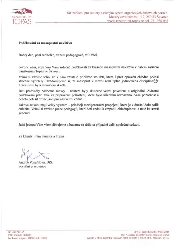Poděkování z Topasu za masopustní průvod dětí ze ZŠ Škvorec