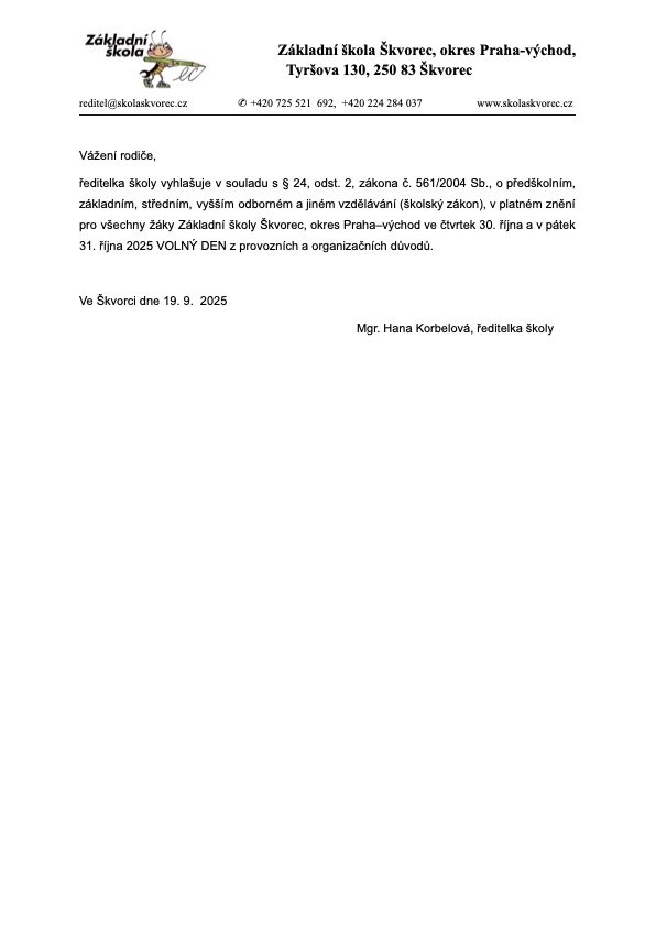 ředitelka školy vyhlašuje v souladu s § 24, odst. 2, zákona č. 561/2004 Sb., o předškolním, základním, středním, vyšším odborném a jiném vzdělávání (školský zákon), v platném znění pro všechny žáky Základní školy Škvorec, okres Praha–východ ve čtvrtek 30. října a v pátek 31. října 2025 VOLNÝ DEN z provozních a organizačních důvodů.