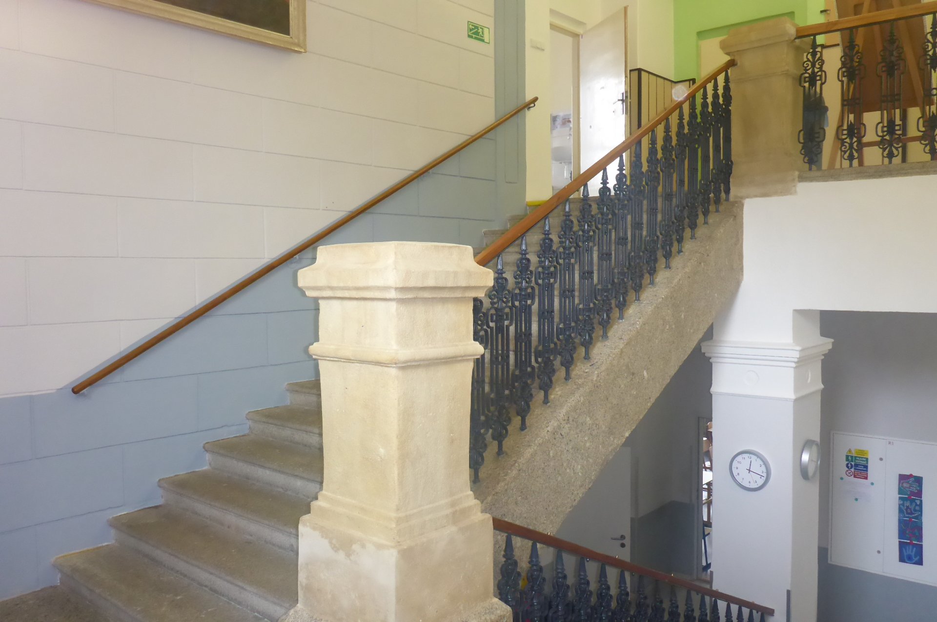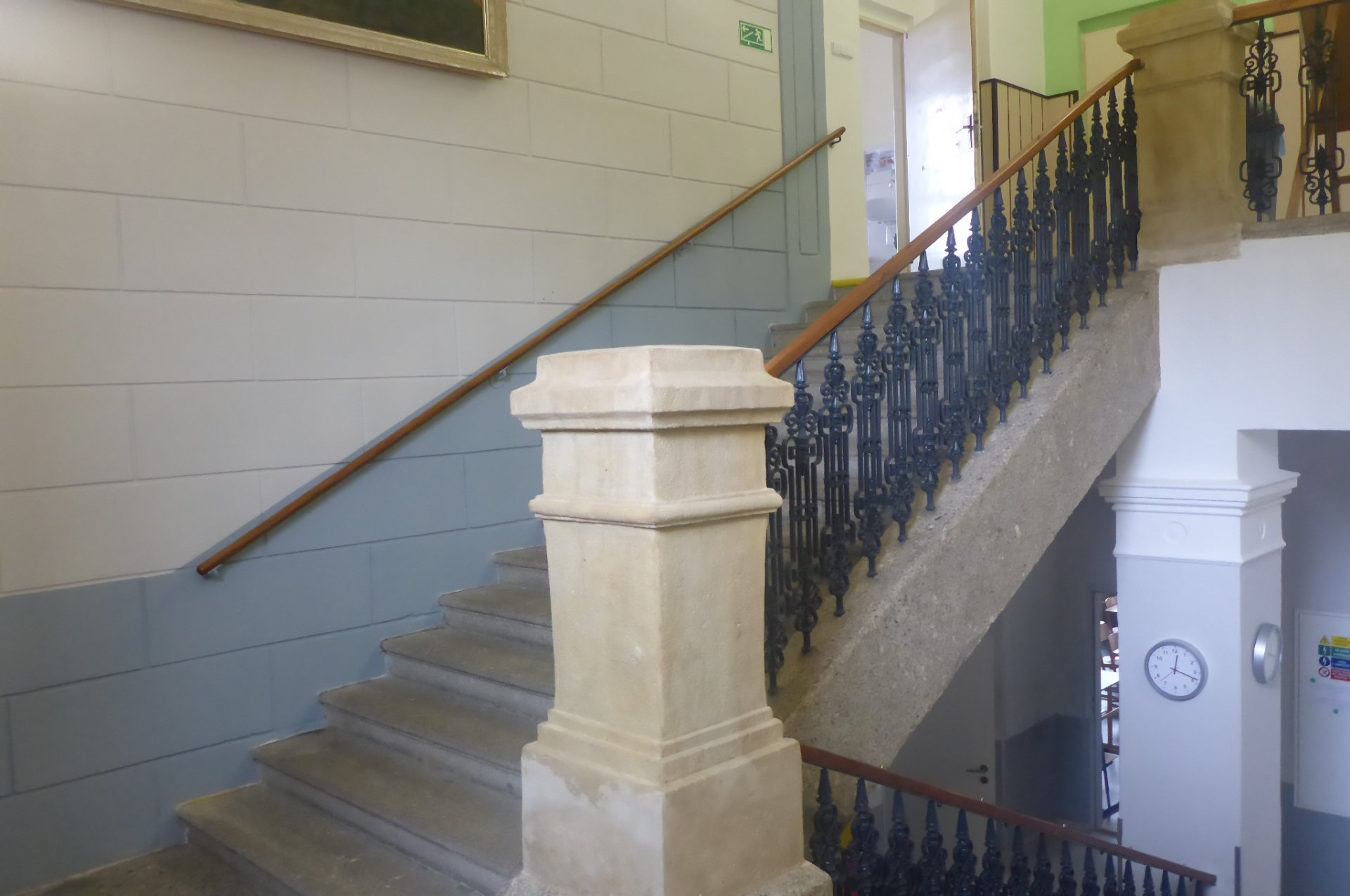 S radostí z našeho dokončeného prázdninového školního díla Vám chci oznámit jednu z novinek, která Vás překvapí po vstupu do budovy školy - rekonstrukce starého schodiště do původního vzhledu.