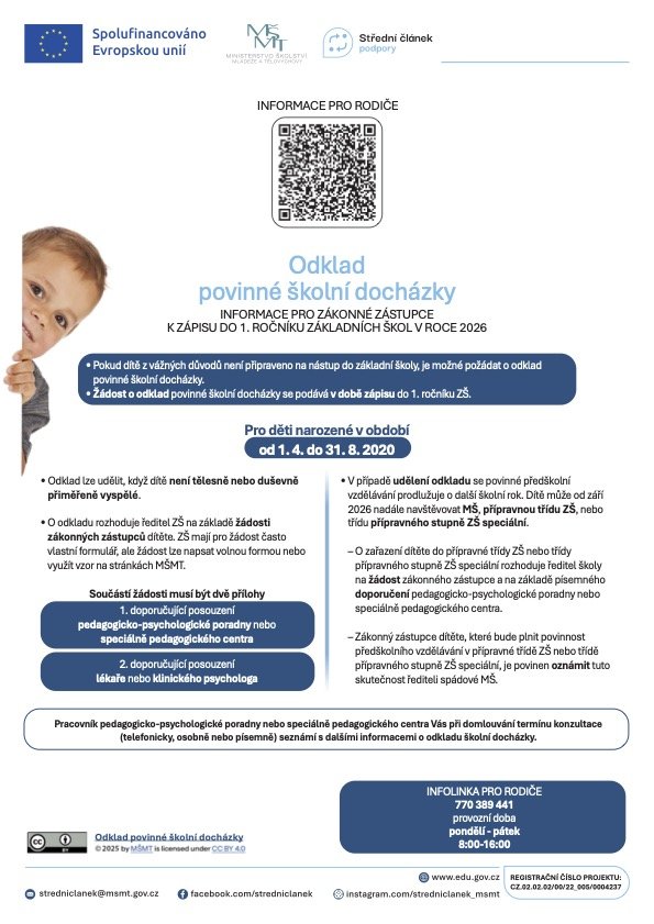 INFORMACE PRO ZÁKONNÉ ZÁSTUPCE K ZÁPISU DO 1. ROČNÍKU ZÁKLADNÍCH ŠKOL V ROCE 2026