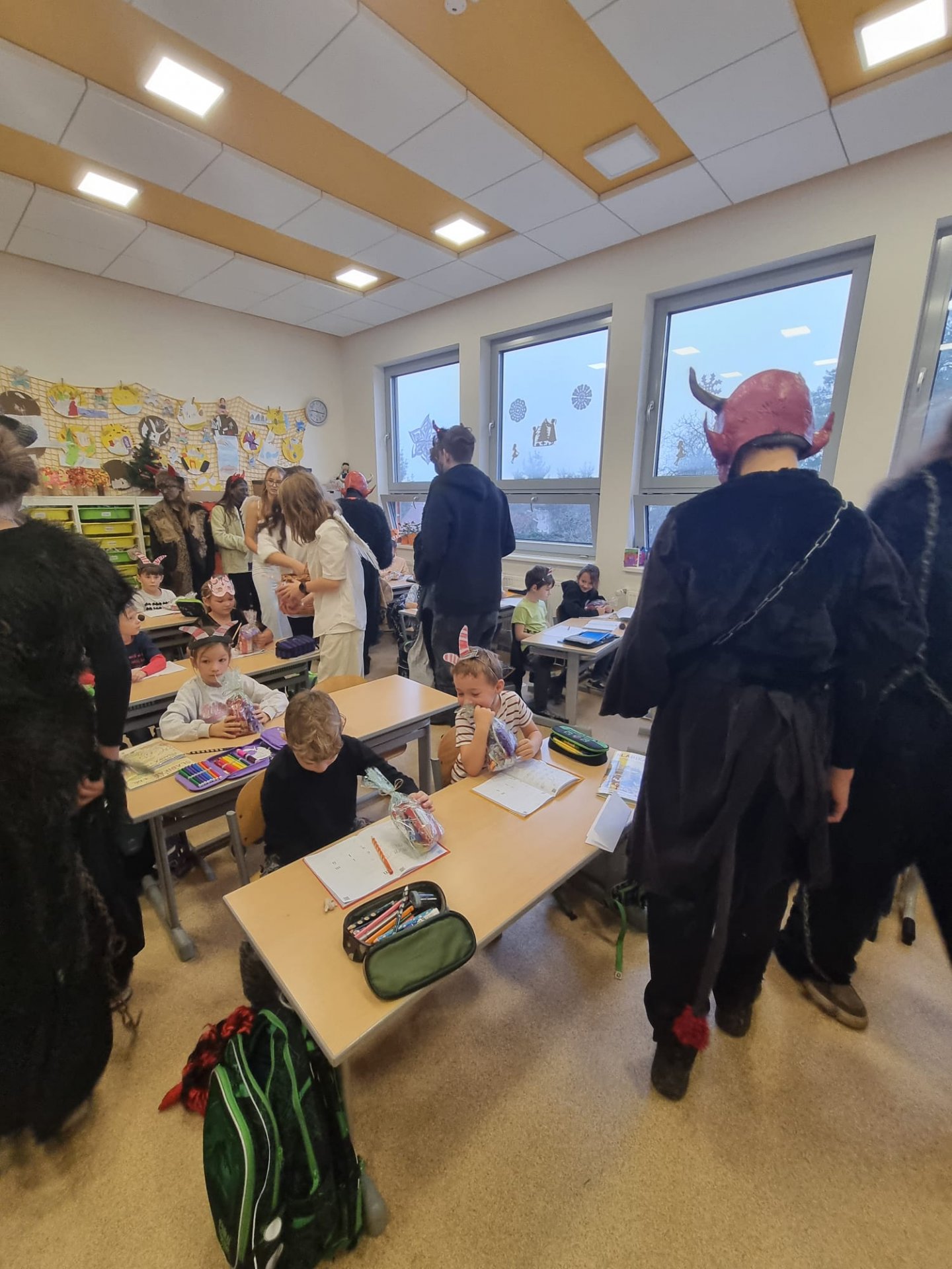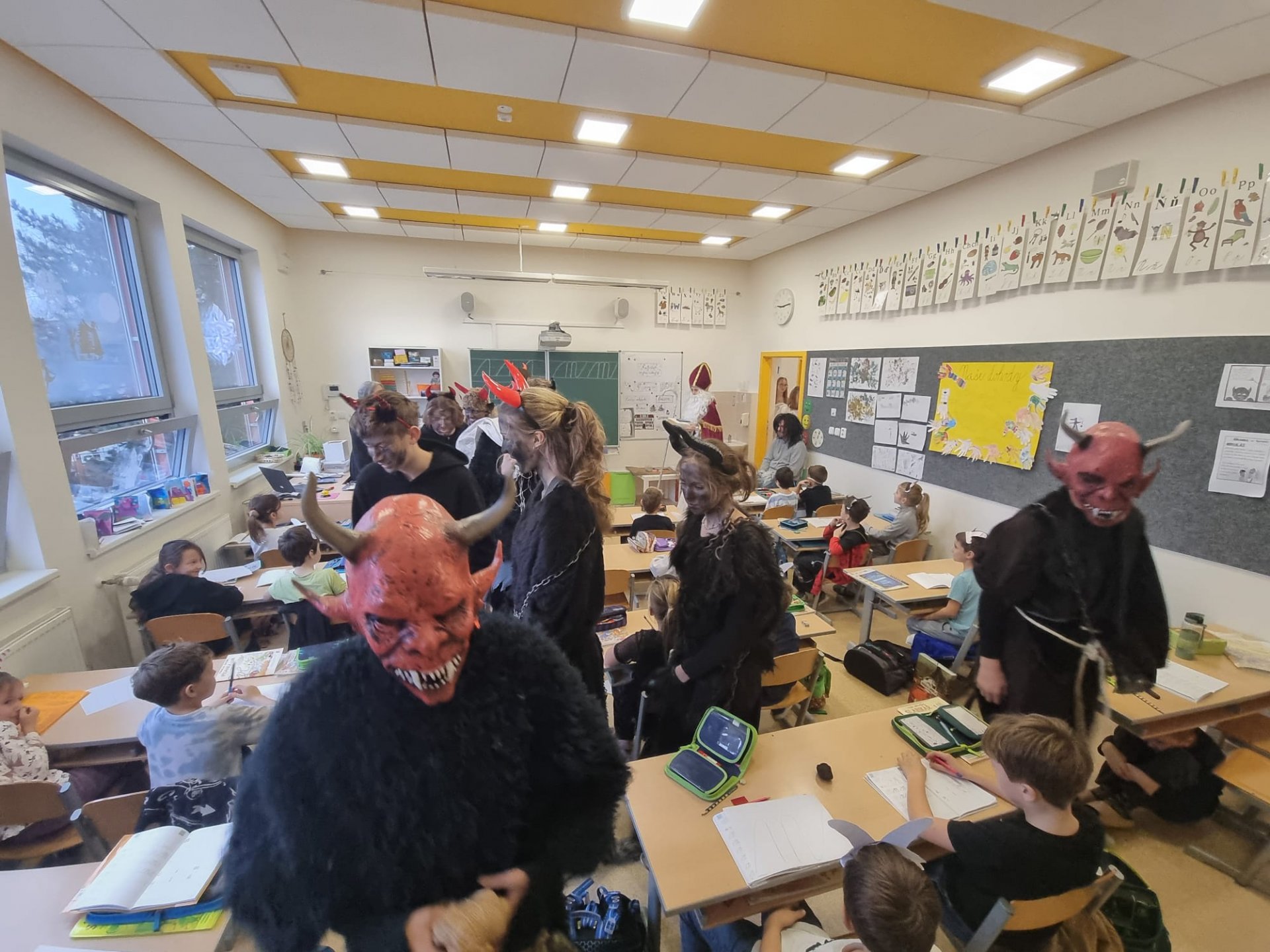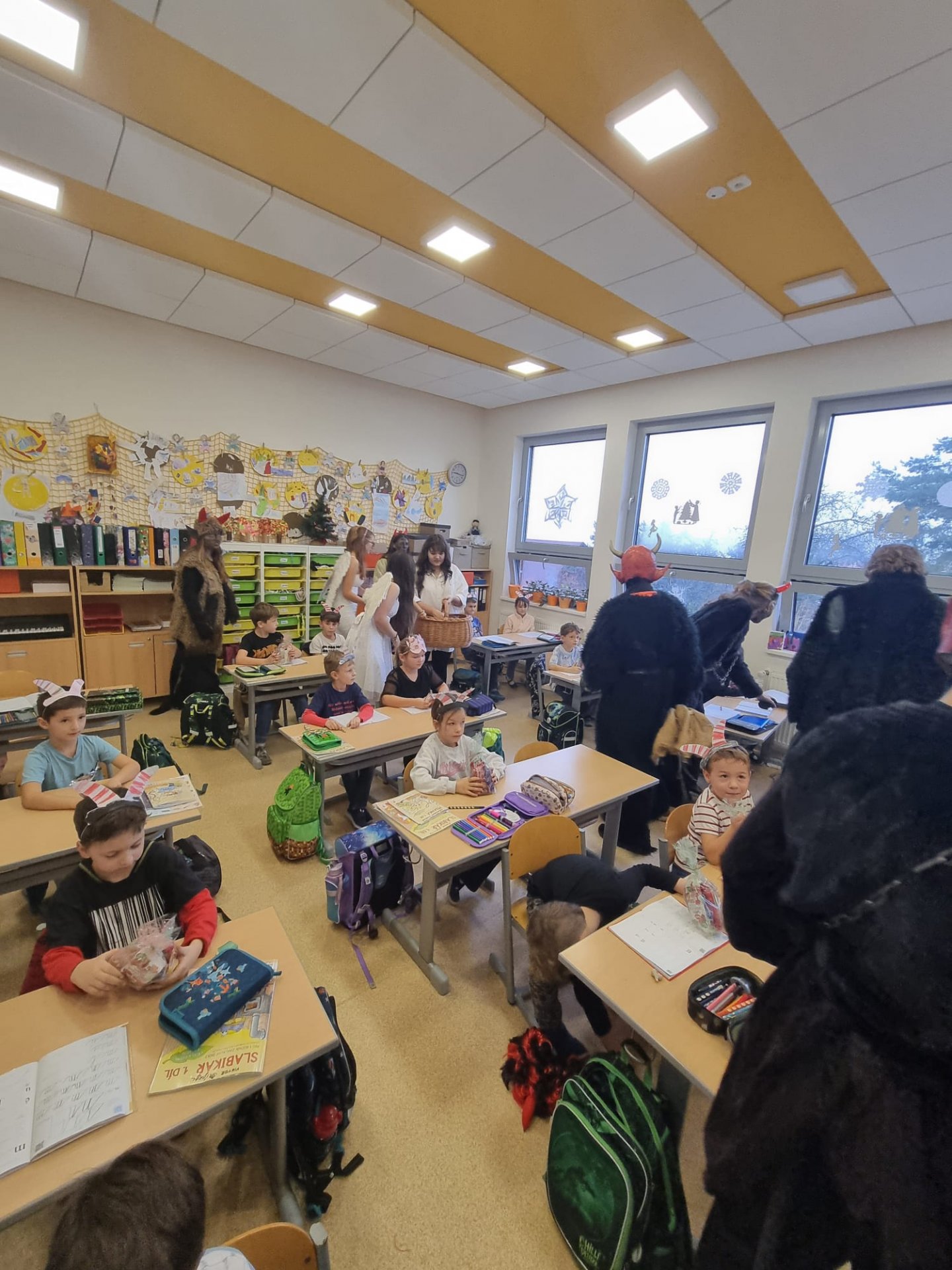 Prvňáčci se dívali z okna, občas měli pocit, že je odkudsi někdo pozoruje. Přijdou opravdoví čerti? Někdo řekl, že přijdou převlečení deváťáci, ale vesměs tomu nikdo nevěřil. Nebo přece jen? Bylo to velké tajemství. Jedno je však třeba s určitostí říci: Všichni byli tentokrát hodní, někdo si dokonce občas ufňukl, a když se Mikuláš, čerti a andělé nahrnuli do třídy, nikdo ani nepípl. A už vůbec nikoho ani nenapadlo, aby si zahrál na hrdinu. Takové to bylo.