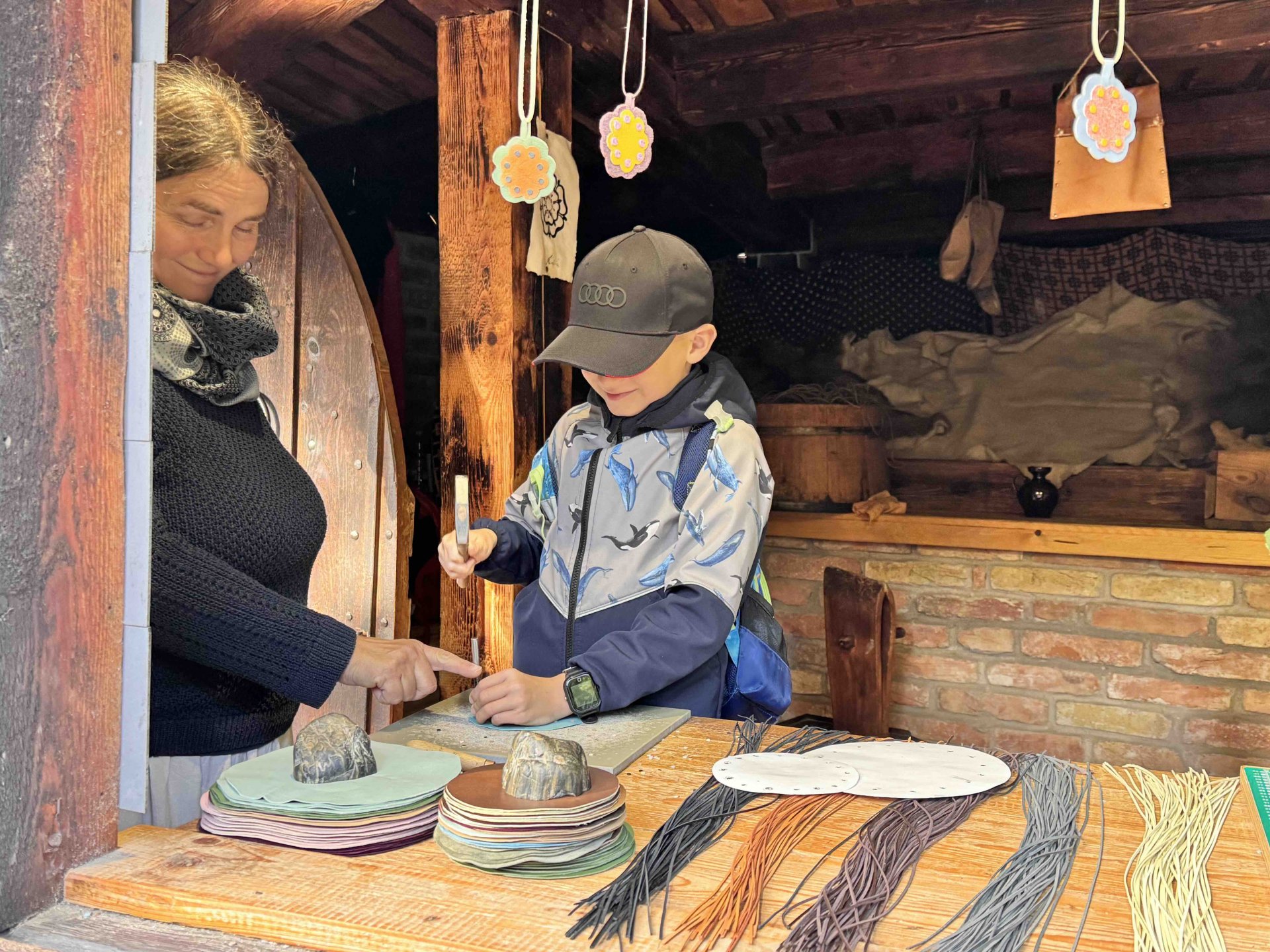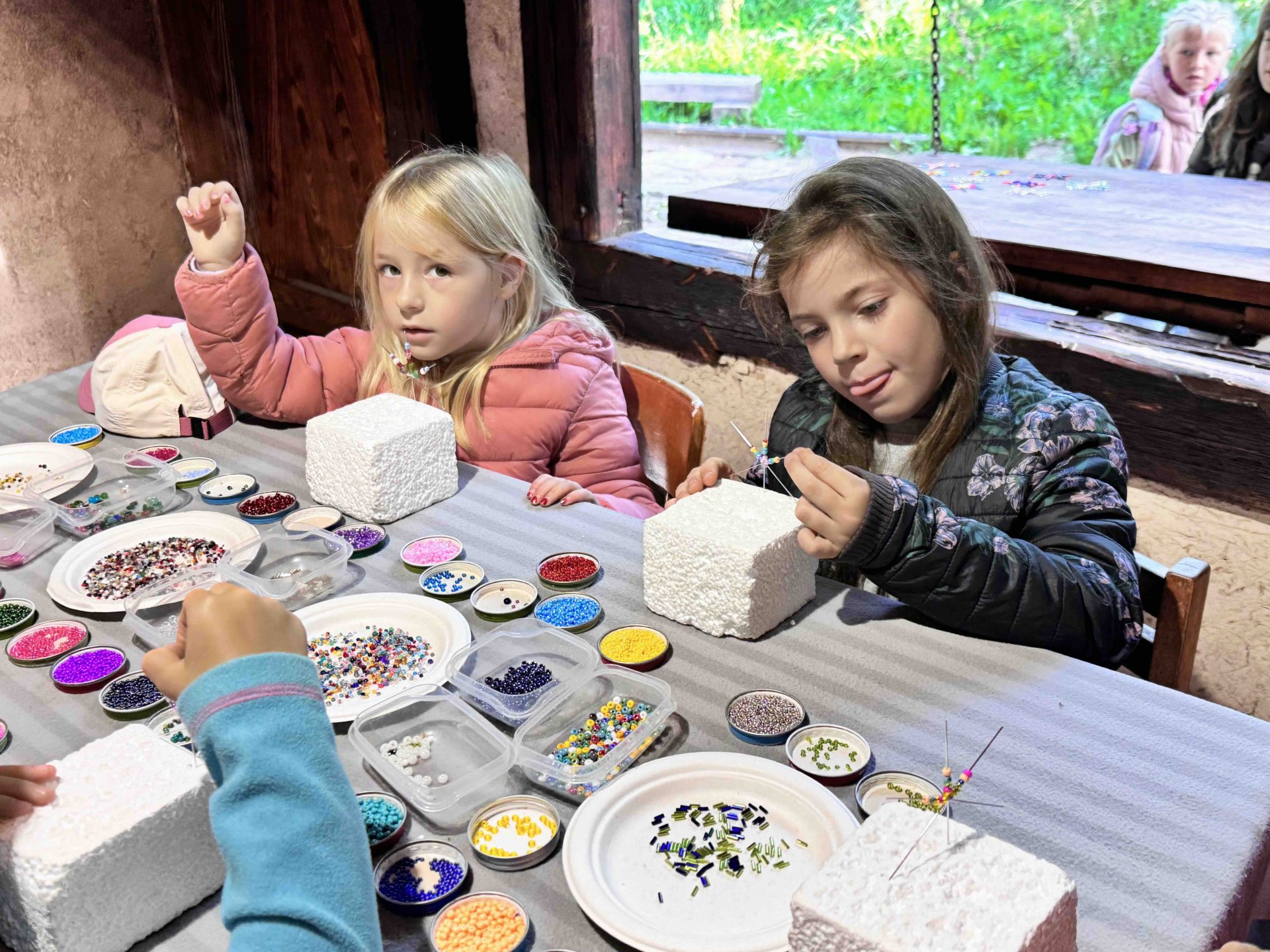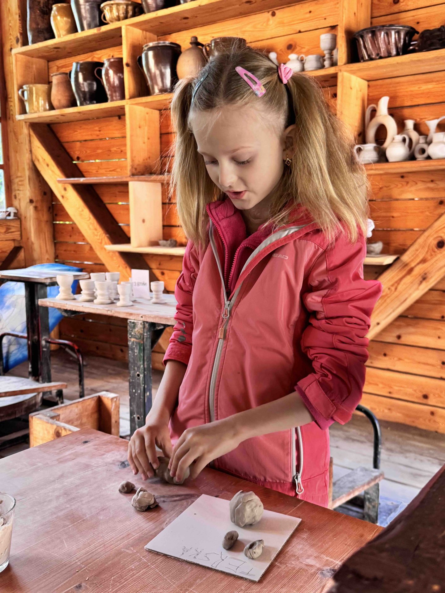 Zajímavé bylo i řezbářství, kde děti obdivovaly práci se dřevem, a hrnčířství, v němž si mohly vyzkoušet tvarování hlíny. V mincovně si vyrazily vlastní minci a při rýžování zlata hledaly v písku malé poklady. V dílně drátěnictví si zase zkusily jednoduché výrobky z drátků.