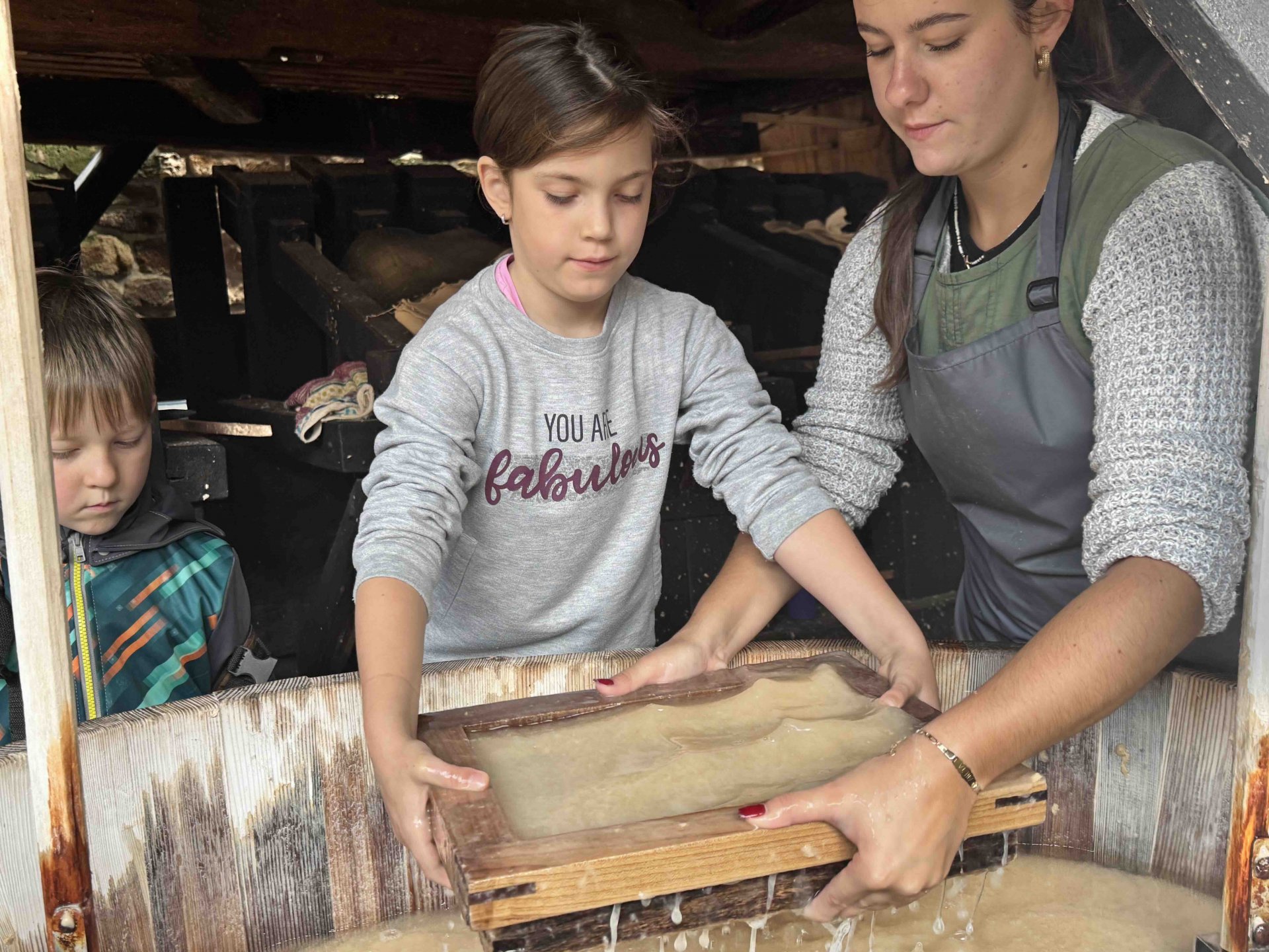 Postupně jsme navštívili několik dílen. Děti si samy vyrobily vlastní svíčky z včelího vosku, asistovaly při výrobě ručního papíru a mohly si vyrobit přívěsek z korálků. Velkým zážitkem byla také provaznická dílna, kde si každý mohl uplést kousek vlastního provazu.