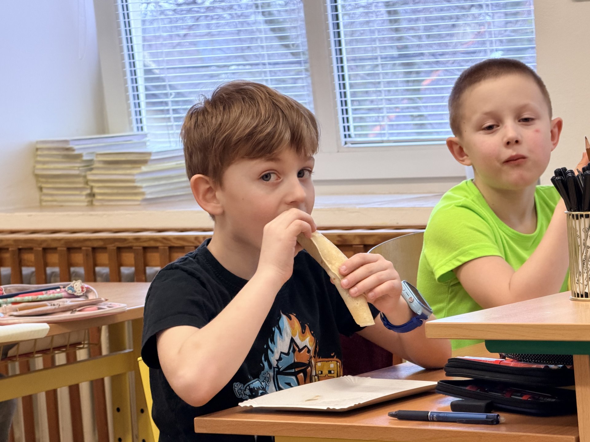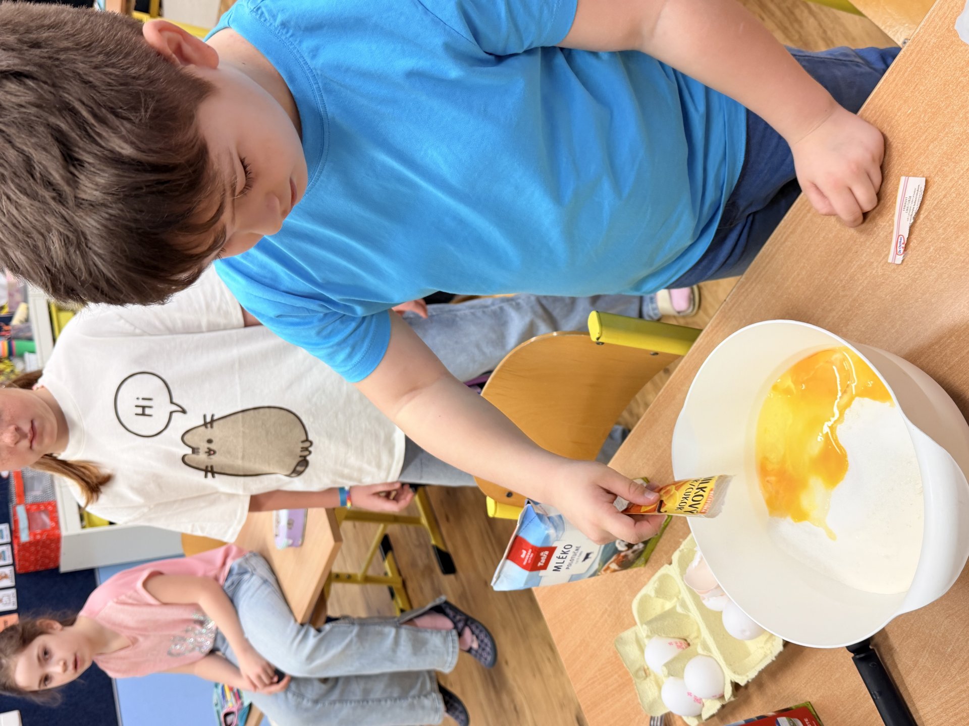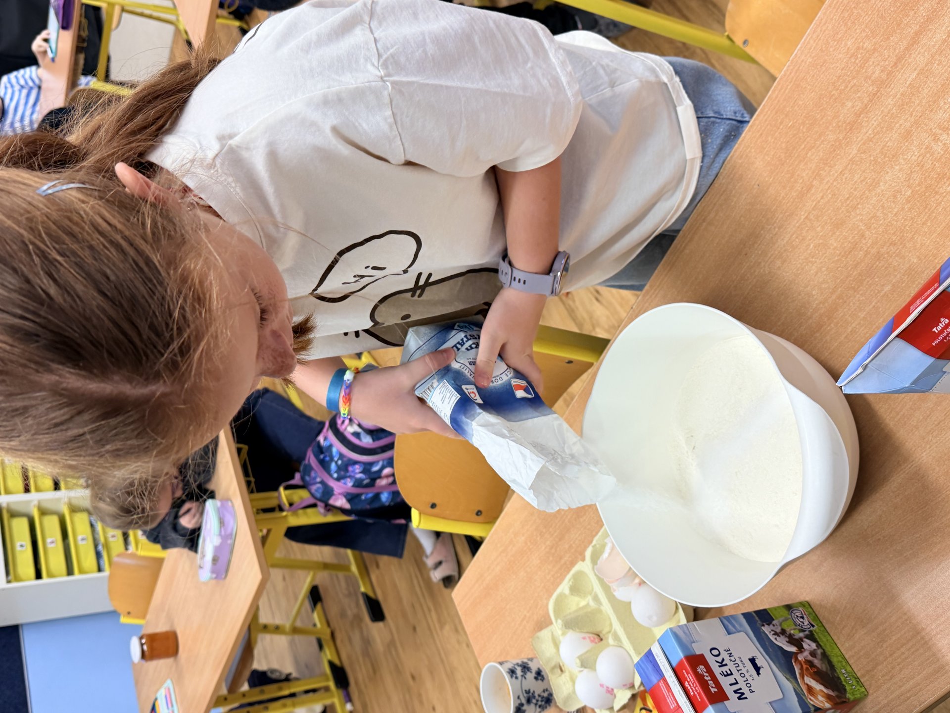 V rámci pracovní výchovy si děti vyzkoušely přípravu palačinek. Seznámily se se surovinami, postupem práce i zásadami bezpečnosti v kuchyni. Poté se s chutí pustily do míchání těsta a smažení.