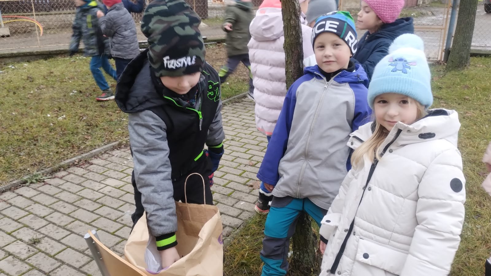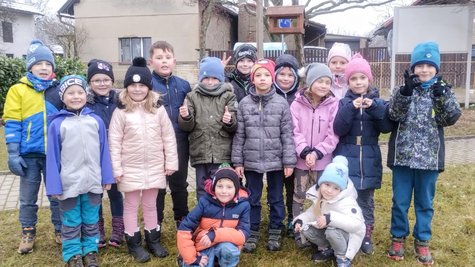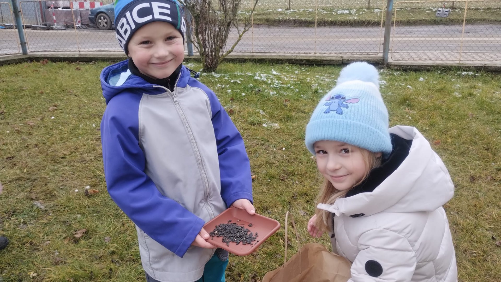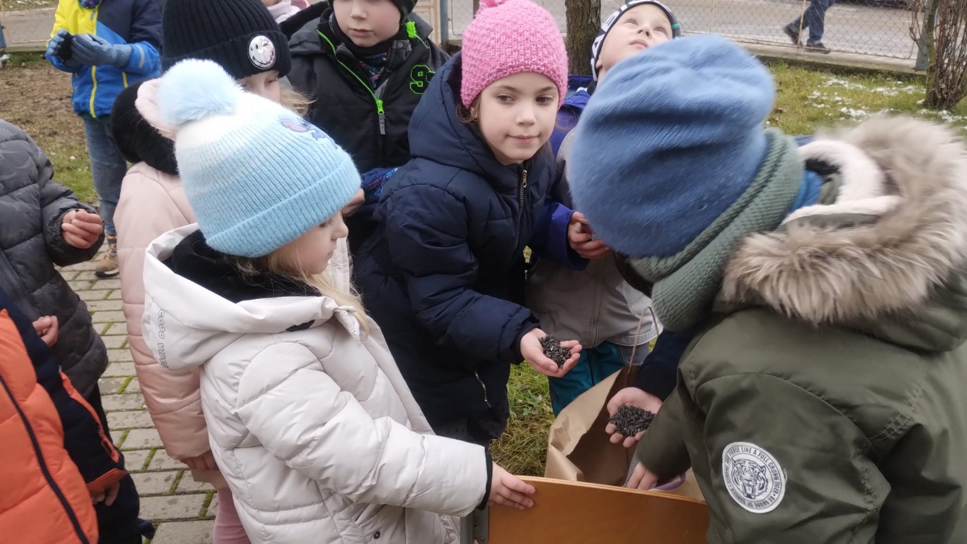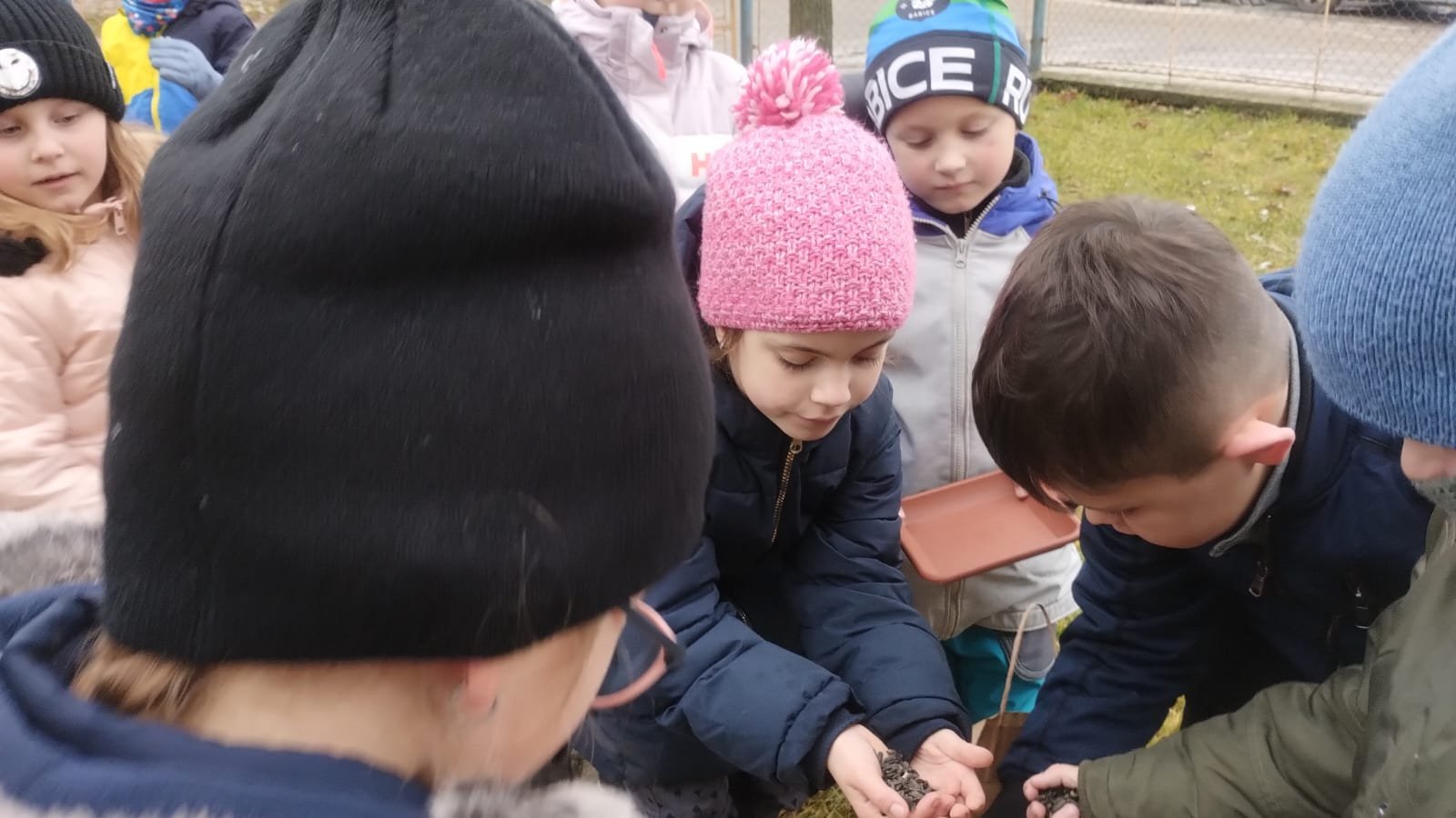 Na naší předzahrádce u školy jsme společně zavěsili krmítko a do něj nasypali slunečnici.