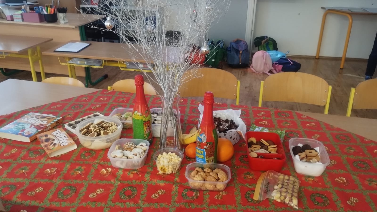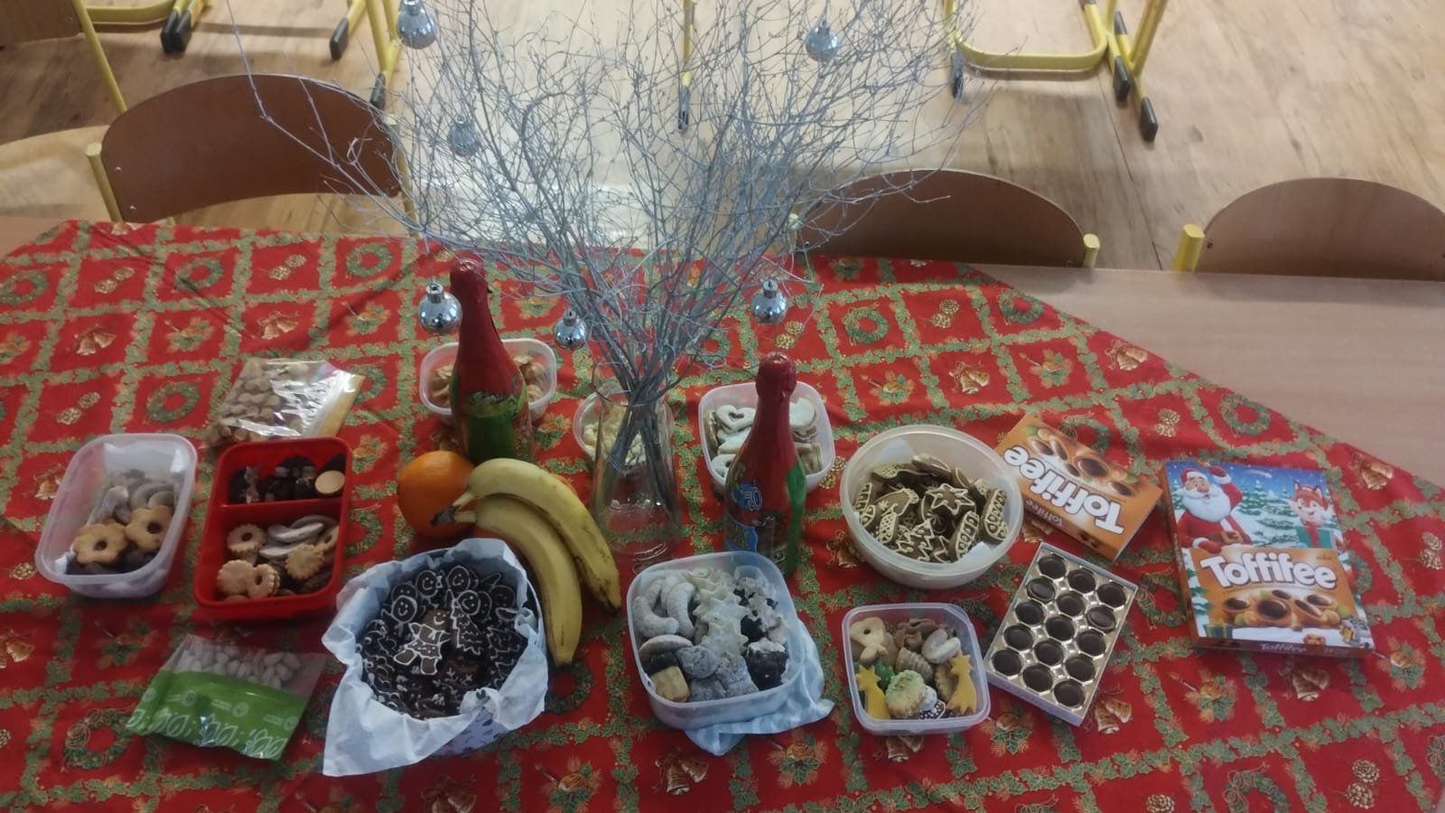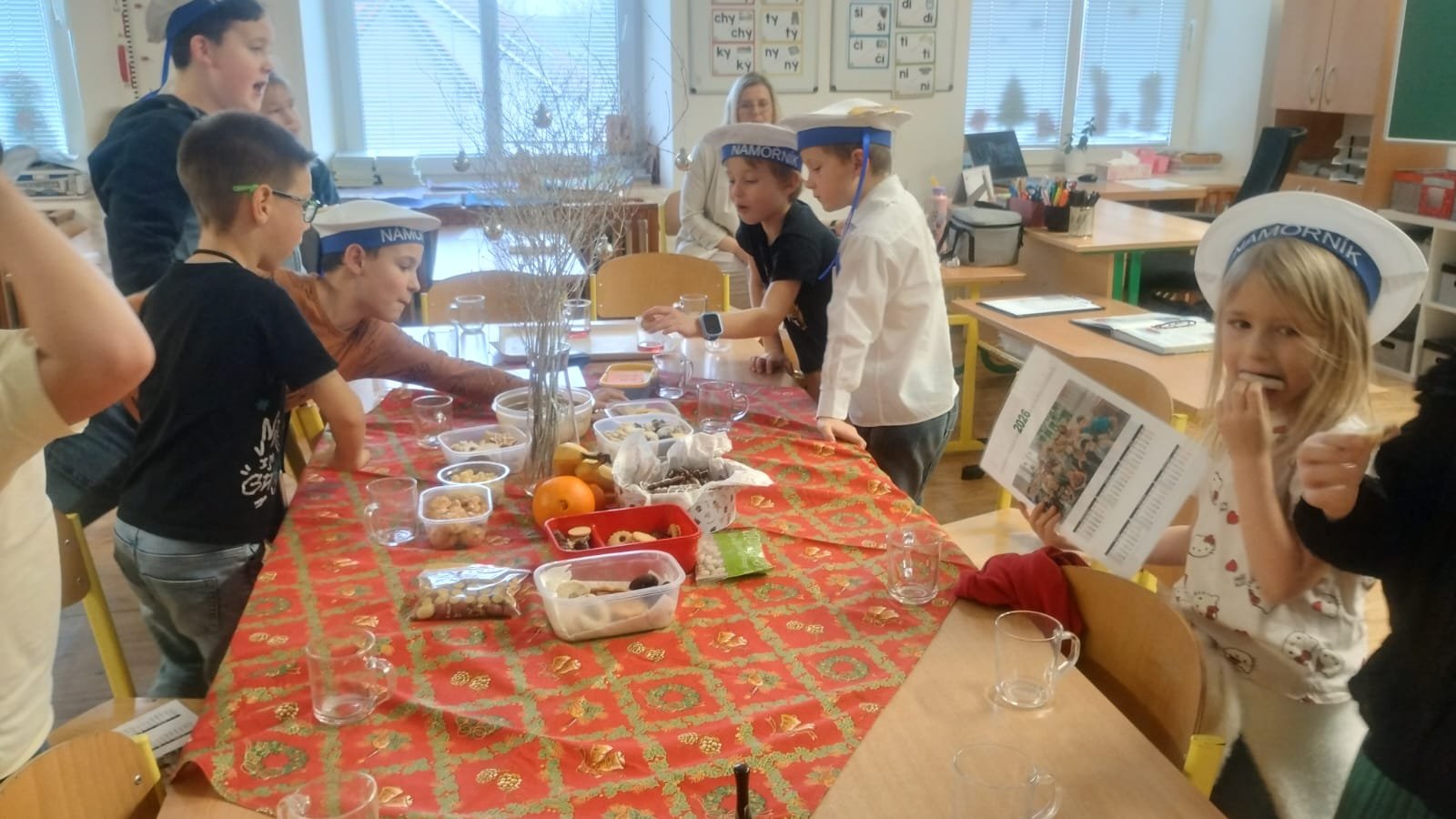 Na stole jsme měli připravenou slavnostní tabuli. Díky rodičům jsme měli vánoční cukroví a občerstvení. Z peněz vydělaných na jarmarku jsme si zakoupili dětské šampaňské, abychom si připili na vánoční svátky a rok 2026 a také naše vytoužené námořnické čepice.