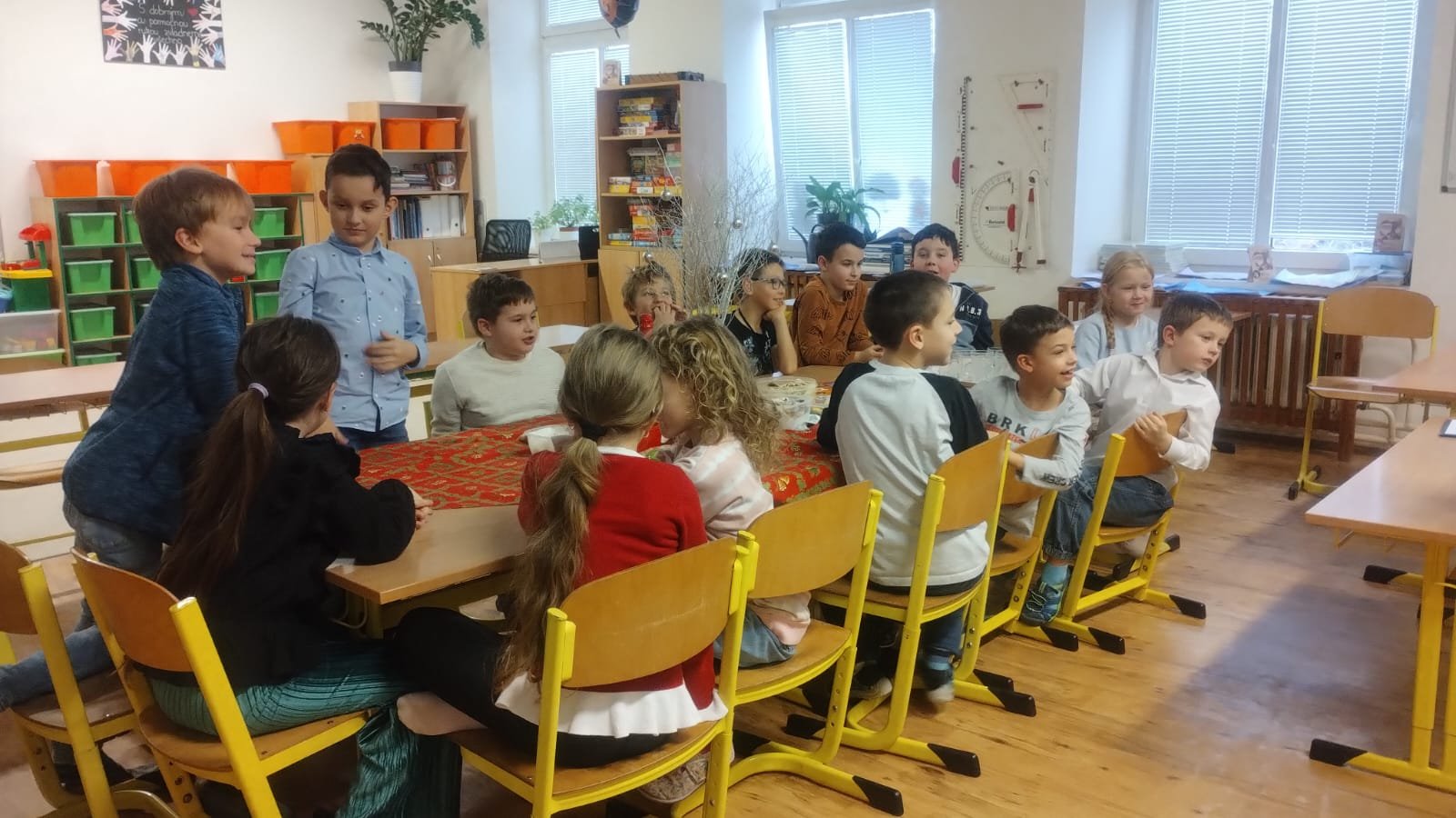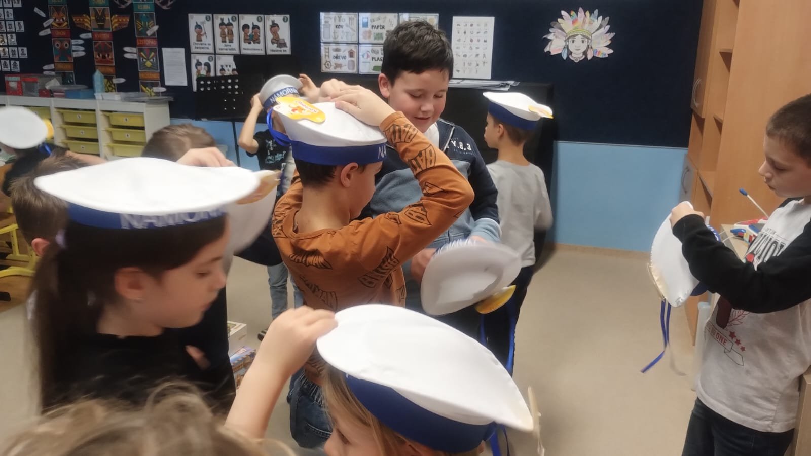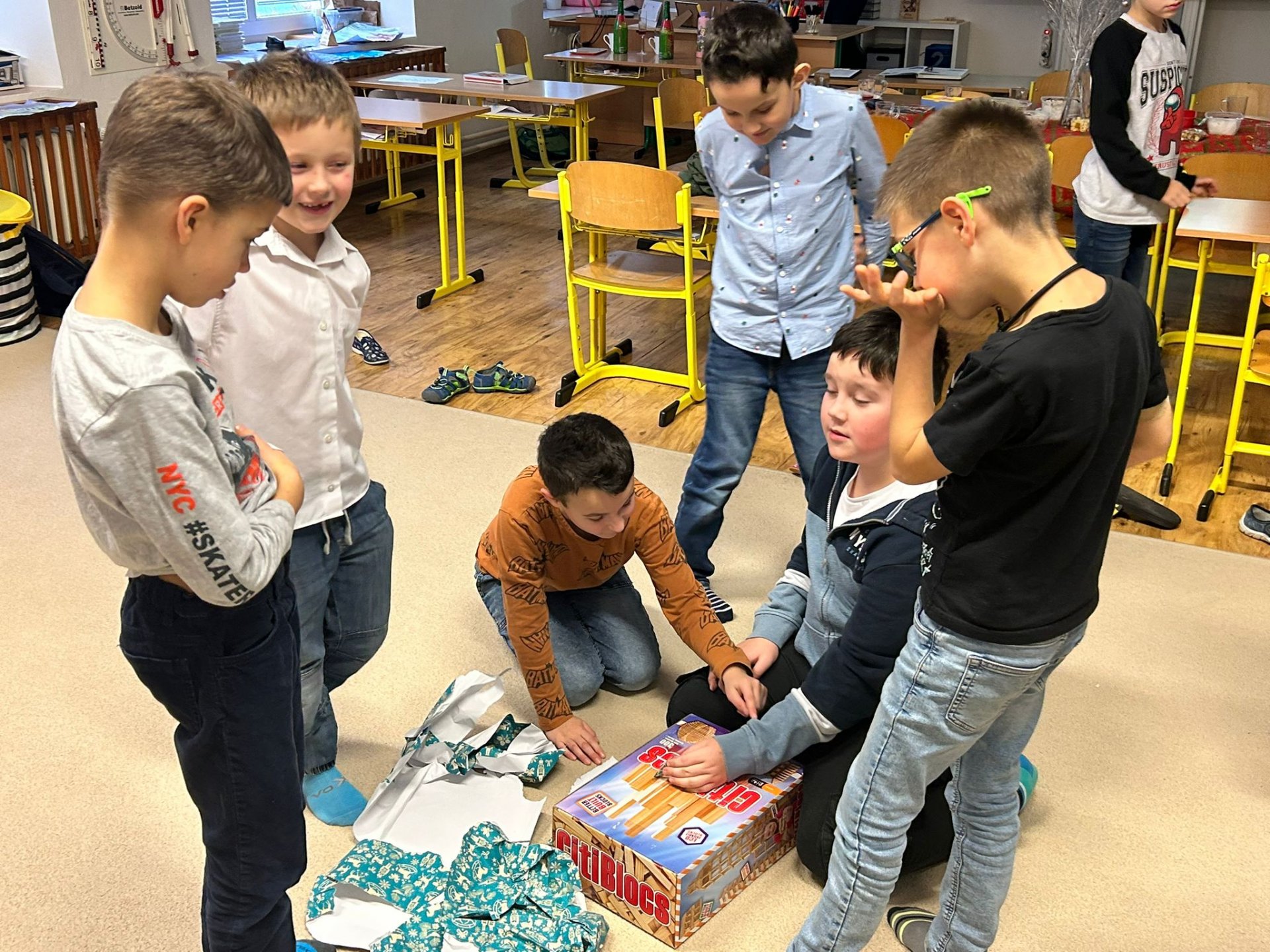 Na stole jsme měli připravenou slavnostní tabuli. Díky rodičům jsme měli vánoční cukroví a občerstvení. Z peněz vydělaných na jarmarku jsme si zakoupili dětské šampaňské, abychom si připili na vánoční svátky a rok 2026 a také naše vytoužené námořnické čepice.