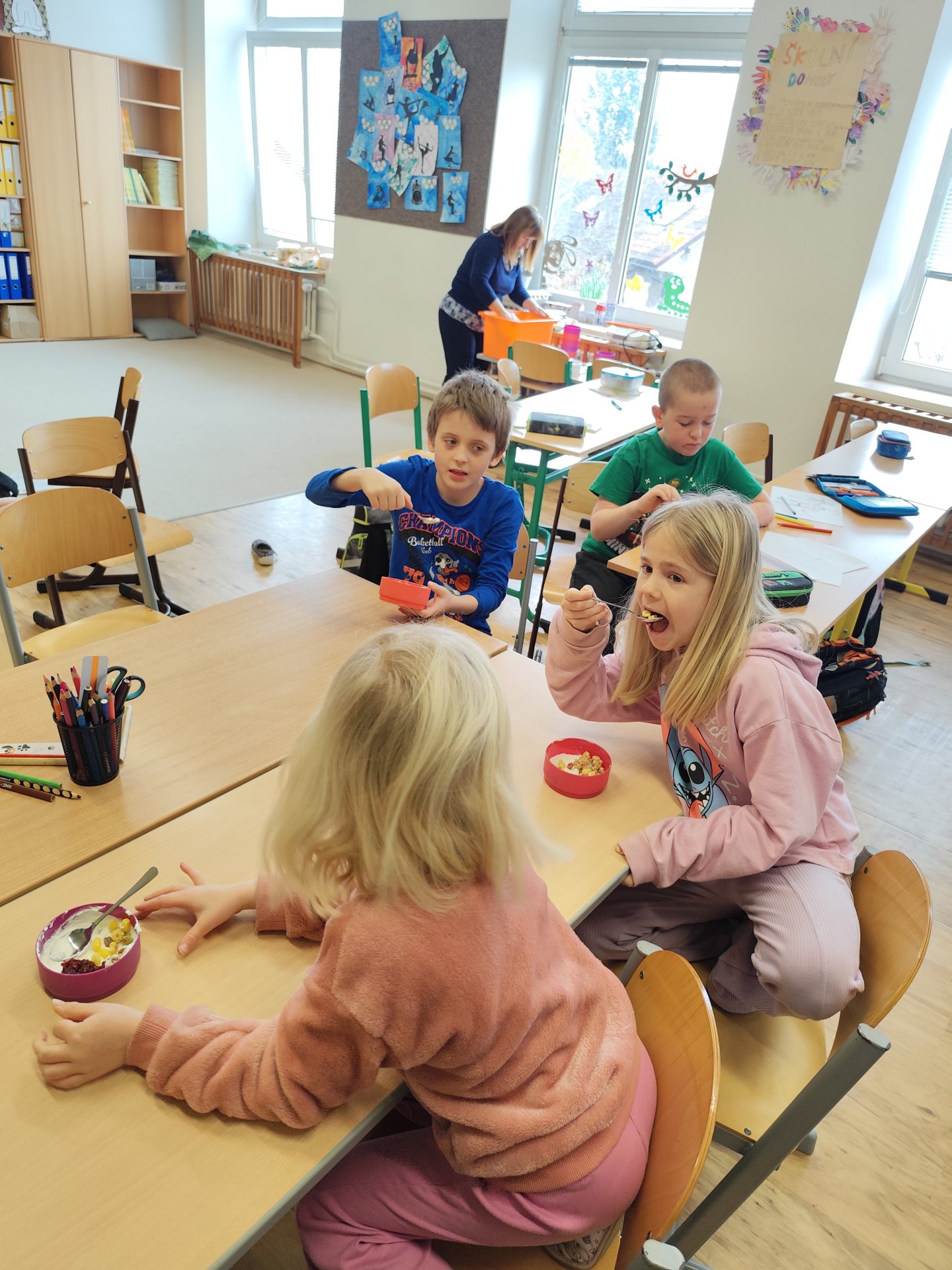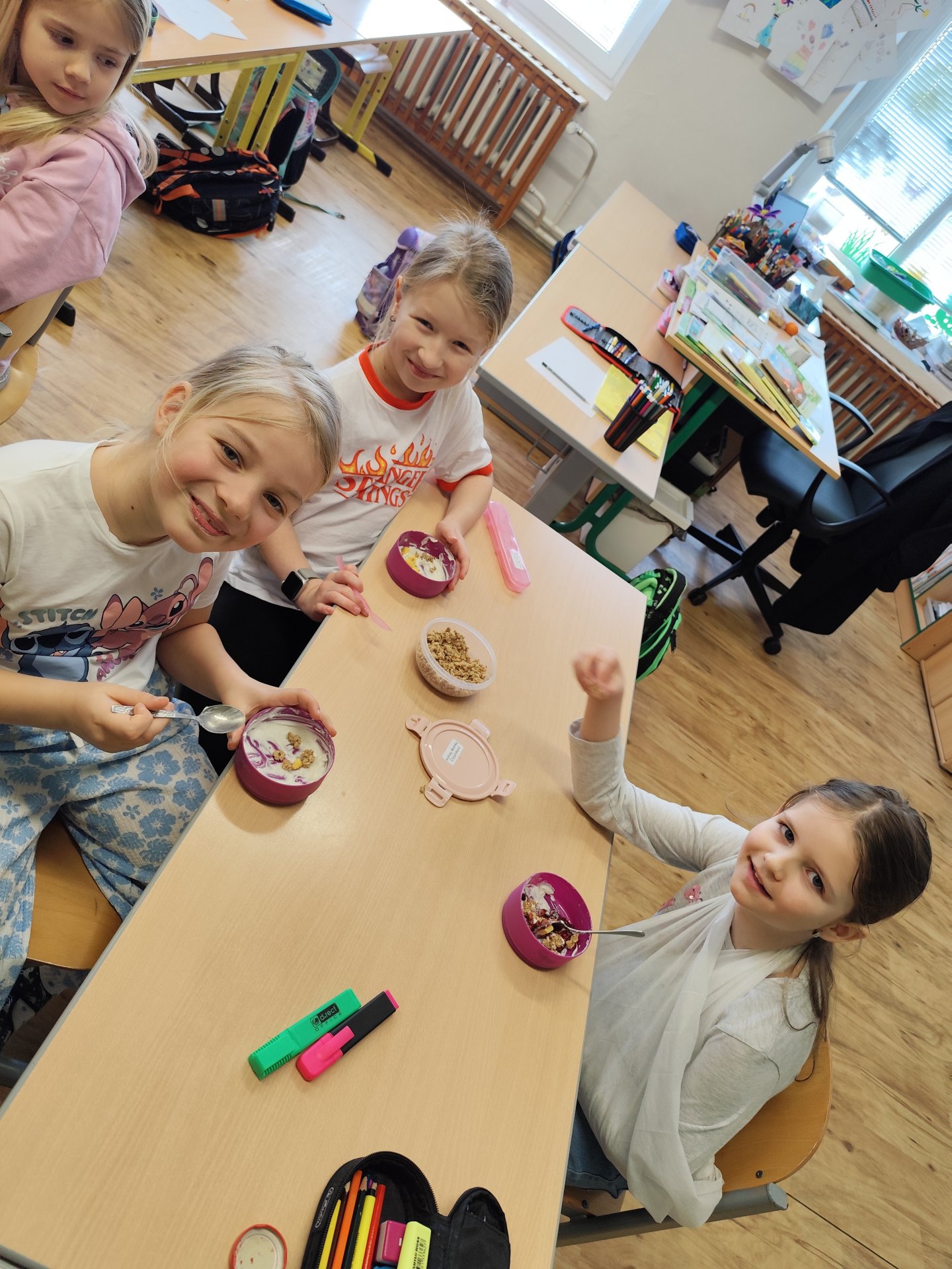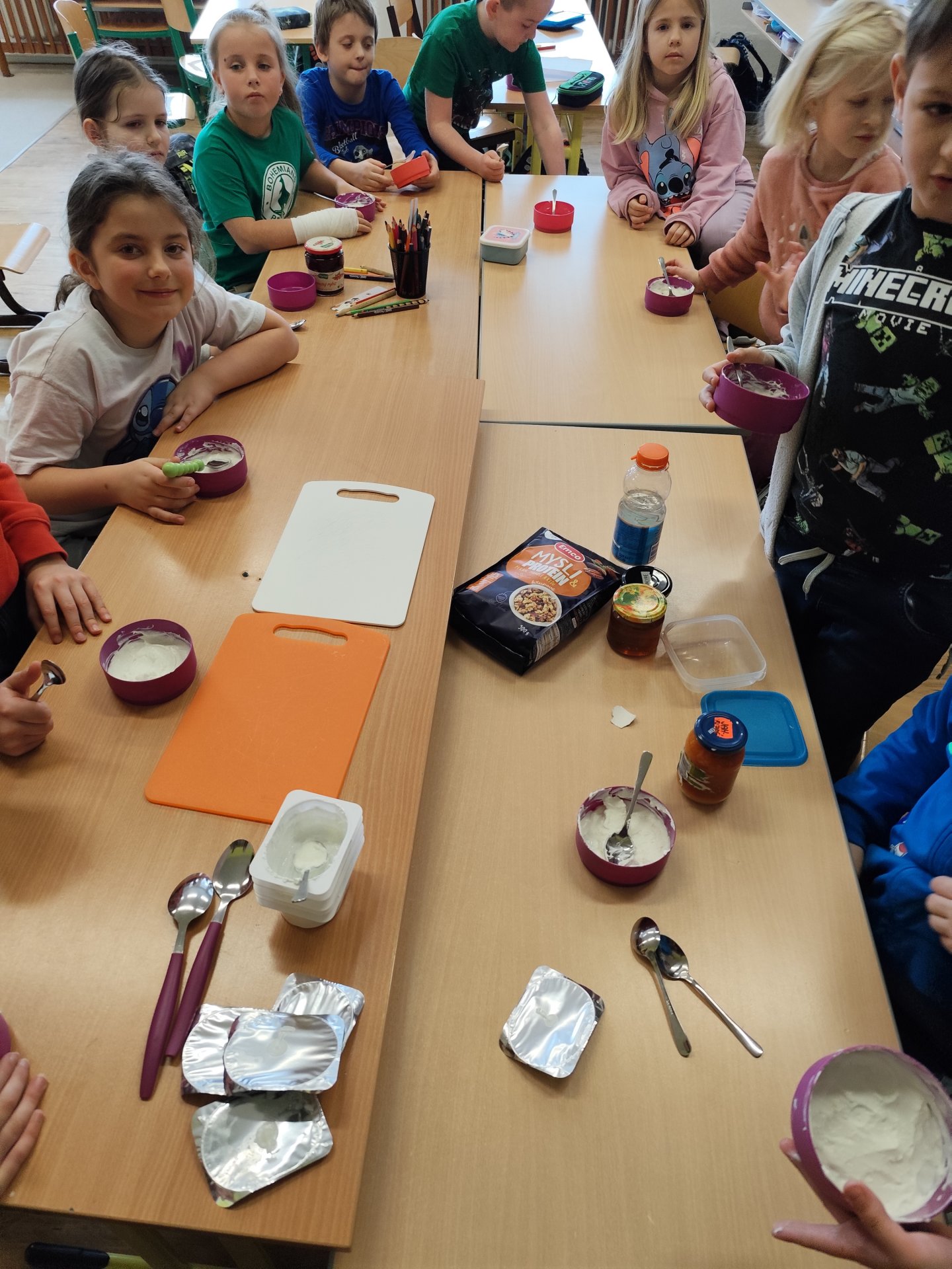 Začali jsme bílými jogurty. Protože víme, že ne každý je má rád samotné, pustili jsme se do vymýšlení, jak je vylepšit. Děti si mohly vybrat z různých dobrot – přidávali jsme müsli, rybízovou, třešňovou i meruňkovou marmeládu a nechyběl ani domácí med. Každý si vytvořil svou vlastní kombinaci podle chuti.