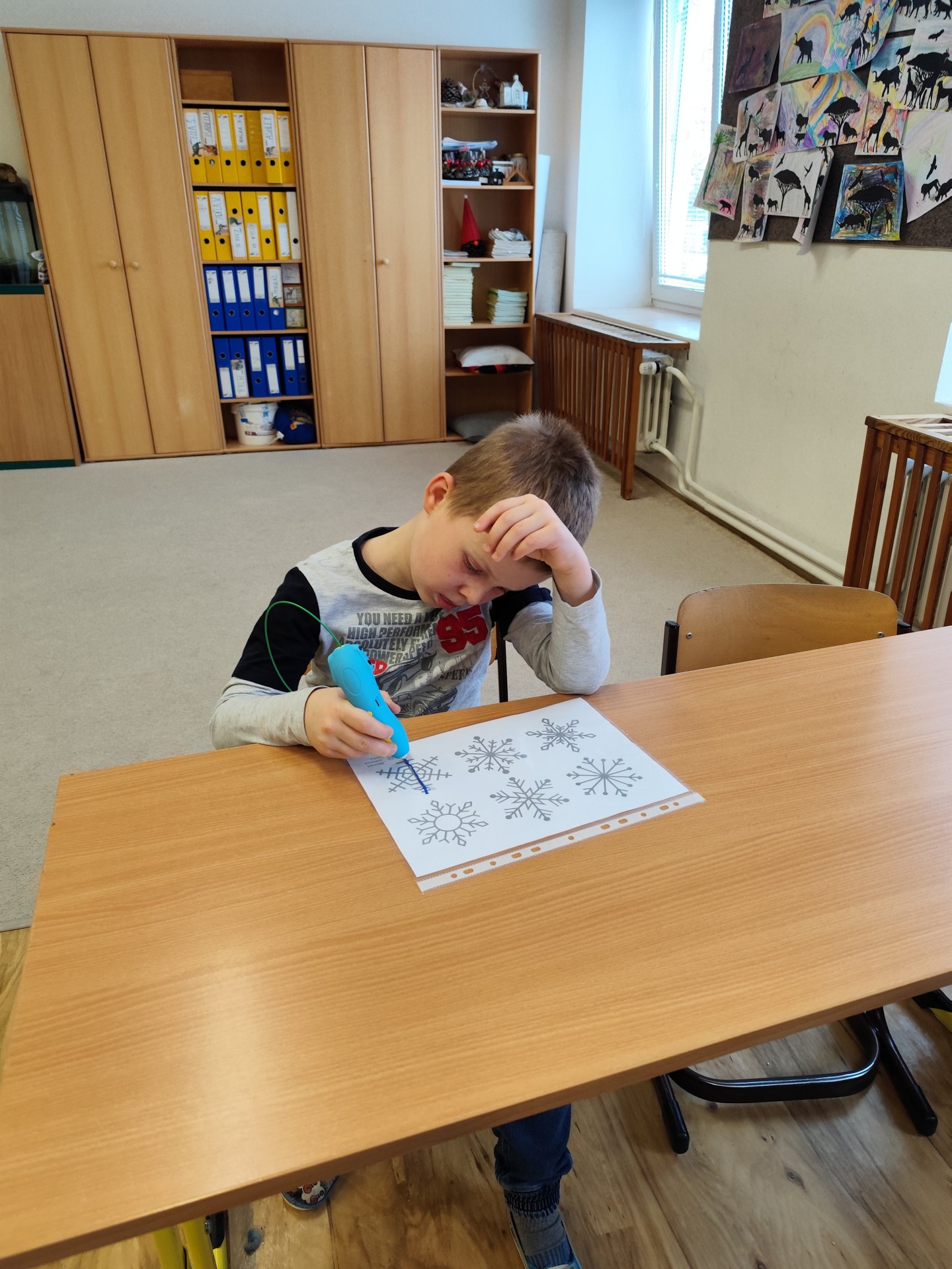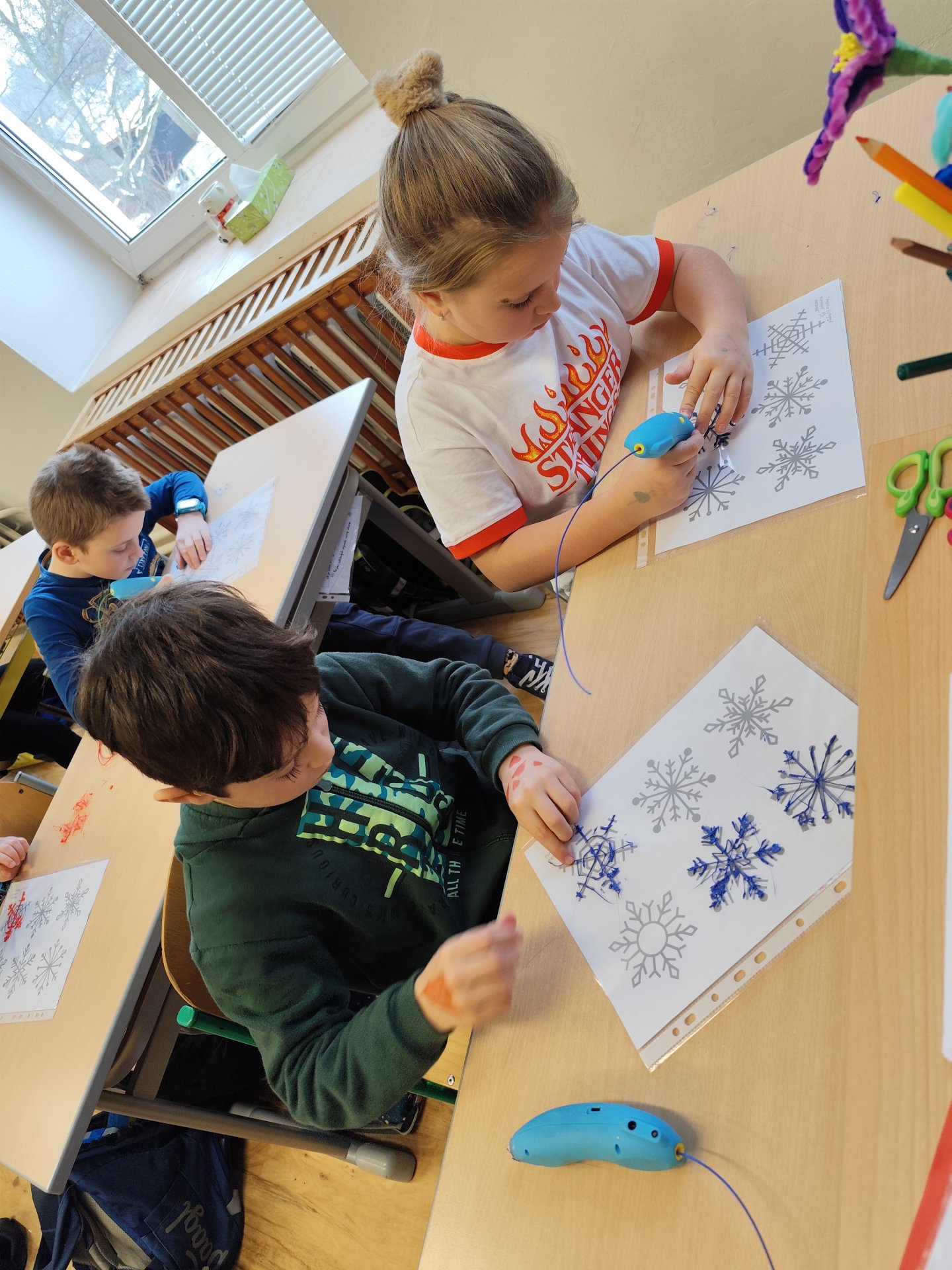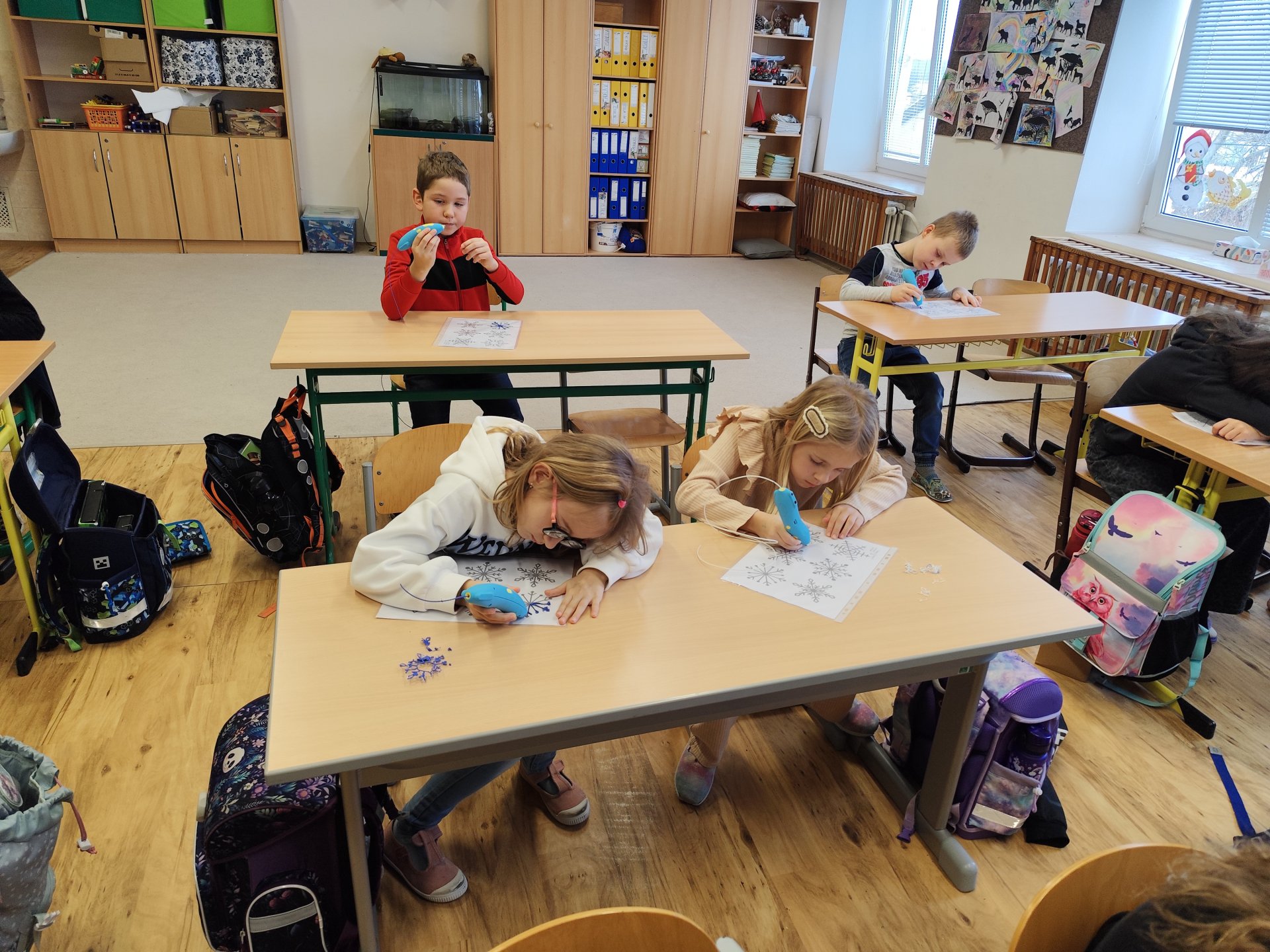 Naším prvním úkolem byla výroba vloček. Děti pracovaly s velkou pečlivostí, rozvíjely svou fantazii, jemnou motoriku i trpělivost. Každá vločka byla originální a jedinečná, stejně jako její autor.