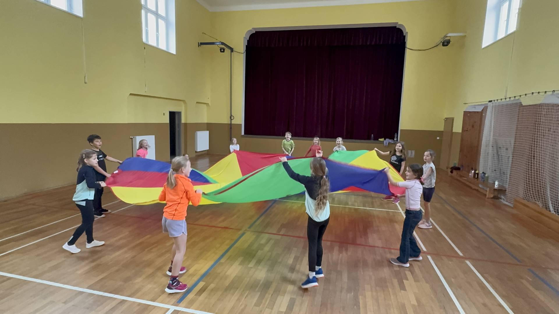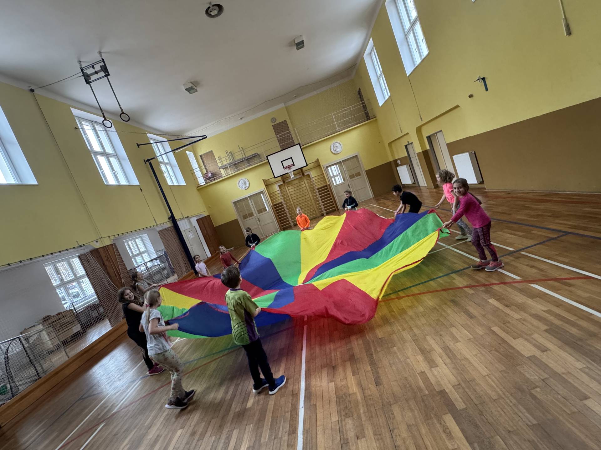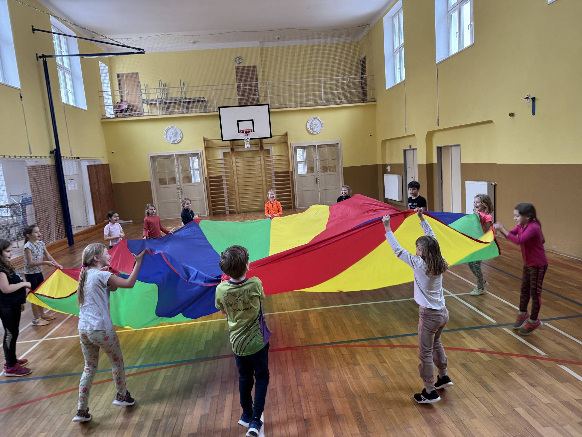 .... jestě je zima a tak stále jezdíme do tělocvičny ... a tady jsme moc rádi... A máme rádi i různé pomůcky... jako třeba dnes: hry s padákem...