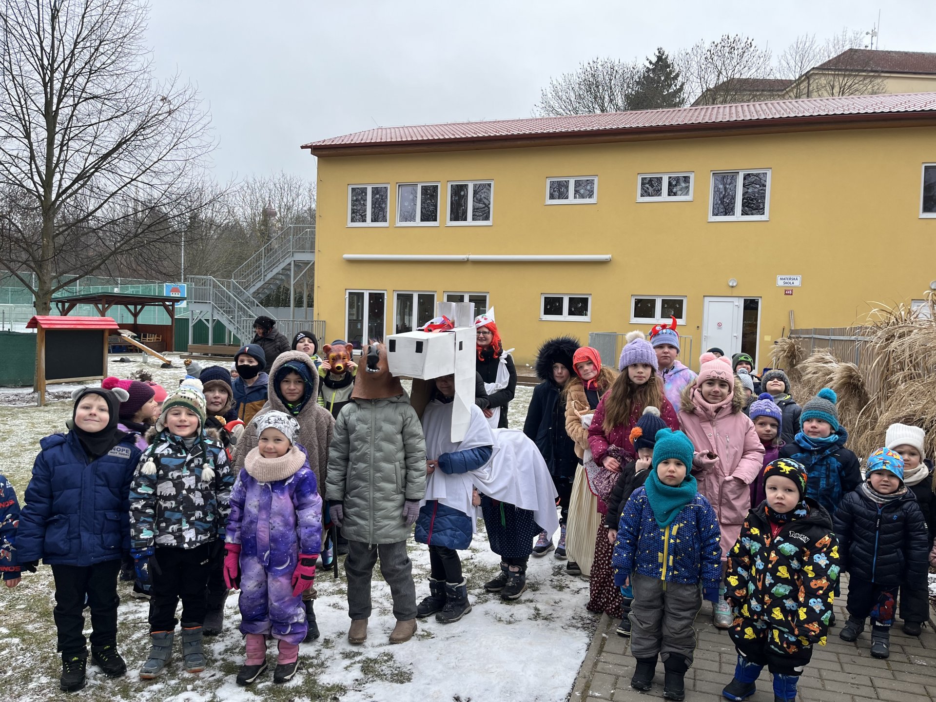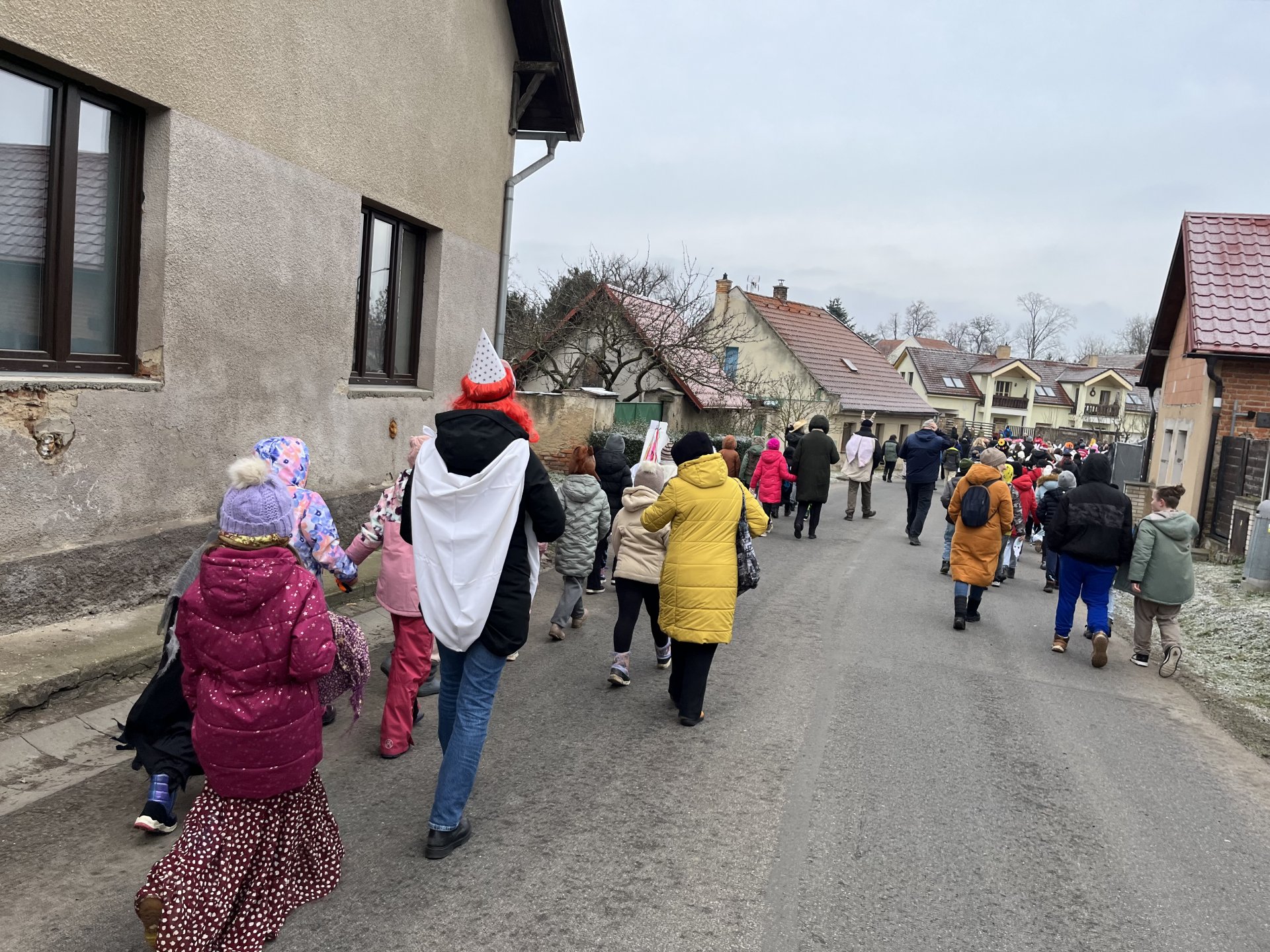 Poté jsme se vydali na náš slavnostní průvod po okolí Škvorce. Děti si zpívaly písničky a rozdávaly úsměvy všem kolemjdoucím. Naši první zastávkou byla společnost TOPAS, kde nás velmi mile přivítali. Děti zazpívaly krátkou písničku a poděkovaly za vřelé přijetí. Další kroky vedly na místní úřad, kde jsme potěšili zaměstnance dobrotami.