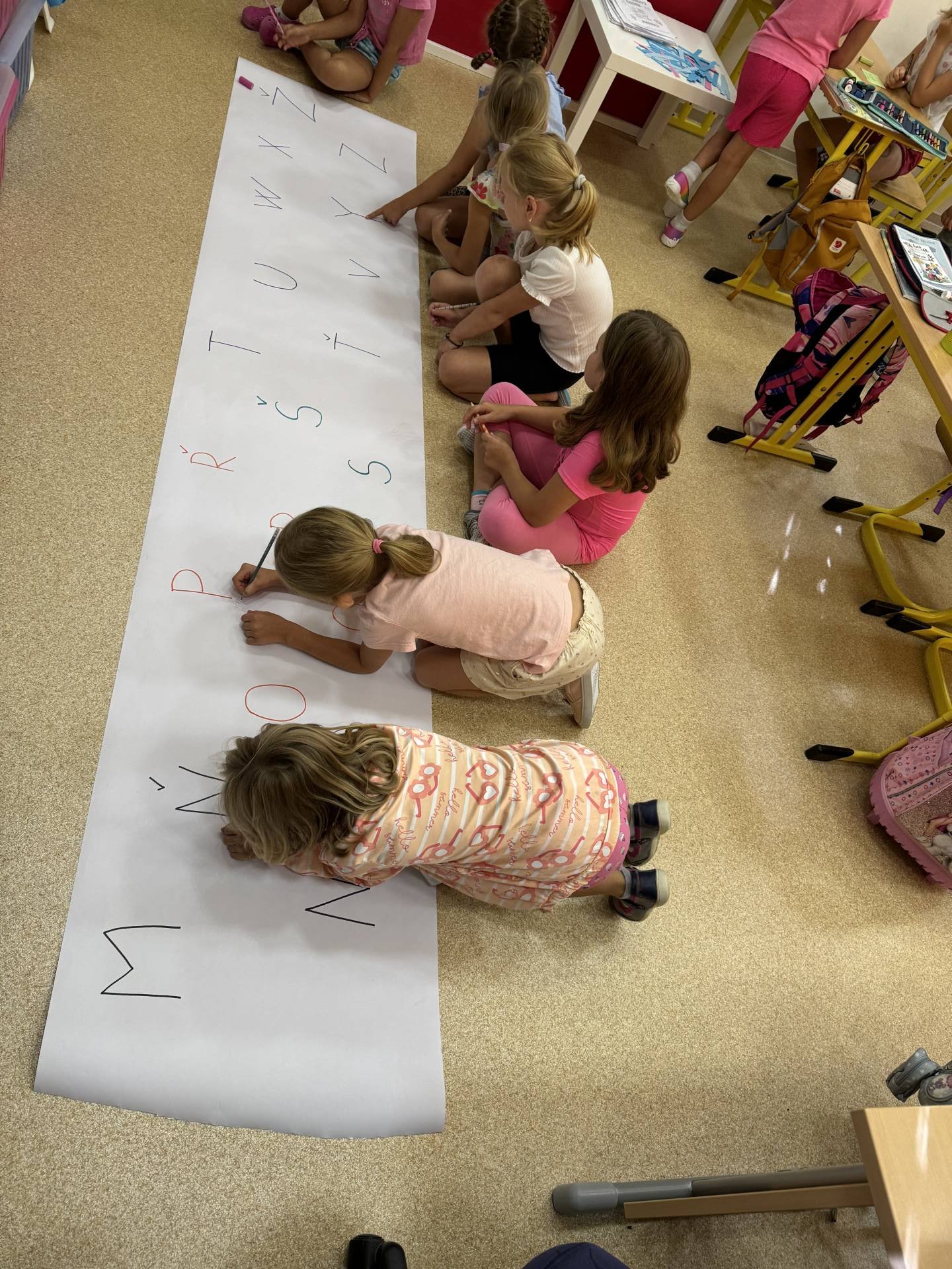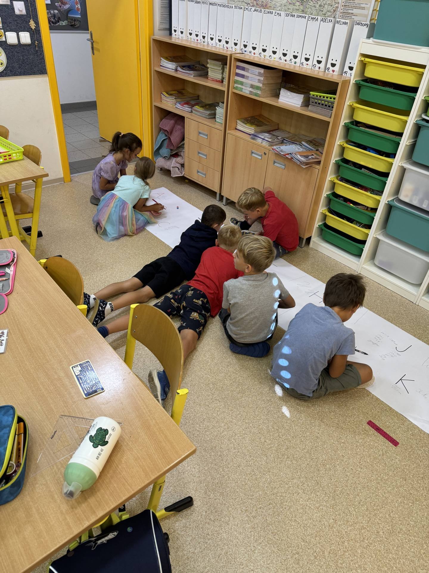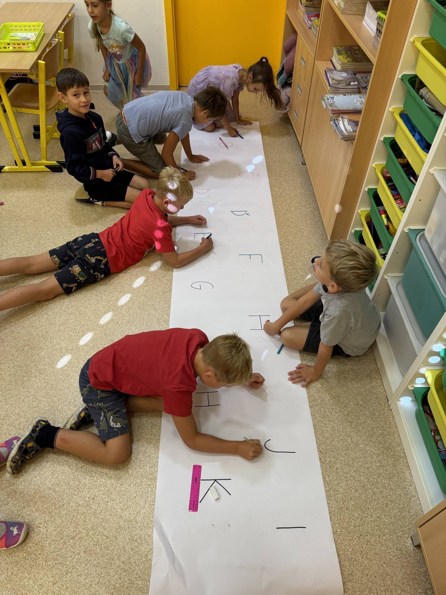 Do projektu Řetězení patří i pravidla třídy. Ano, lezeme i po zemi a přitom se i učíme. Třeba opakování tvarů psacího písma. Učení nás baví.