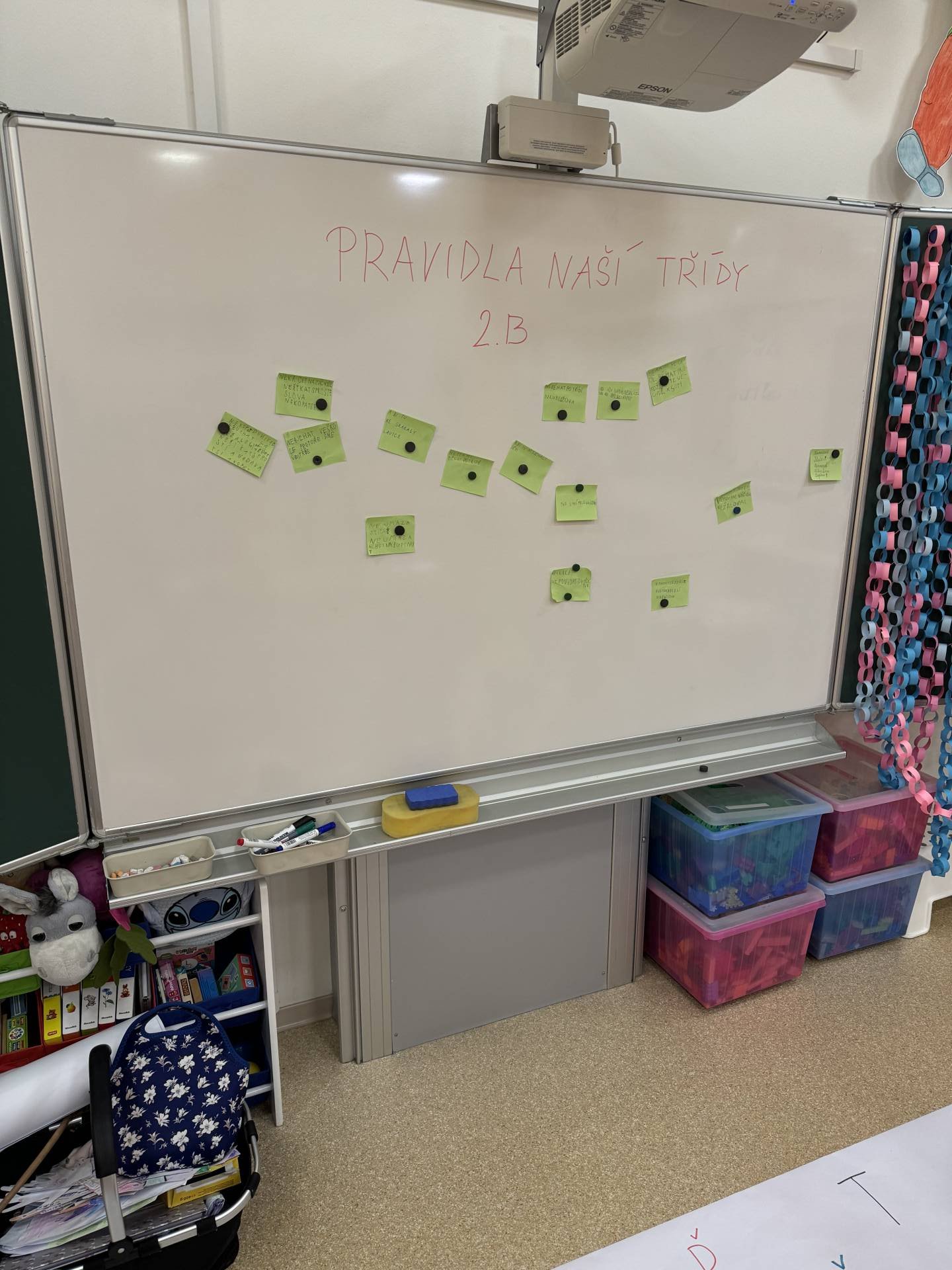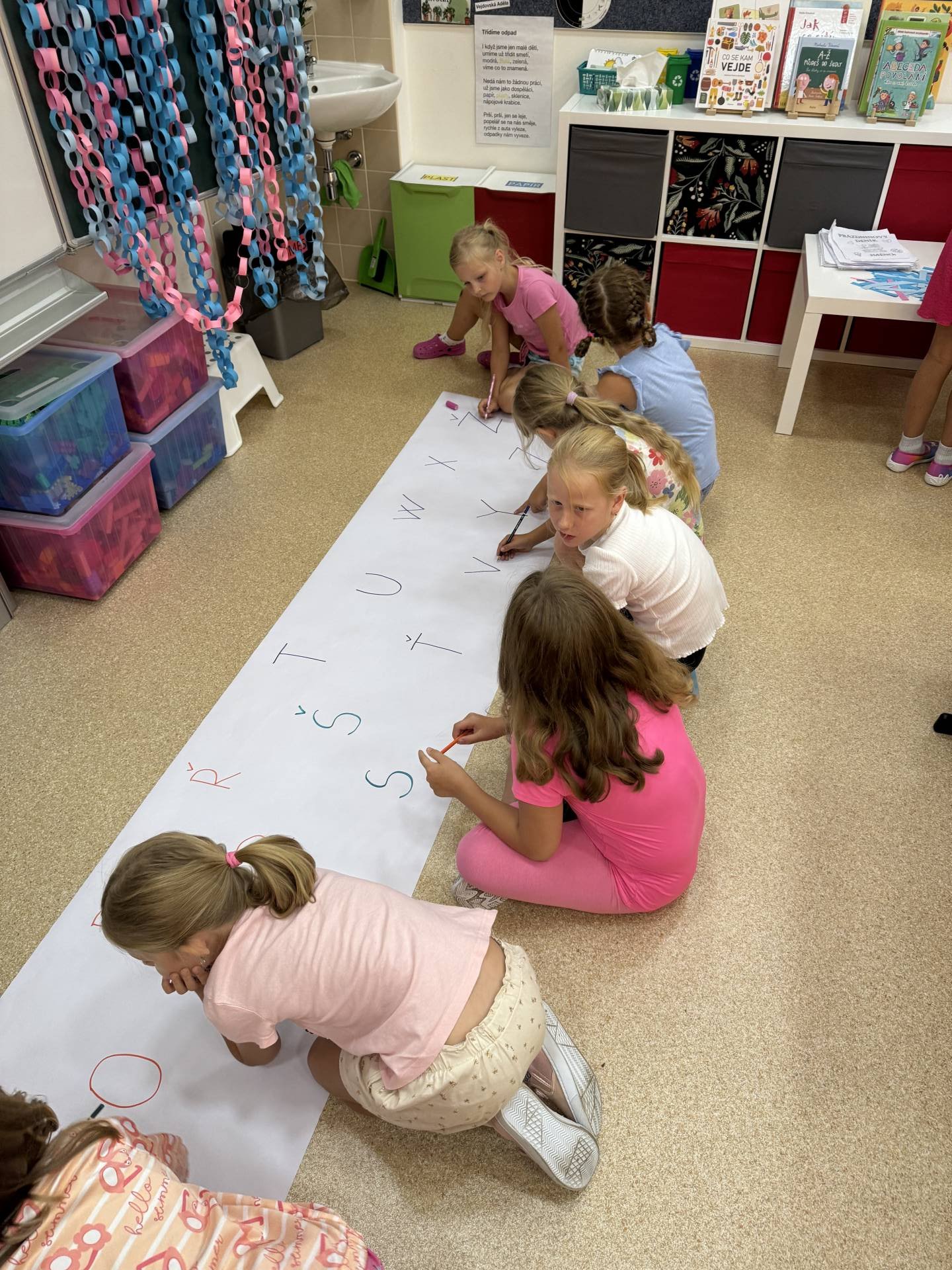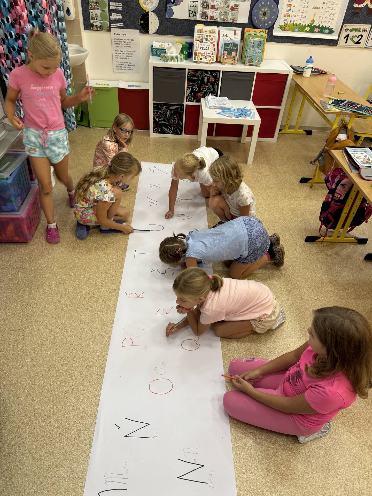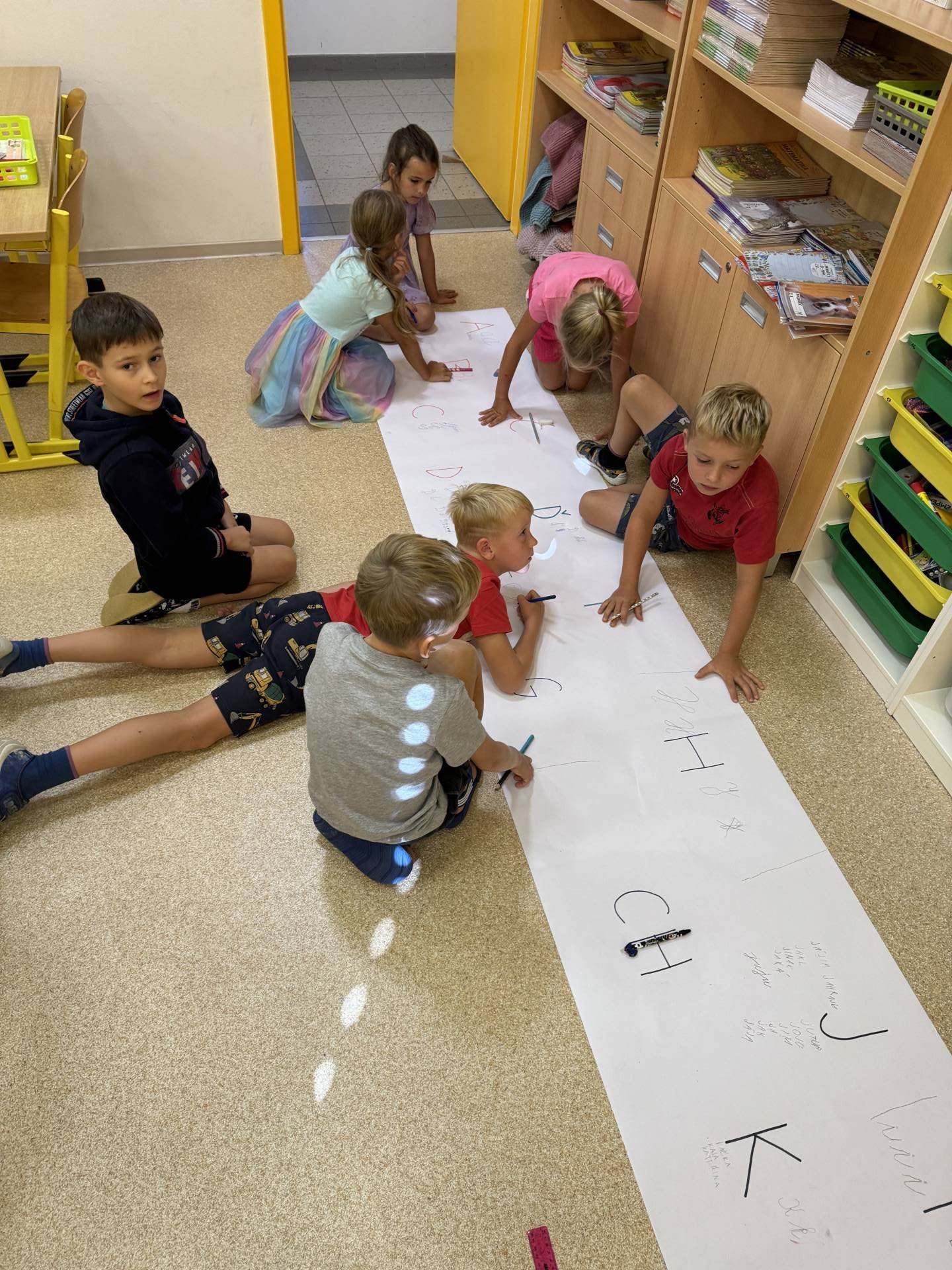 Do projektu Řetězení patří i pravidla třídy. Ano, lezeme i po zemi a přitom se i učíme. Třeba opakování tvarů psacího písma. Učení nás baví.