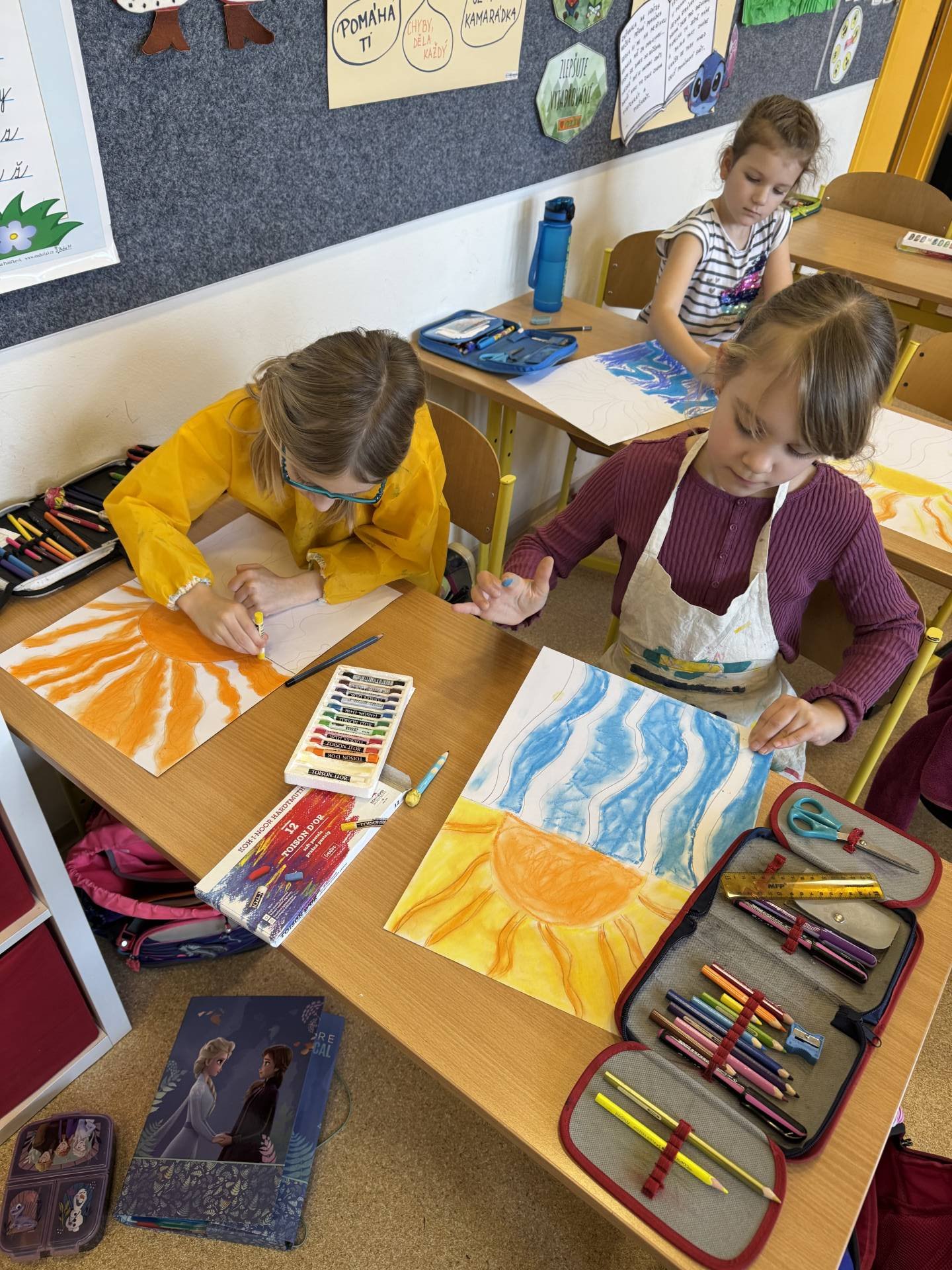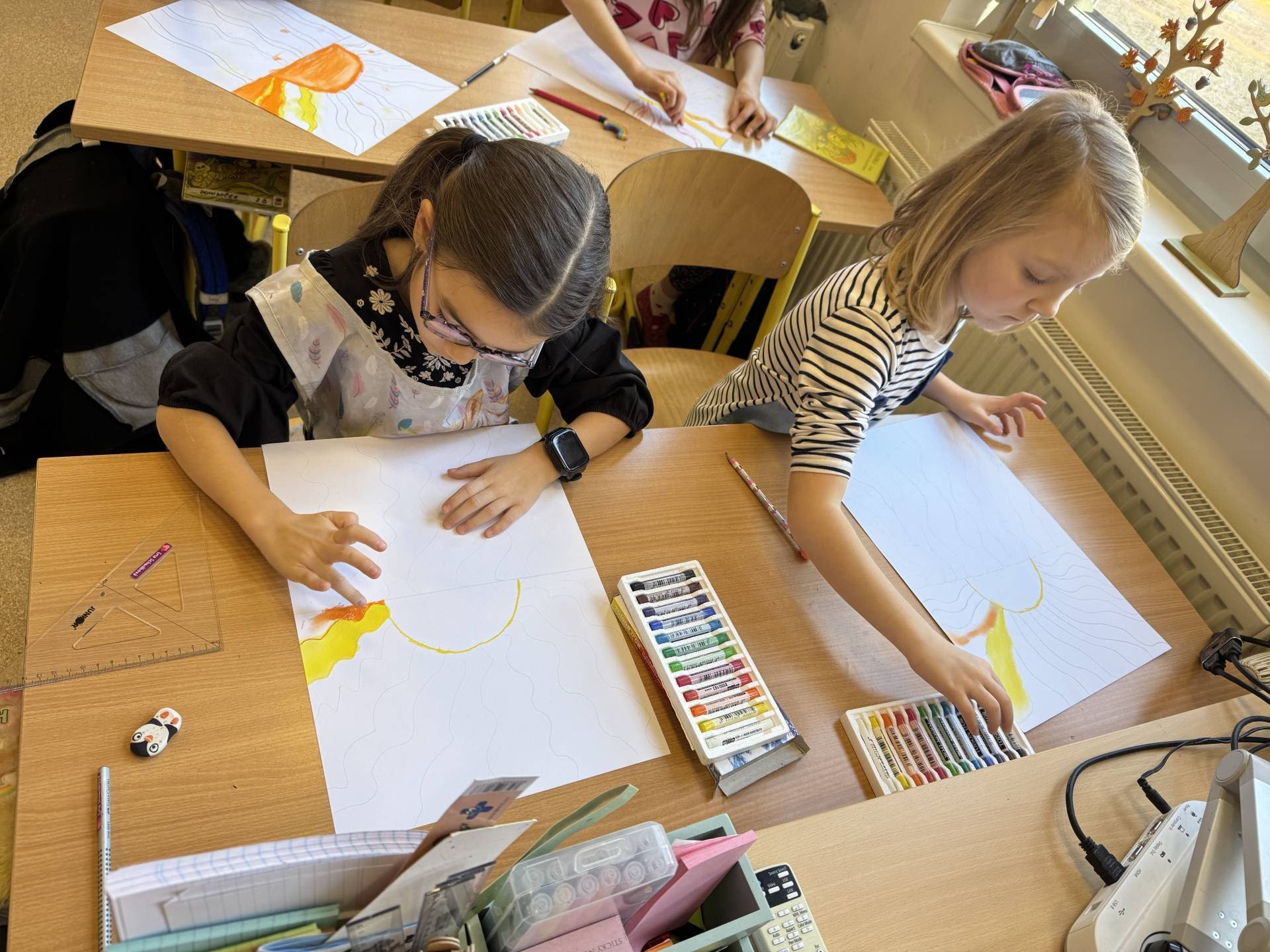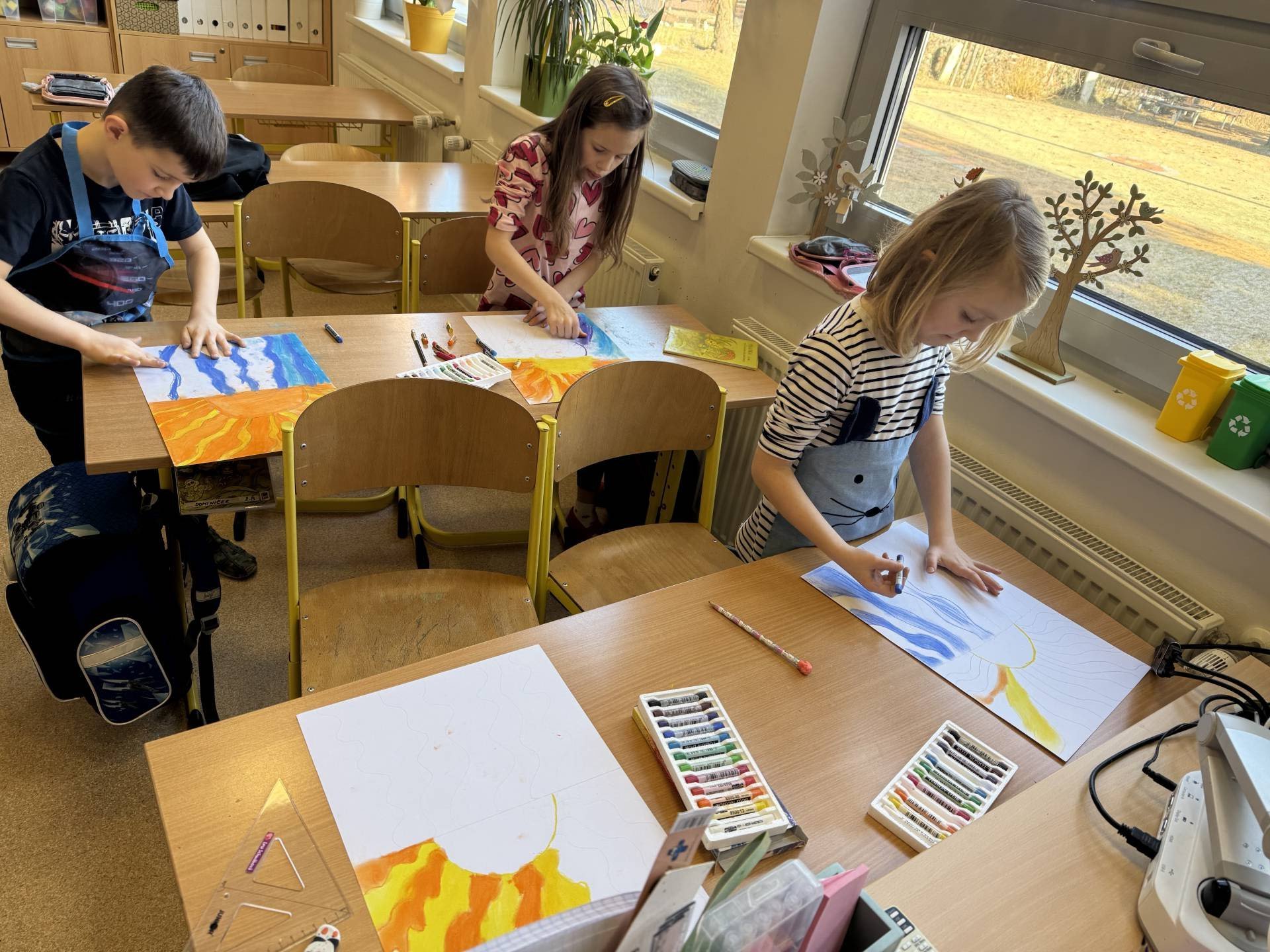 V hodinách výtvarné výchovy zkoušíme různé metody kreslení. A tuto jsme si obzvláště užili. Suché pastely nás prostě baví.
