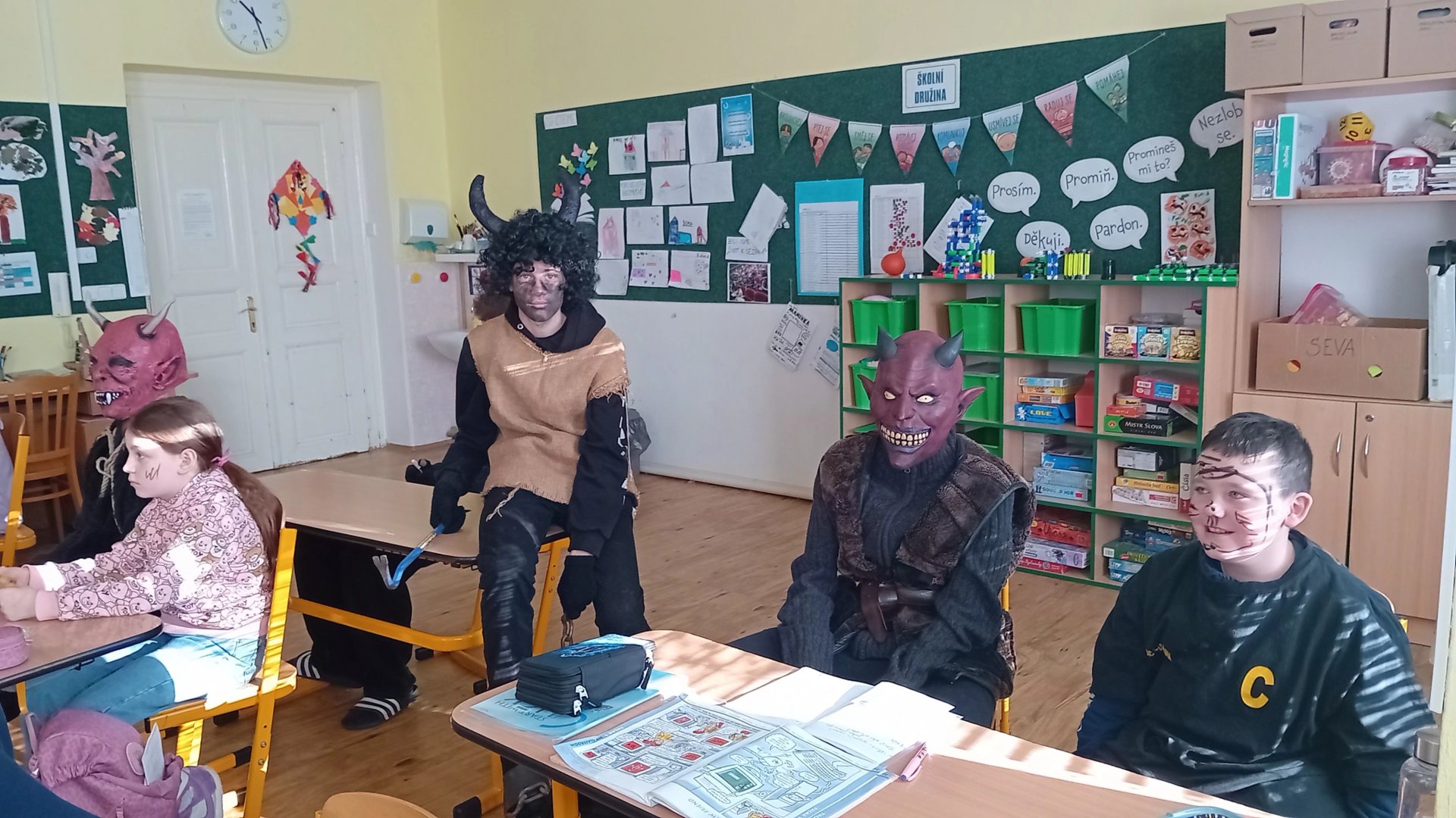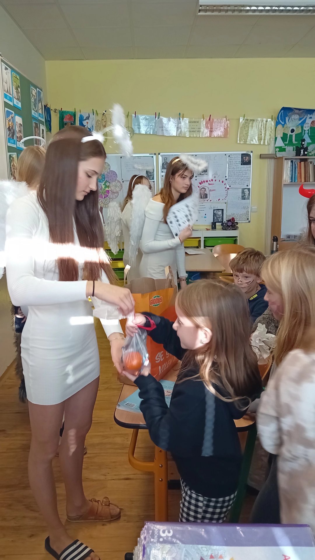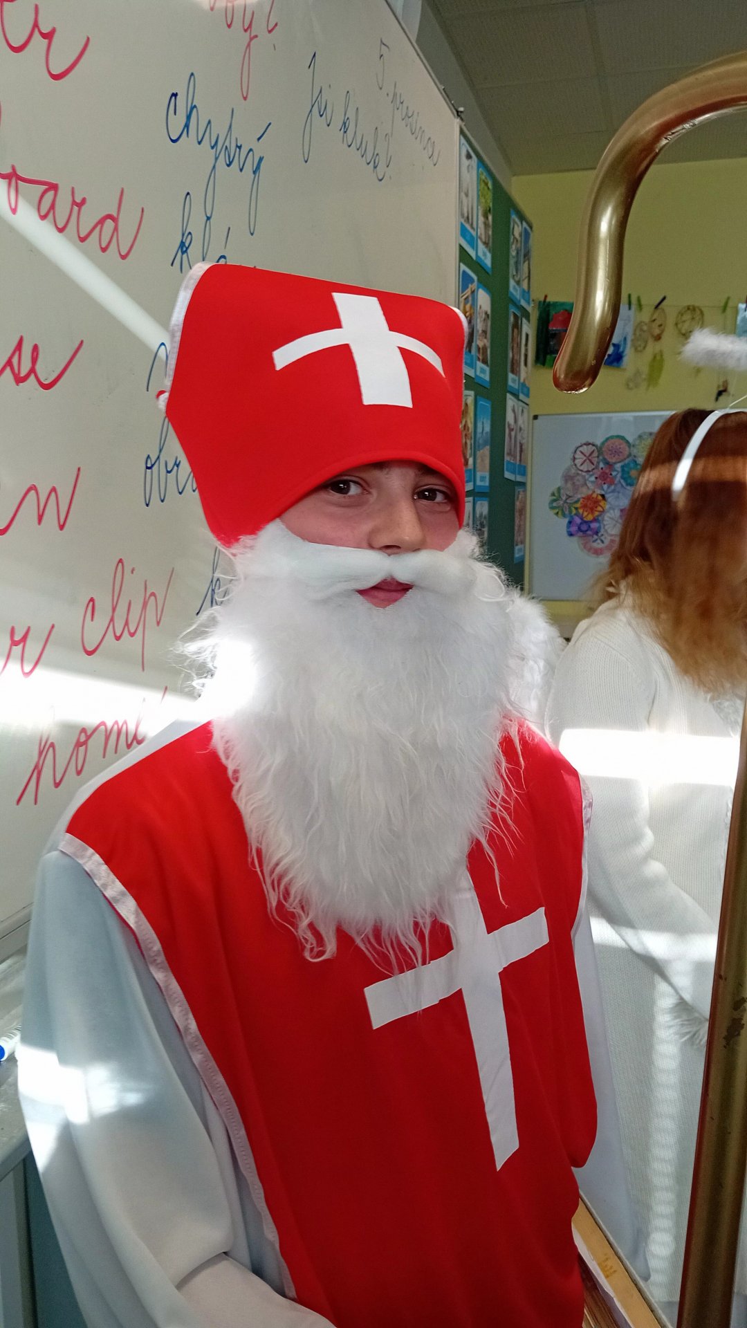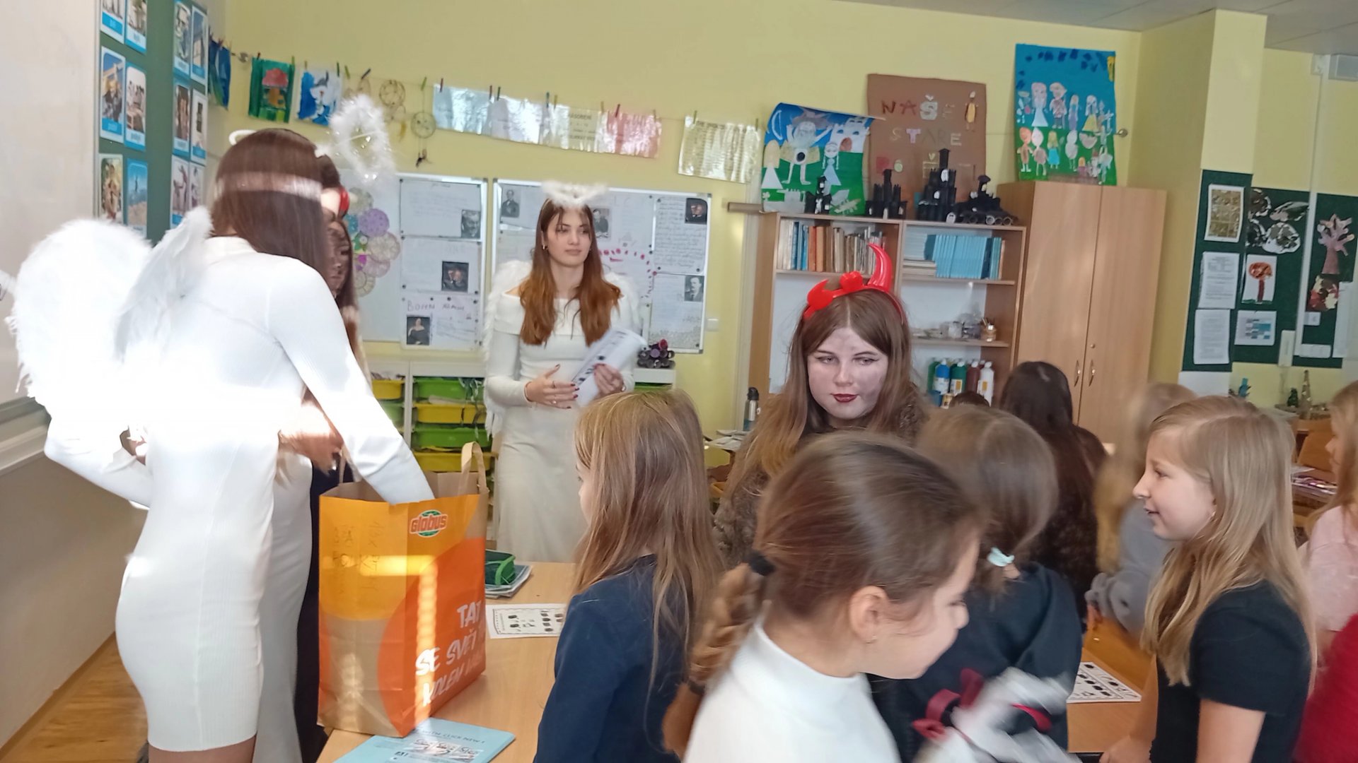 Ve čtvrtek 5. prosince k nám do školy přišel Mikuláš. Celé dopoledne se po chodbách ozývalo chřestění řetězů a cinkání, což nás udržovalo v permanentním napjatém očekávání. Když Mikuláš konečně s celým procesím andělů a čerty dorazil, bylo to úlevné! Velký dík patří paní Piknerové, která nachystala mikulášskou nadílku pro celou třídu.