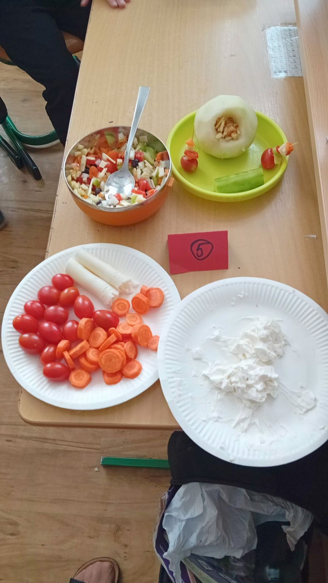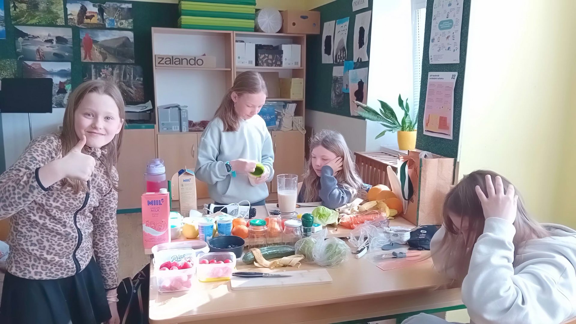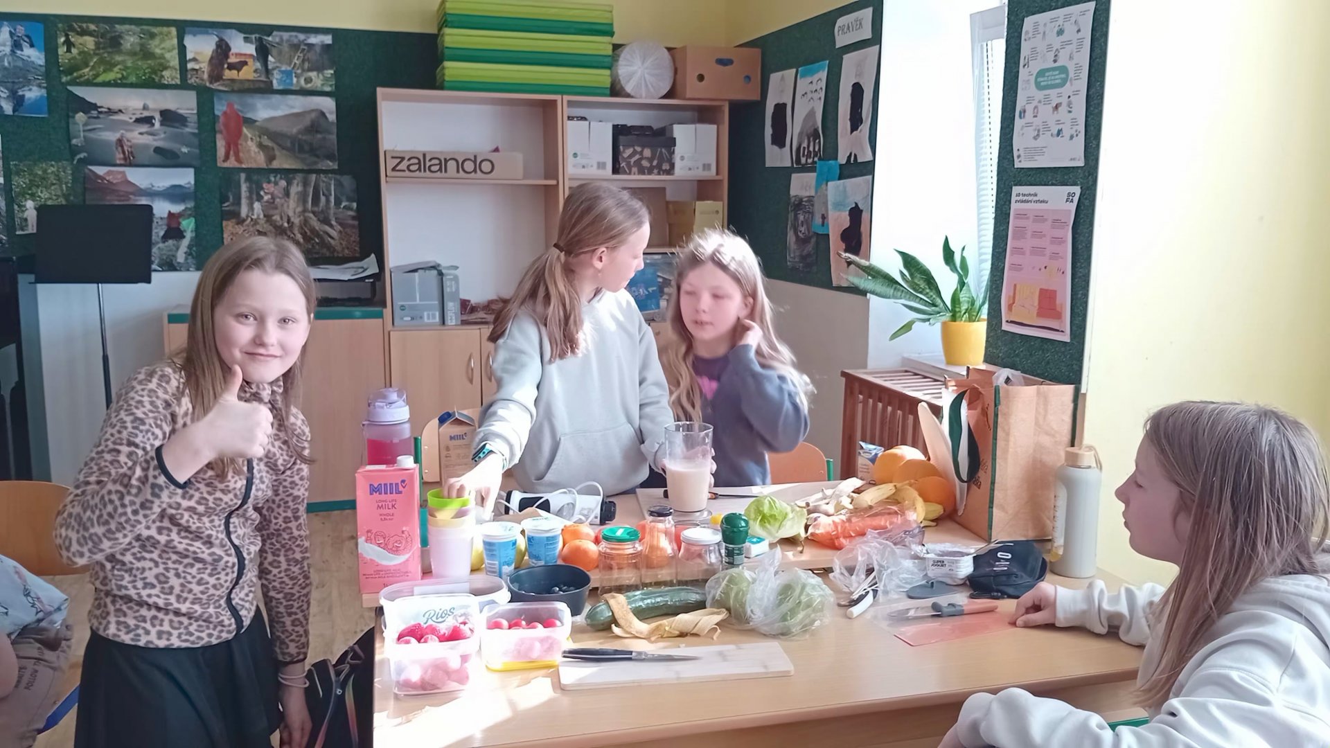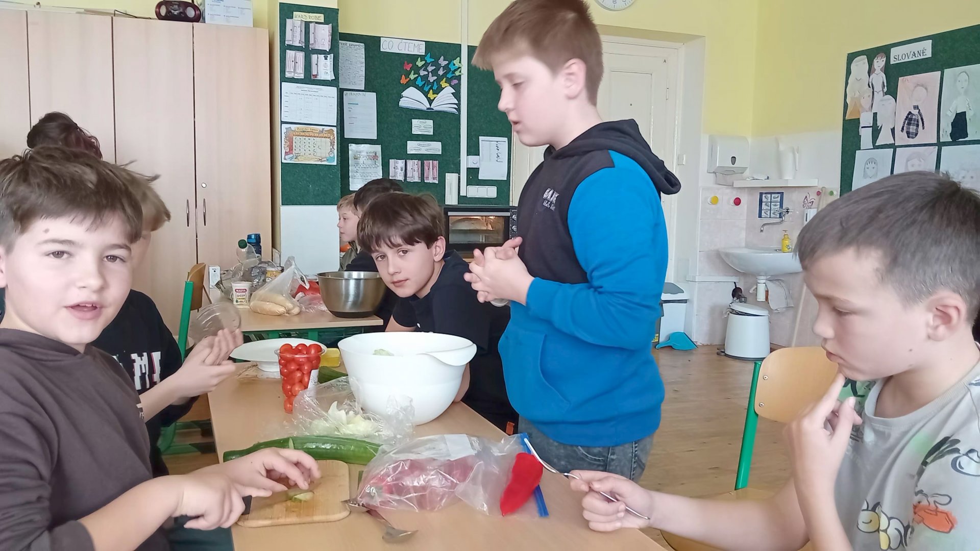 Jídlo nás baví! Připravovat saláty, ať už ovocné nebo zeleninové, zadělat na chléb a upéct ho ve škole, připravit chutnou pomazánkou – to vše se nám sešlo s akcí Mléčné výrobky do škol, kdy jsme mohli ochutnat různé druhy sýrů – žervé, plátkové, kravské, kozí – a zároveň je použít jako ingredienci při vytváření vlastních pokrmů. Pracovali jsme ve skupinách. Nakonec jsme se navzájem ohodnotili, a to nejen chuť, ale i estetickou stránku pokrmu. A že bylo nač koukat!