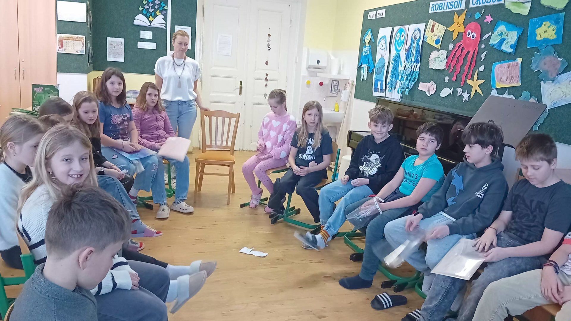 Do připravených formulářů jsme si každý napsali sebehodnocení, co se nám povedlo v prvním pololetí a co se nám líbí a nelíbí na naší třídě. Z donesených fotografií z našeho dětství jsme uspořádali Tipovací soutěž Kdo je kdo. Došlo i na meditaci a pomocí hlukoměru jsme si změřili, kolik decibelů vyprodukujeme, když křičíme, co nám síly stačí, a kolik, když si myslíme, že jsme úplně zticha. V kruhu jsme si rozdali vysvědčení. Vše zakončeno stolními hrami.
