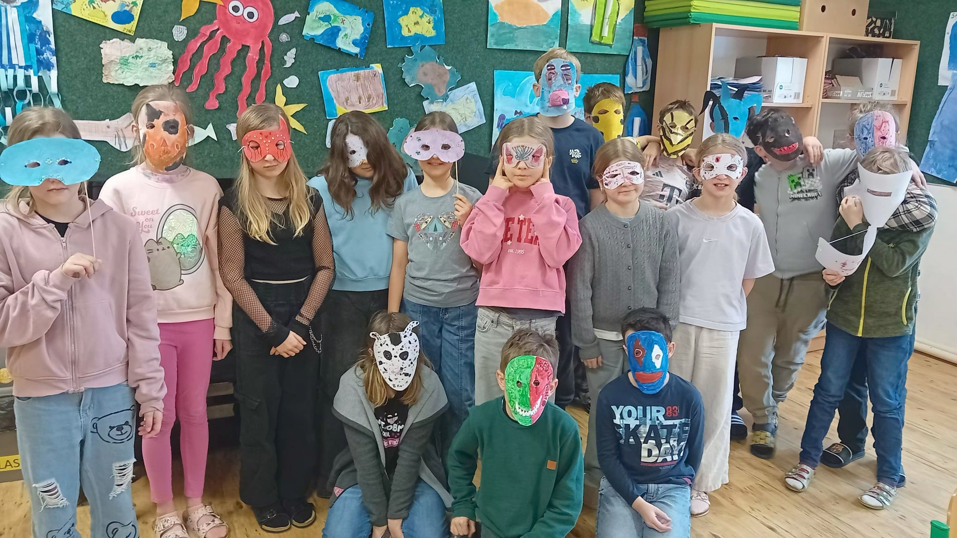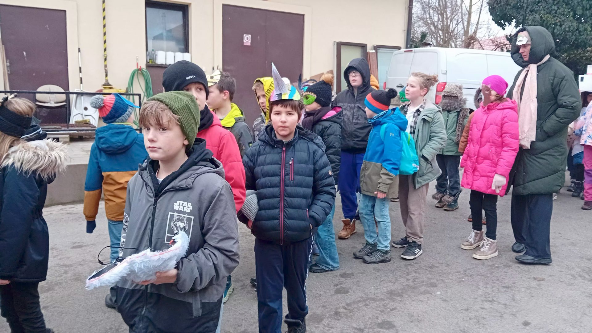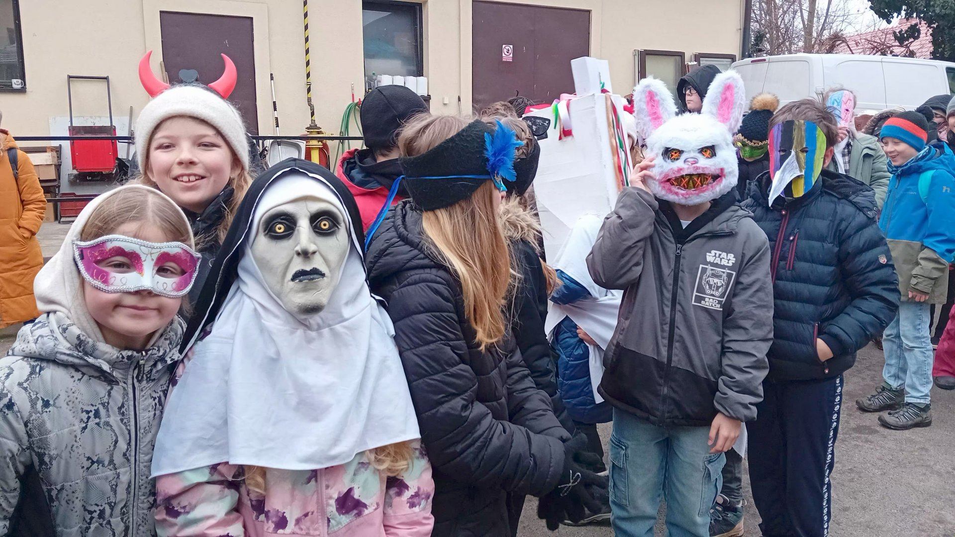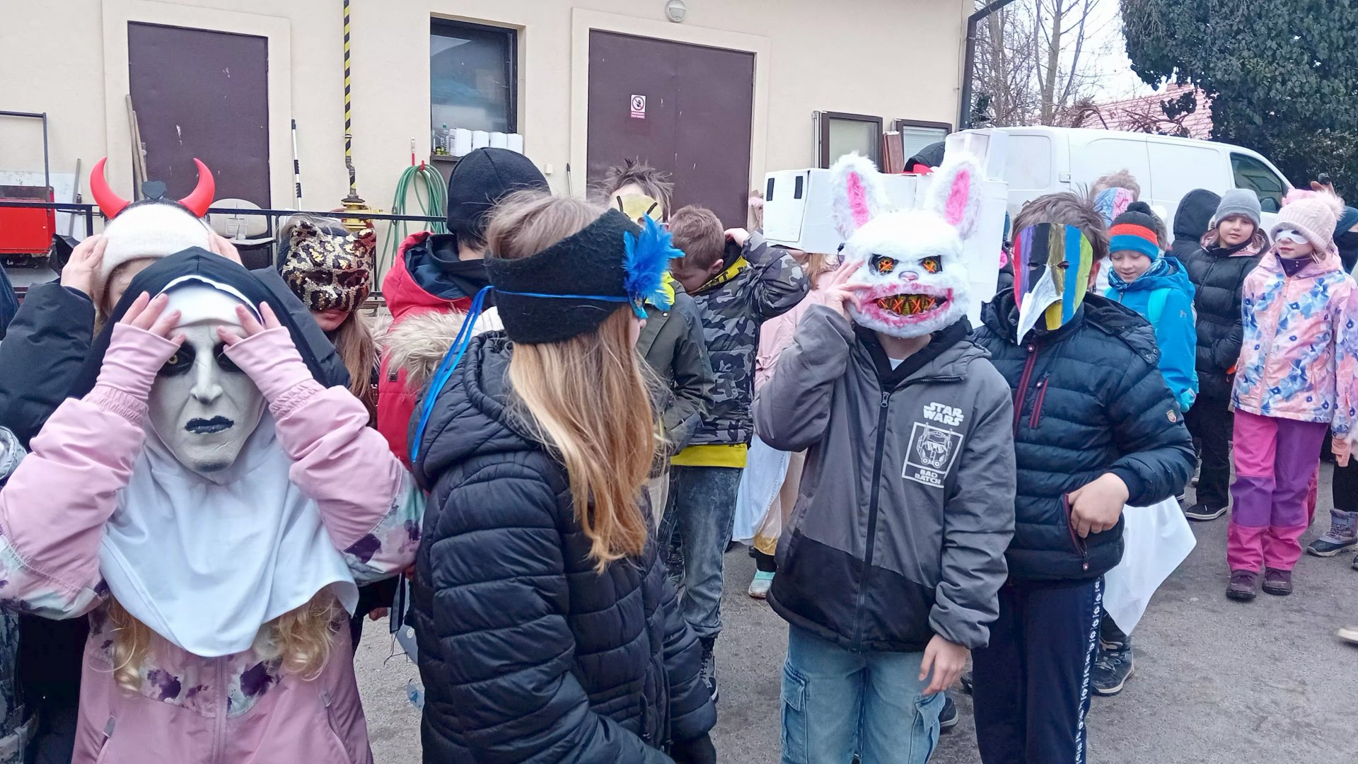 Na masopust, pořádaný naší školou poprvé, jsme si všichni vyrobili masky, i když někteří se nakonec rozhodli pro masku komerční, neb přístup byl nemaskovaným odepřen. Třetí a naše čtvrtá třída vyšly z třebohostické školy a se všemi Škvoreckými jsme se setkali u Vacků. Průvod pokračoval do Topasu, následně do výdejny na horký čaj a potom na místní úřad. Do školy jsme se vrátili úplně prokřehlí. Inu, únor!
