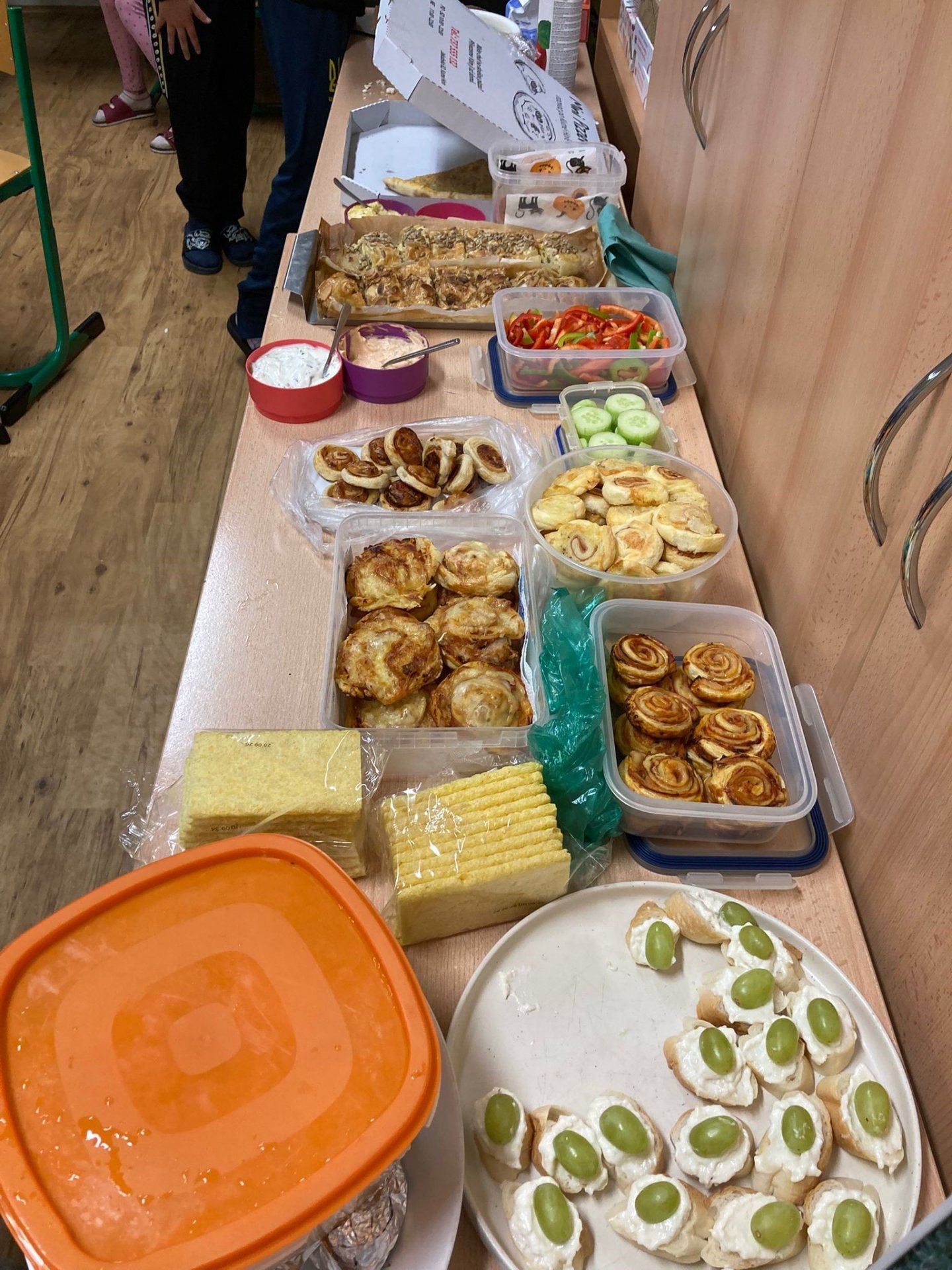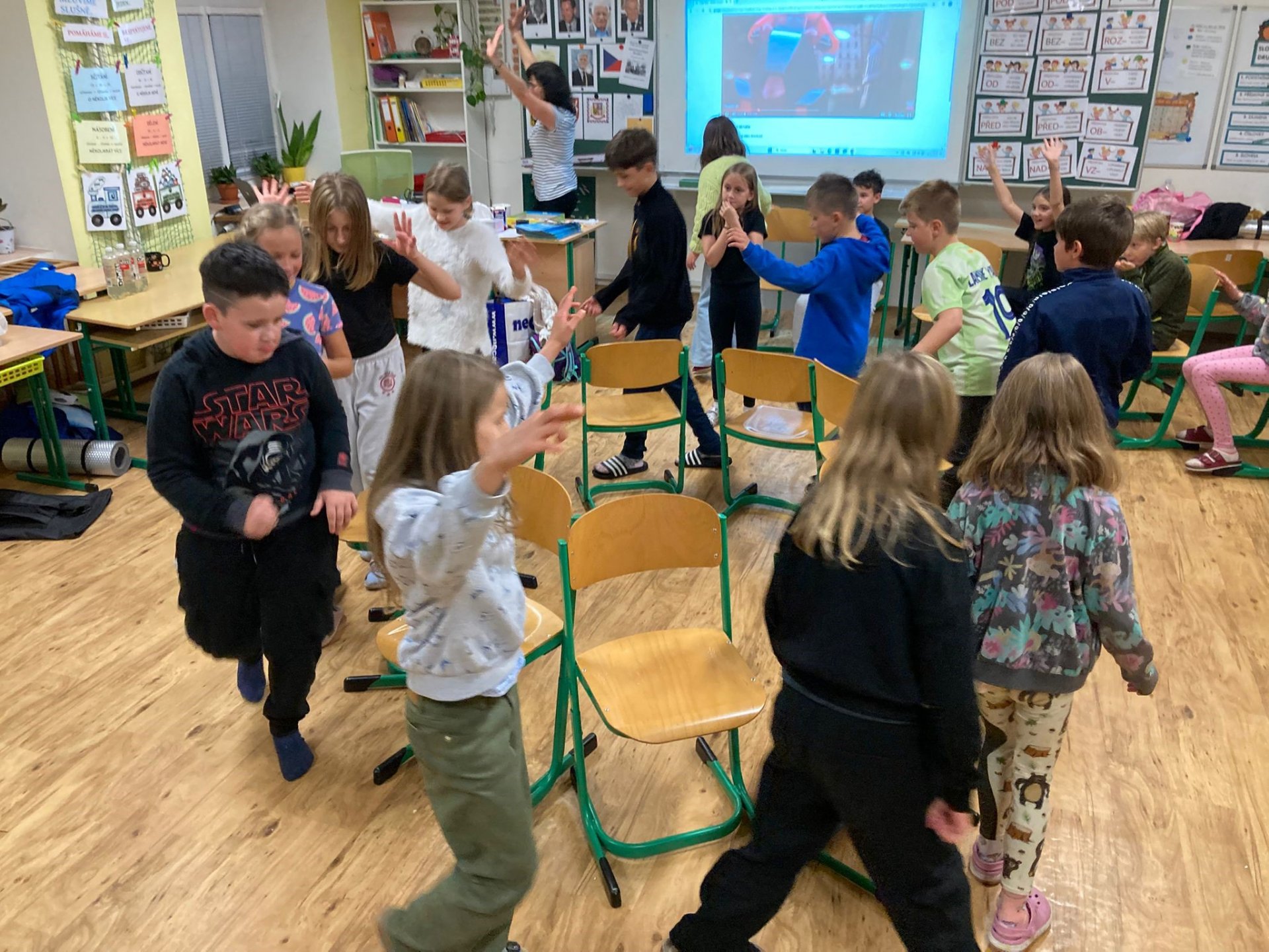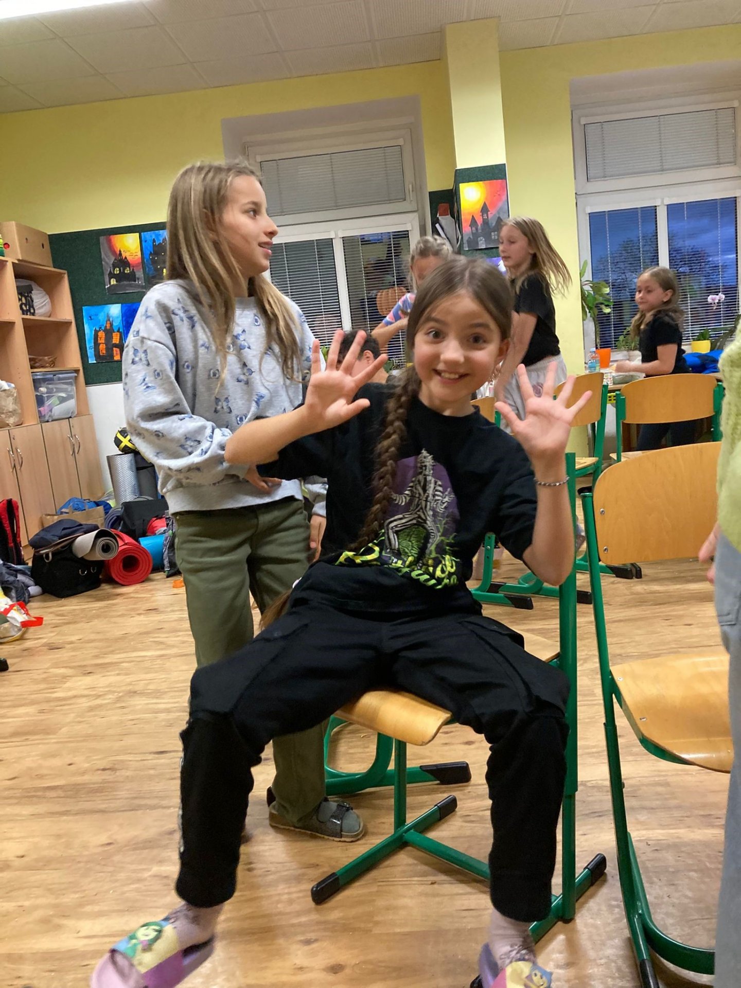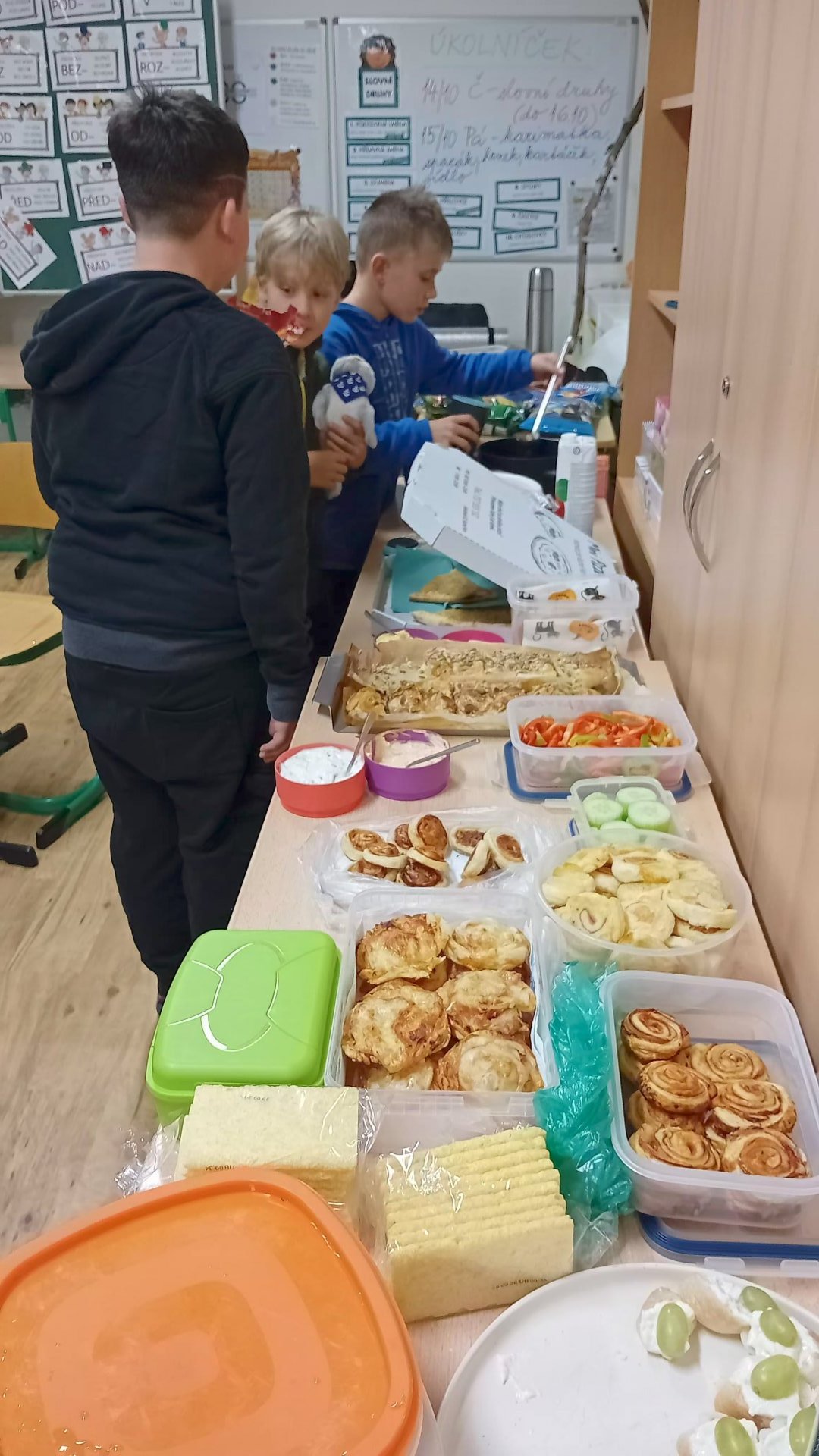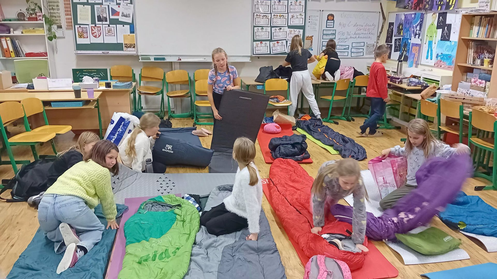 V pátek 17. října jsme se sešli v pět odpoledne ve škole, změnili naši třídu v ložnici a společně jsme přenocovali. Každý donesl něco dobrého na společný stůl, sešly se domácí výrobky, pizza, medovník, buchty slané i sladké. V podvečer jsme hráli různé hry – židličkovanou, Městečko Palermo, Na psychiatra, dokonce jsme absolvovali dobrovolnou noční bojovku. Večer jsme se podívali na film a pak už byl čas jít spát. Mnohým se dlouho nedařilo usnout – spali jsme přece ve škole! Ráno nás čekalo brzké vstávání, protože jakmile se vzbudí první dva, vzbudí se všichni ostatní. Pak už jen snídaně, společné povídání, co se nám líbilo, ještě jednou Městečko Palermo, úklid třídy, sbalit všechny věci a hurá domů k rodičům!