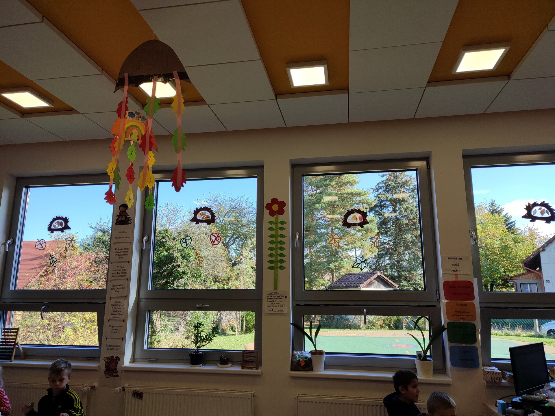 děti ve ŠD opravdu krásně pracují . Zaplavili nás ježečci, ale výzdoba se hodila do mnoha oken :-)))