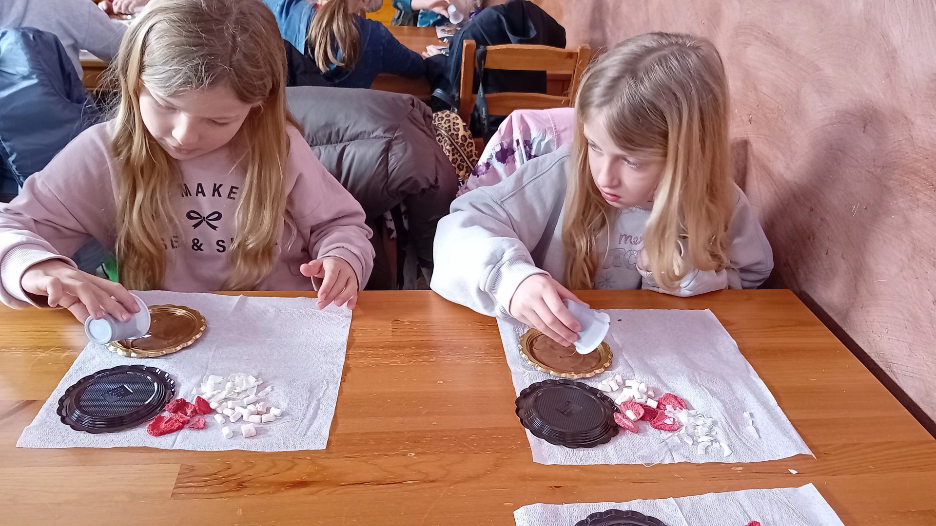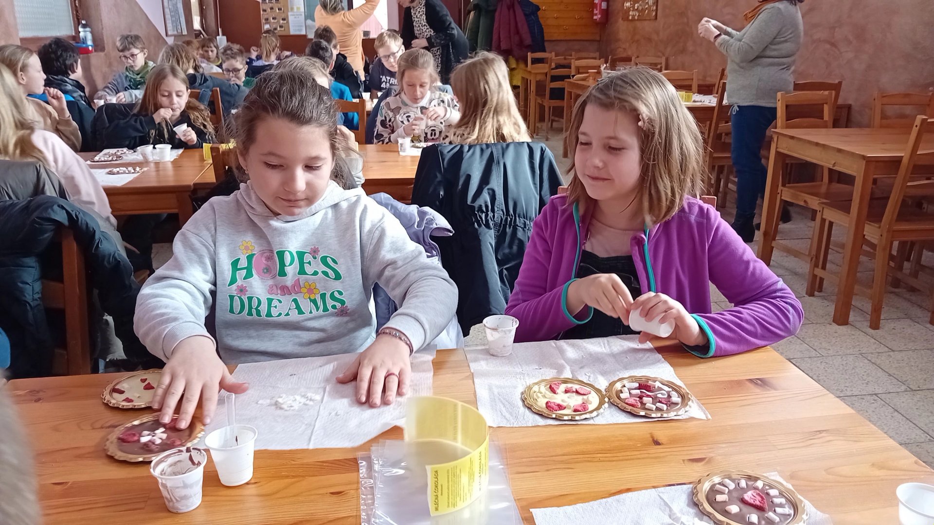 18. března jsme se společně s 2.A vypravili do šestajovické svíčkárny Rodas. Kromě výroby svíček je možné vyrobit si tu balíček koupelových solí, odlít glycerinové mýdlo, vytvořit vlastní voskové pastelky a mnoho dalšího. My jsme si vyrobili čokoládu. Paní nám nejdříve vyprávěla o pěstování kakaových bobů, vysvětlovala rozdíl mezi bílou a tmavou čokoládou, a pak už jsme se do toho pustili sami. Každý si odnesl jednu krásně nazdobenou tmavou a jednu bílou čokoládu. Ve zbývajícím čase jsme ještě mohli zajít do místního obchůdku nebo se pomazlit se zvířátky, kterých je na místní farmě nespočet.