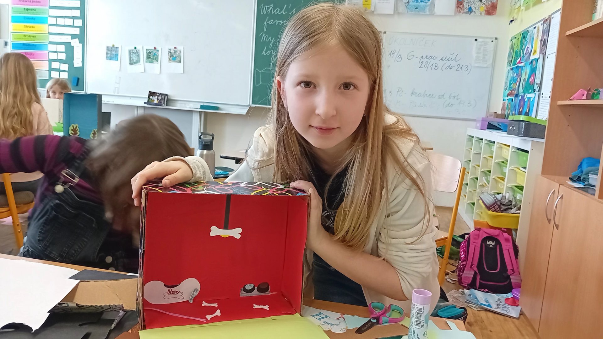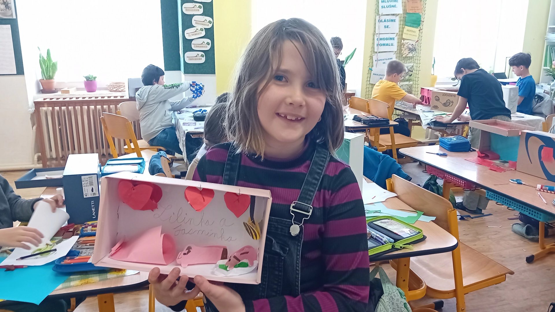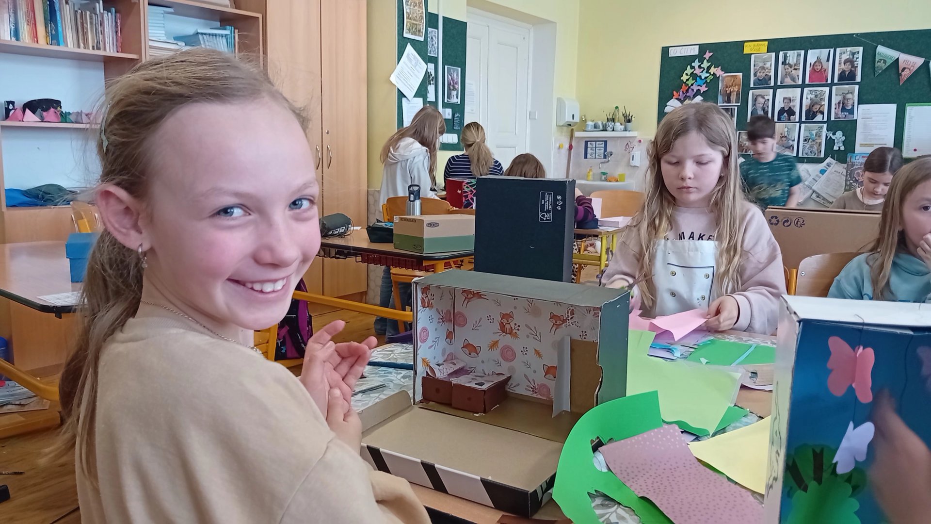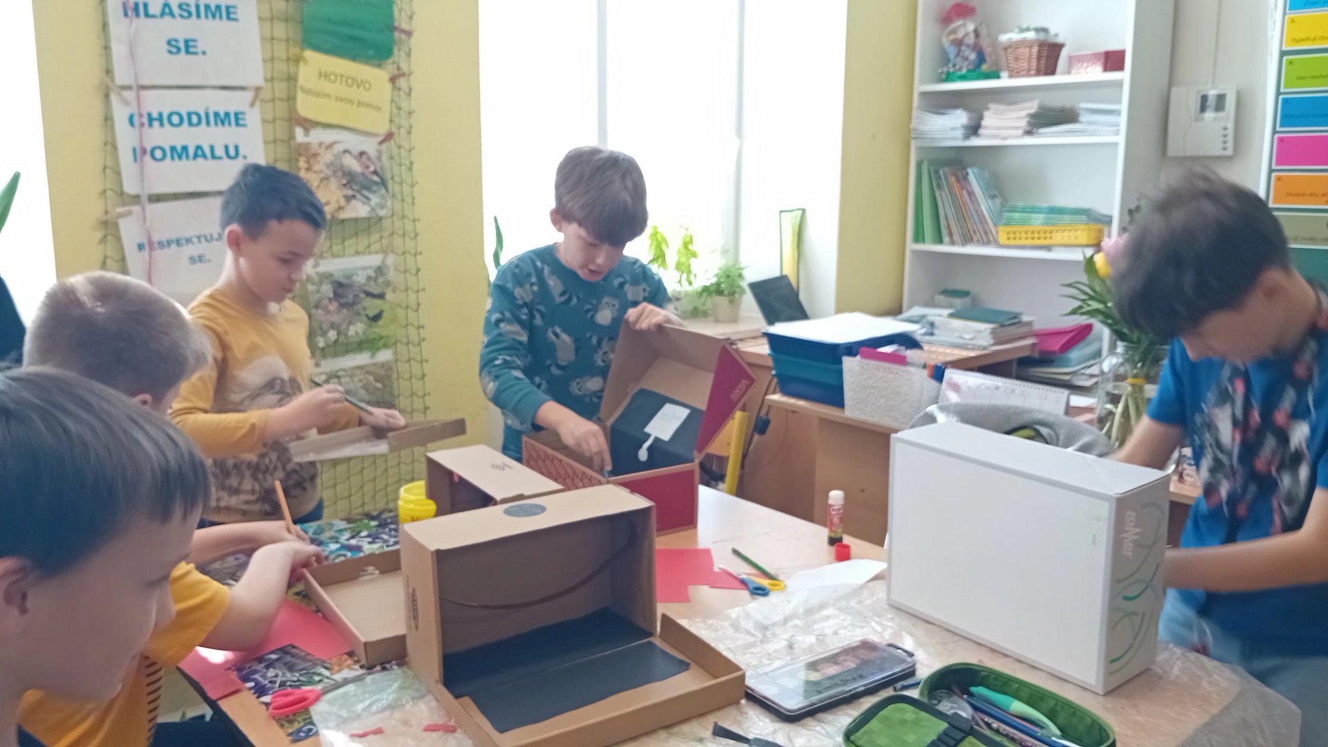 Výtvarka a pracovní činnosti nás baví a máme šikovné ruce. Do školy jsme si všichni přinesli krabici od bot a mohli jsme se pustit do výroby prostorových modelů. Původně se mělo jednat o pokojíky, ale protože dětská fantazie je bezbřehá, vznikla psí bouda, KFC, fotbalové hřiště, zahrada, zkrátka všechno, na co jsme si troufli. Výsledkem byly výtvory radost pohledět.