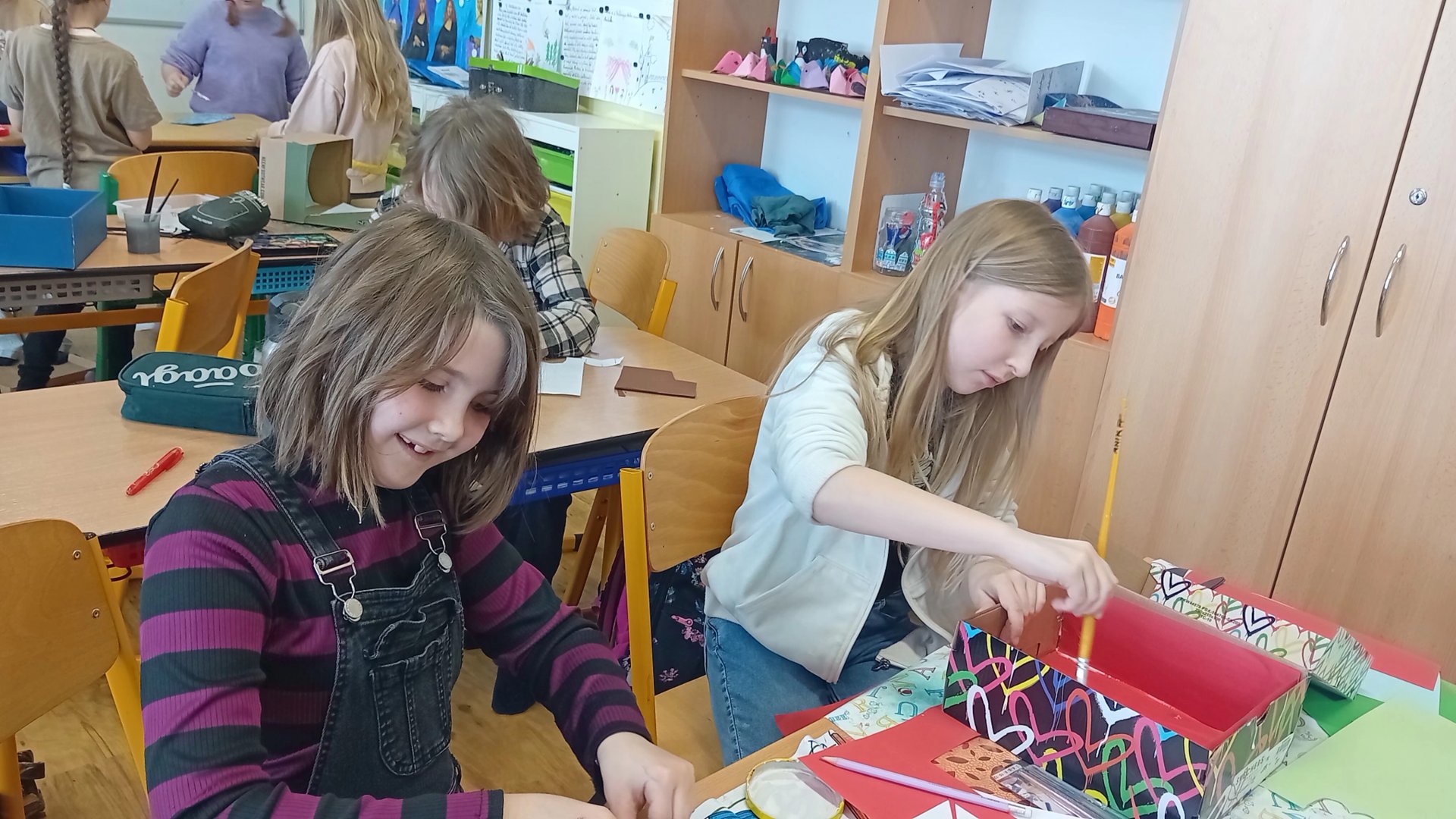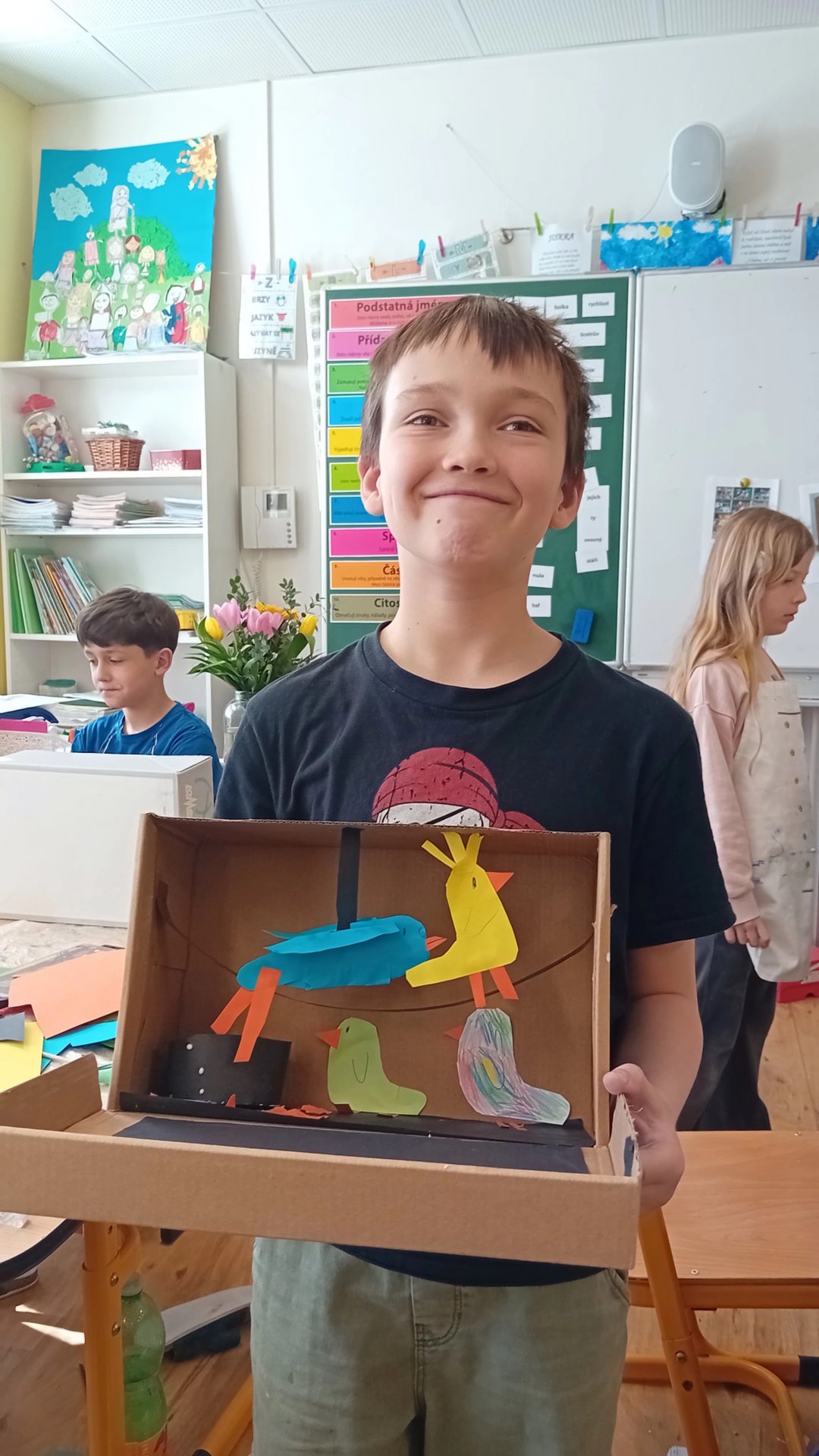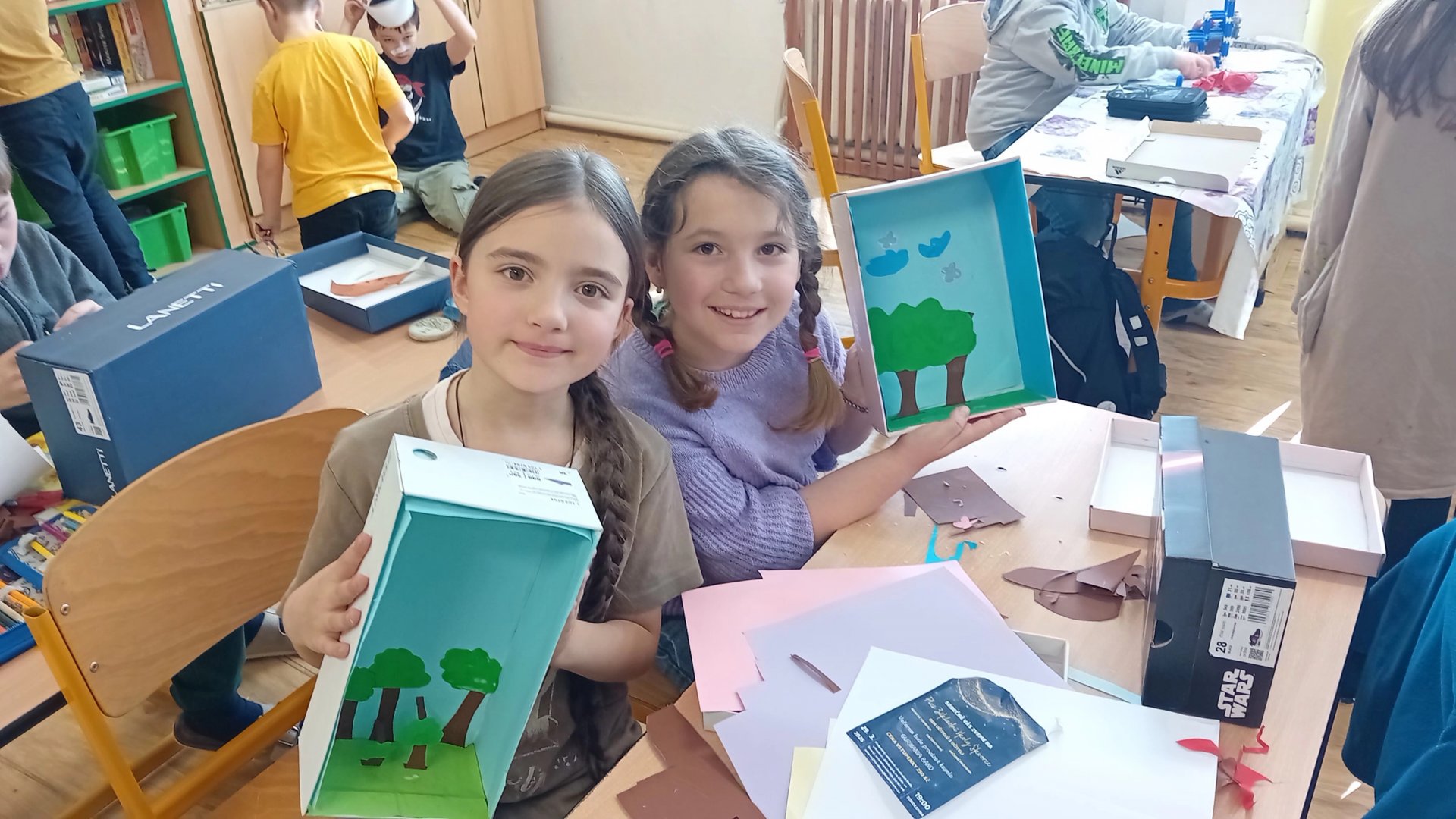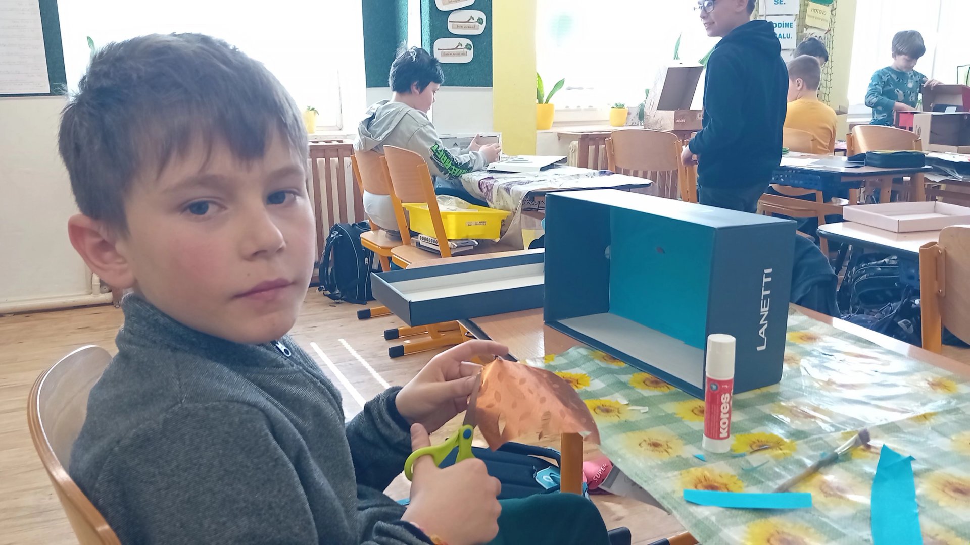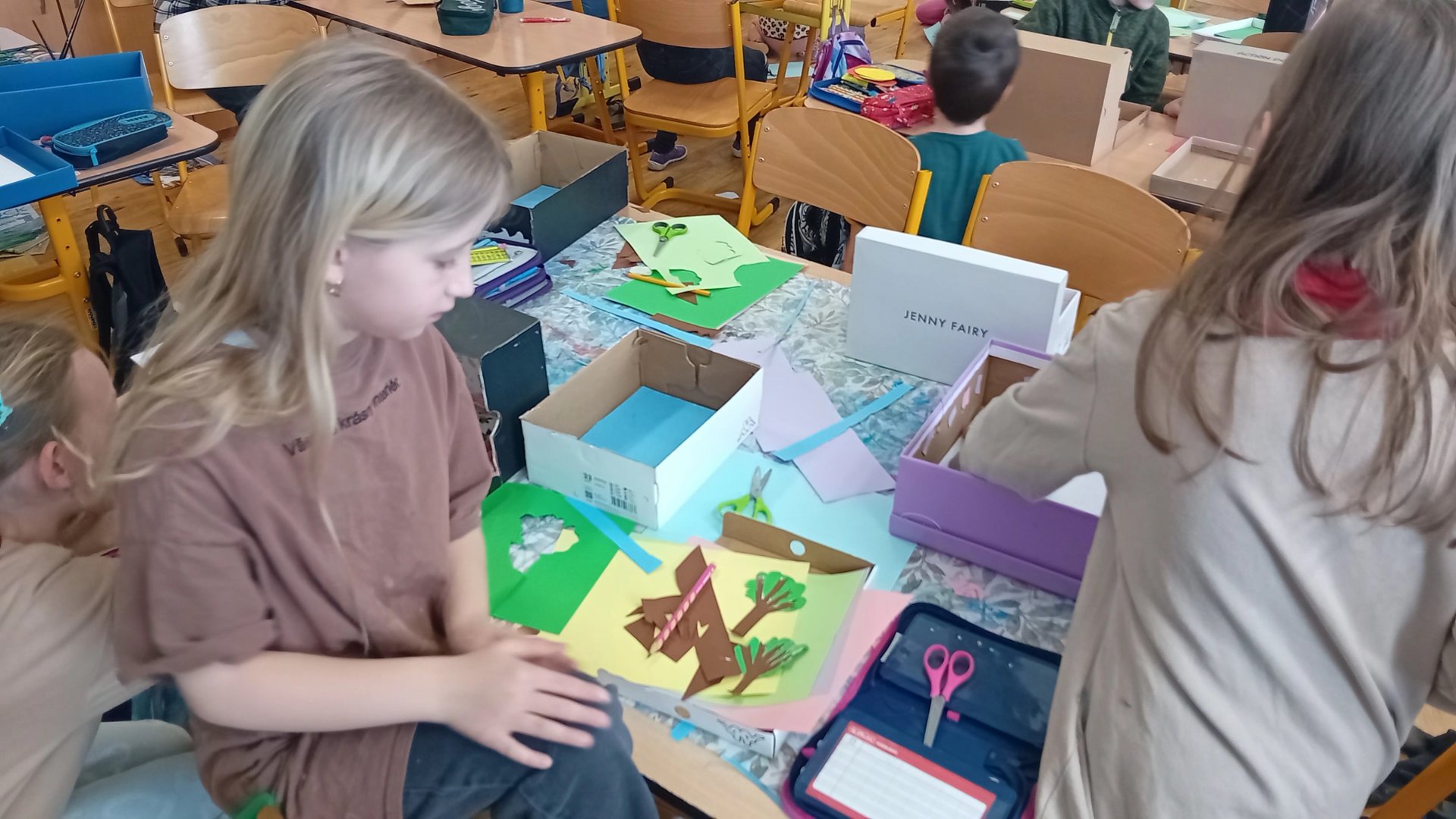 Výtvarka a pracovní činnosti nás baví a máme šikovné ruce. Do školy jsme si všichni přinesli krabici od bot a mohli jsme se pustit do výroby prostorových modelů. Původně se mělo jednat o pokojíky, ale protože dětská fantazie je bezbřehá, vznikla psí bouda, KFC, fotbalové hřiště, zahrada, zkrátka všechno, na co jsme si troufli. Výsledkem byly výtvory radost pohledět.