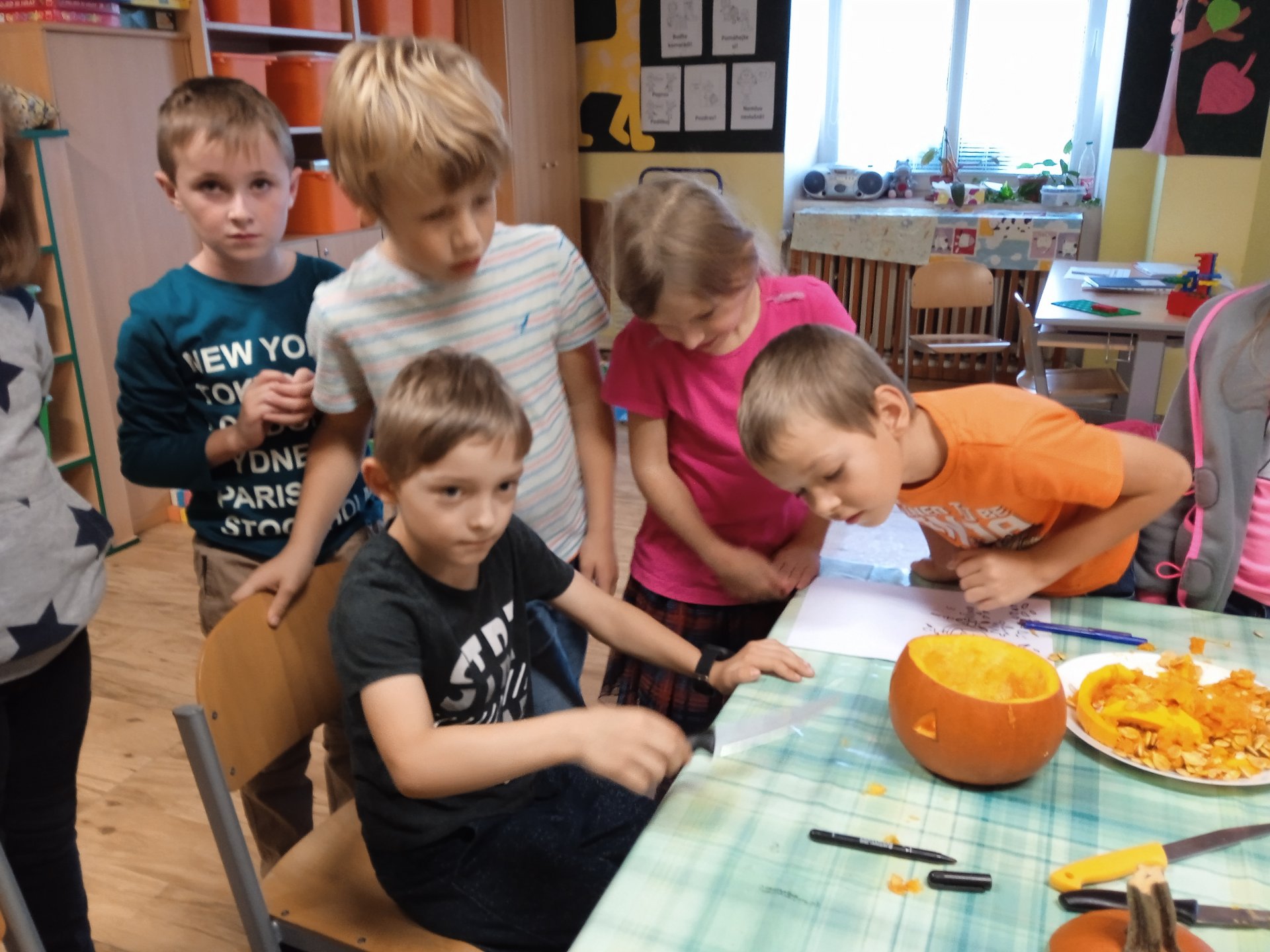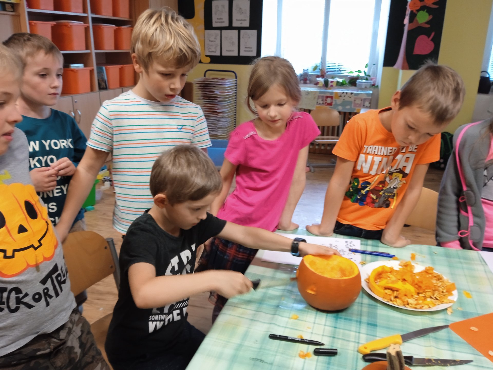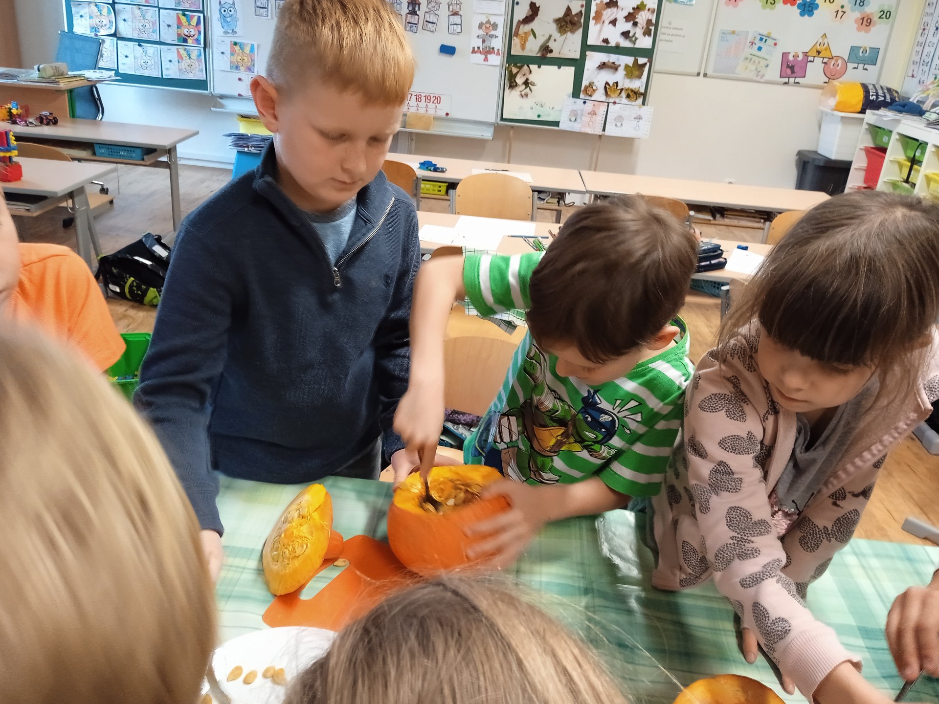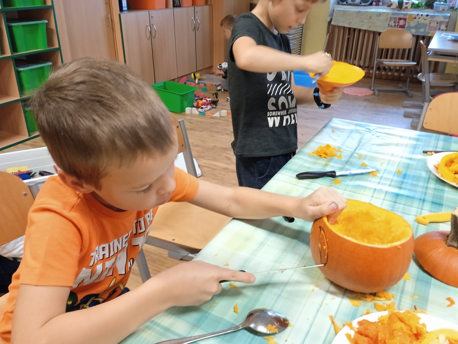 další vyřezávali, jiní radili a uklizeli. Po společném úsilí se zrodili dva dýňový strašáčci. Možná to nejsou ti nejhezčí, ale jsou naši.