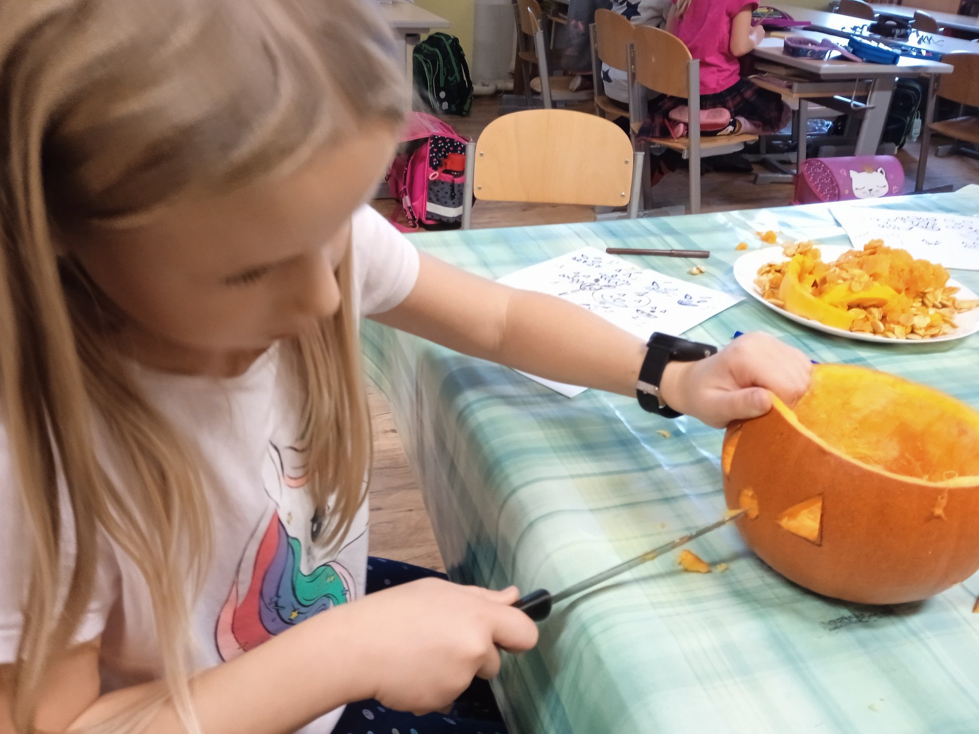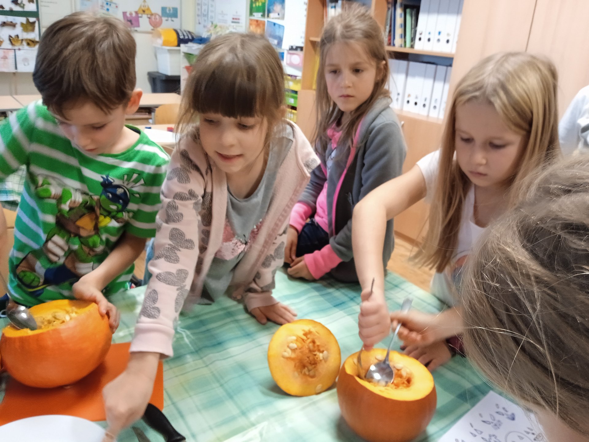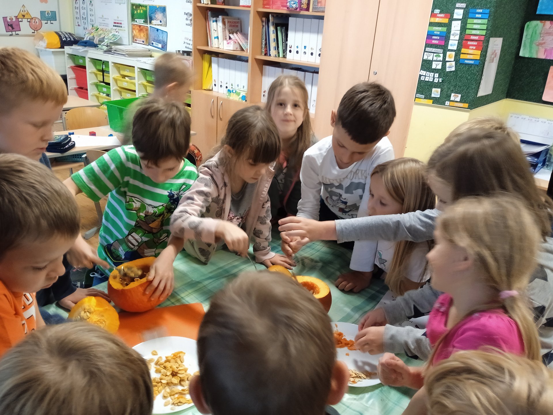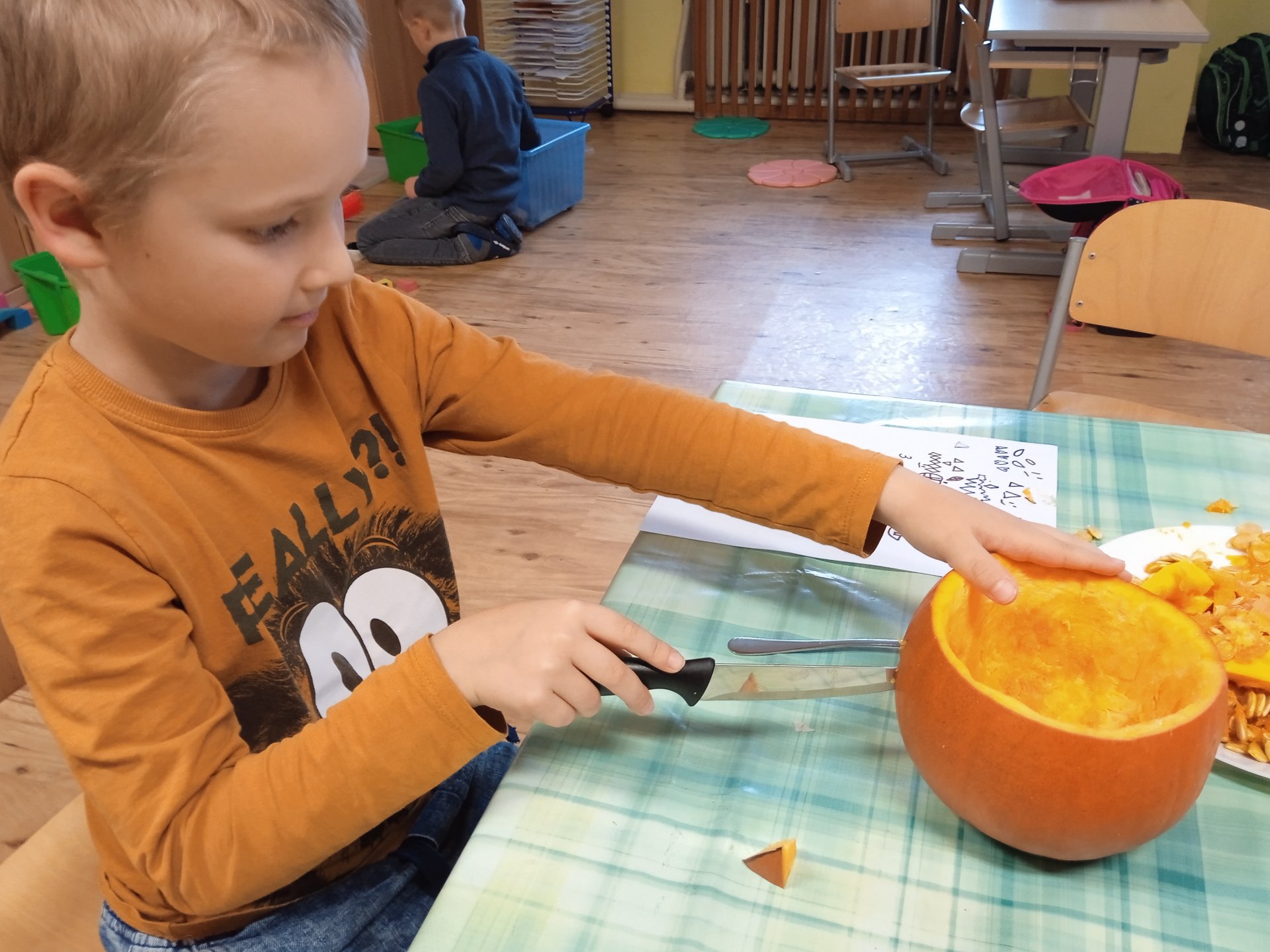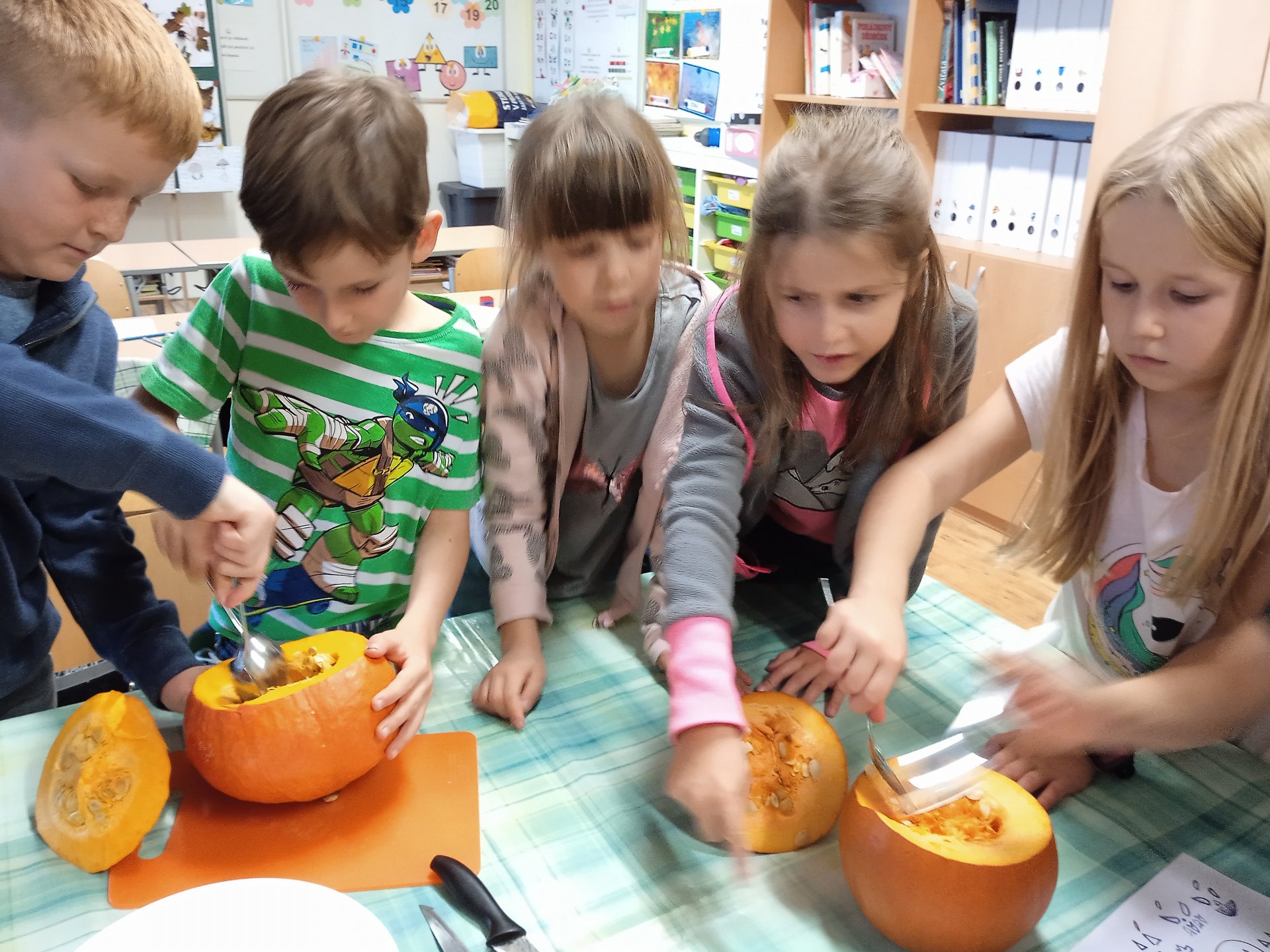 další vyřezávali, jiní radili a uklizeli. Po společném úsilí se zrodili dva dýňový strašáčci. Možná to nejsou ti nejhezčí, ale jsou naši.