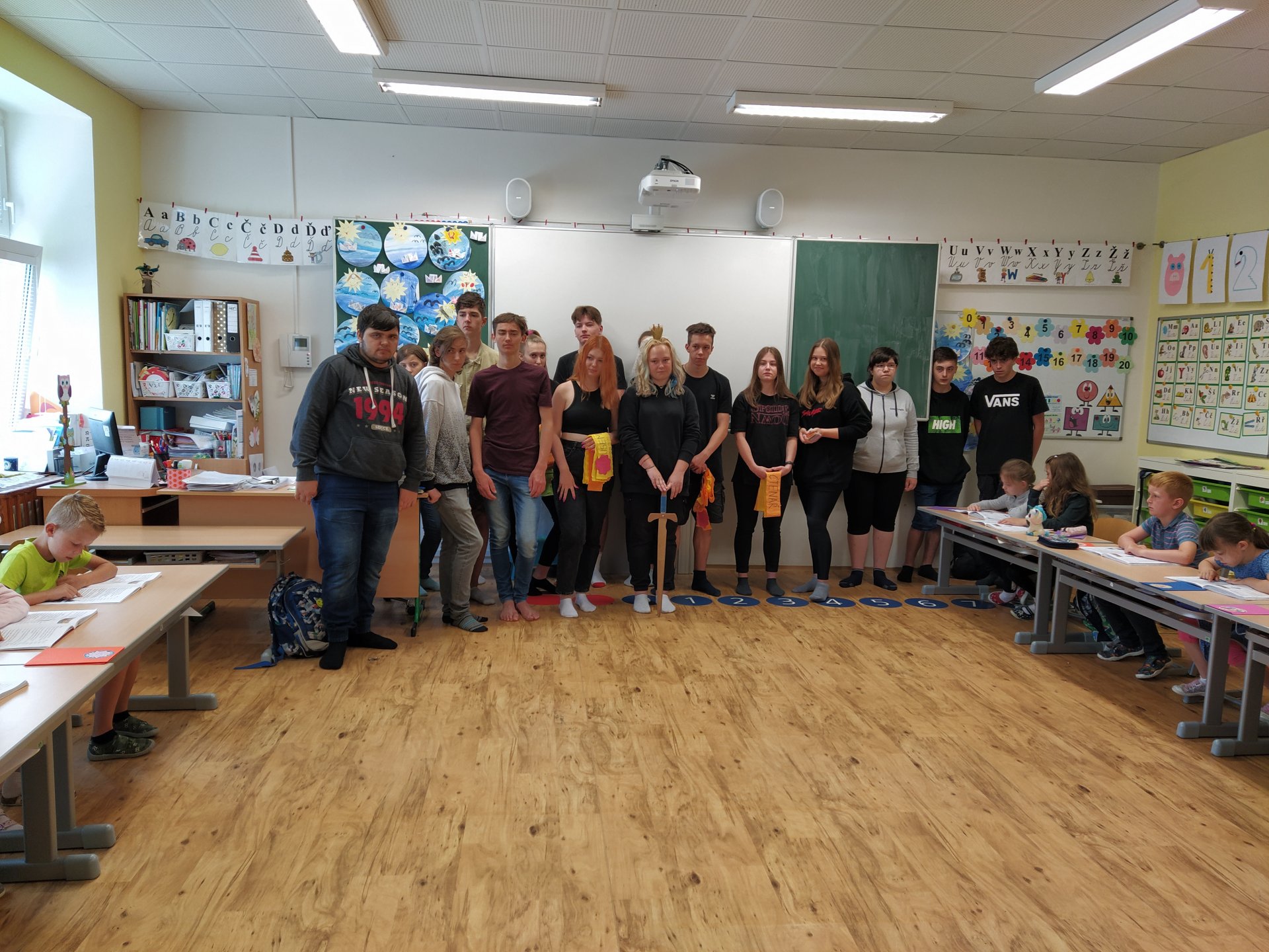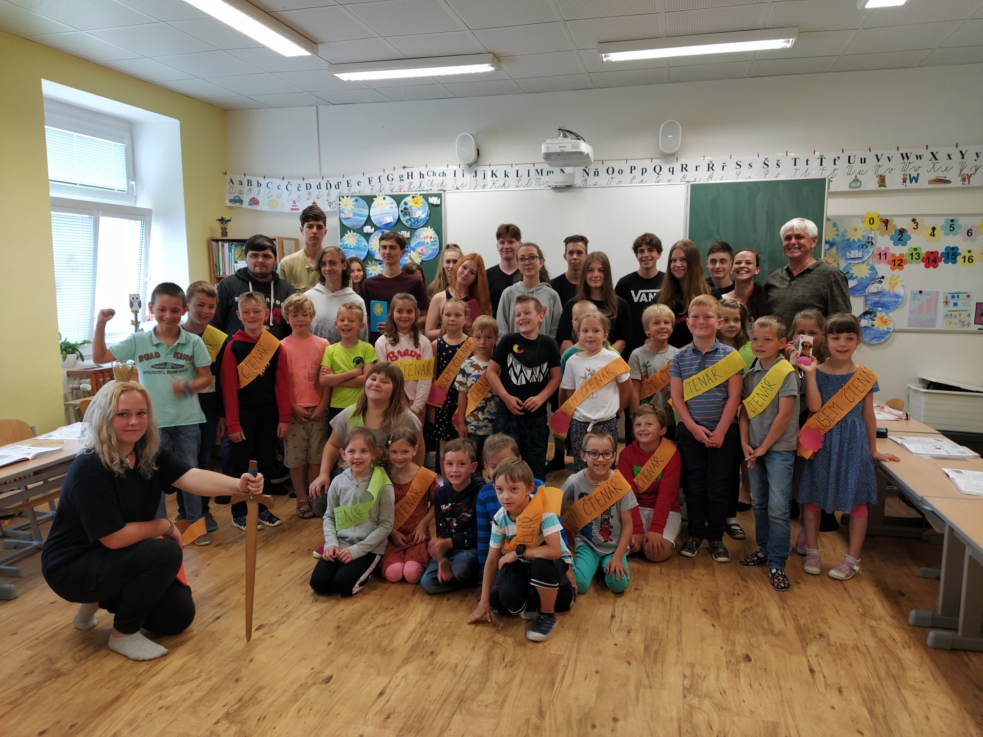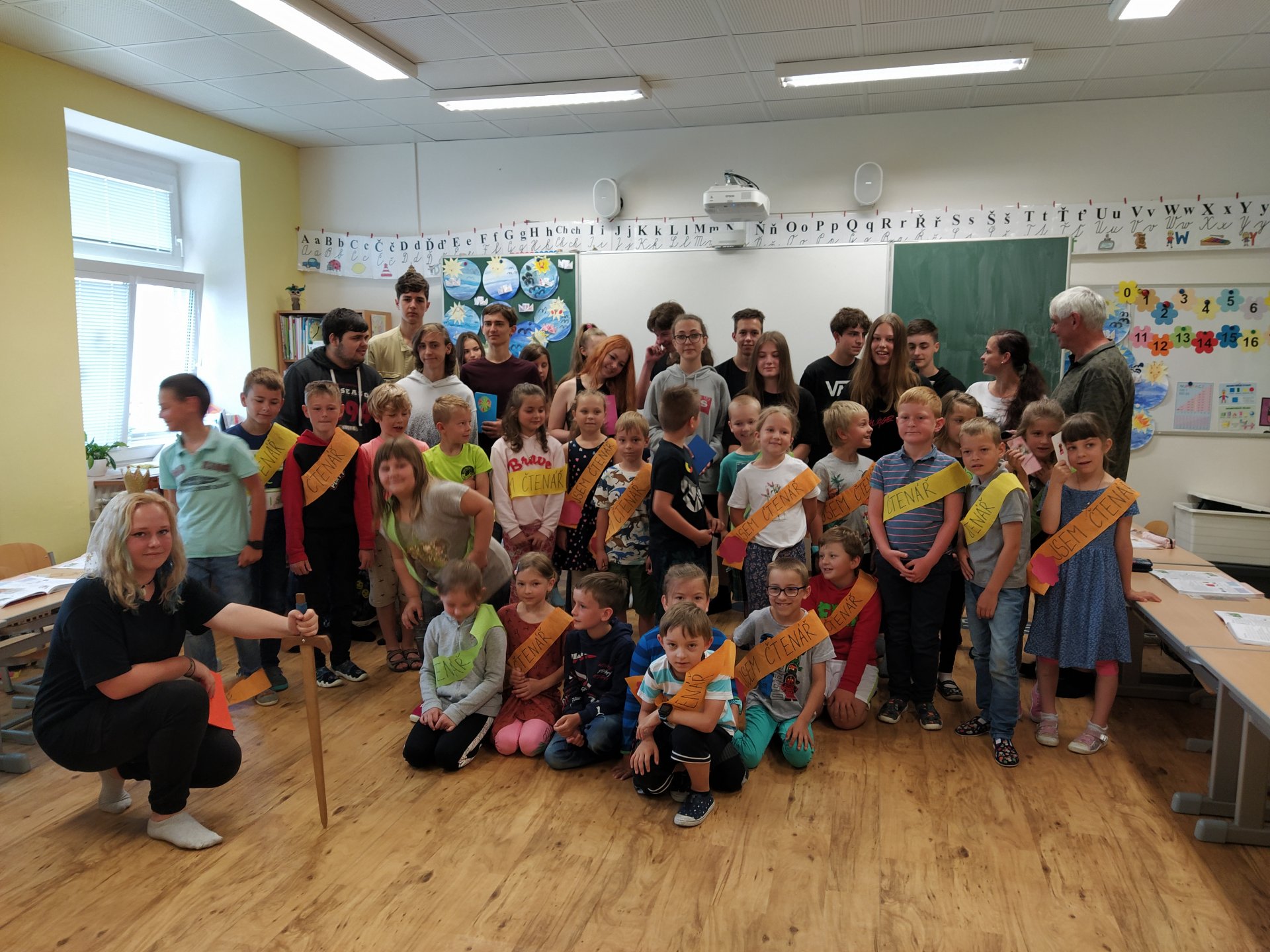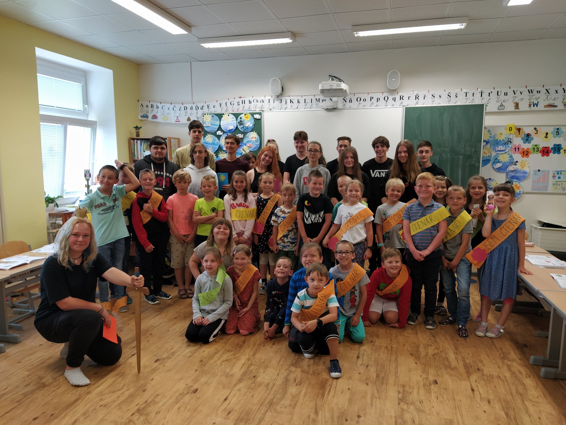Ve středu 23.června došlo k netradičnímu setkání. Za prvňáčky přijeli ze Škvorce nejstarší žáci naší školy, deváťáci. Prvňáčci přečetli úryvek ze Slabikáře, za který je potom královna se svými pomocníky pasovala na čtenáře. Malí čtenáři dostali šerpu a záložku do knížky. Prvňáčci naopak dali každému staršímu kamarádovi na památku přání s básničkou, kterou sami napsali. Děkujeme za milou návštěvu a hezkou akci pro prvňáčky!