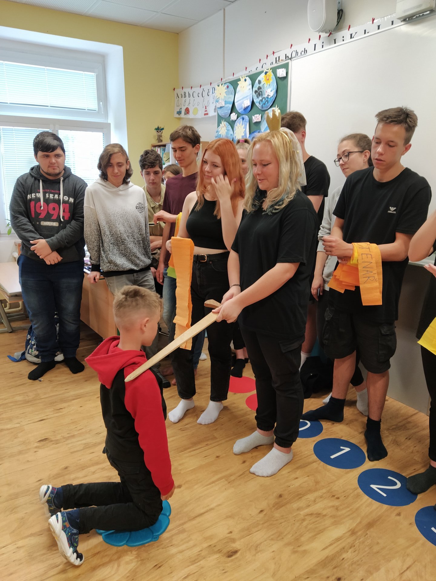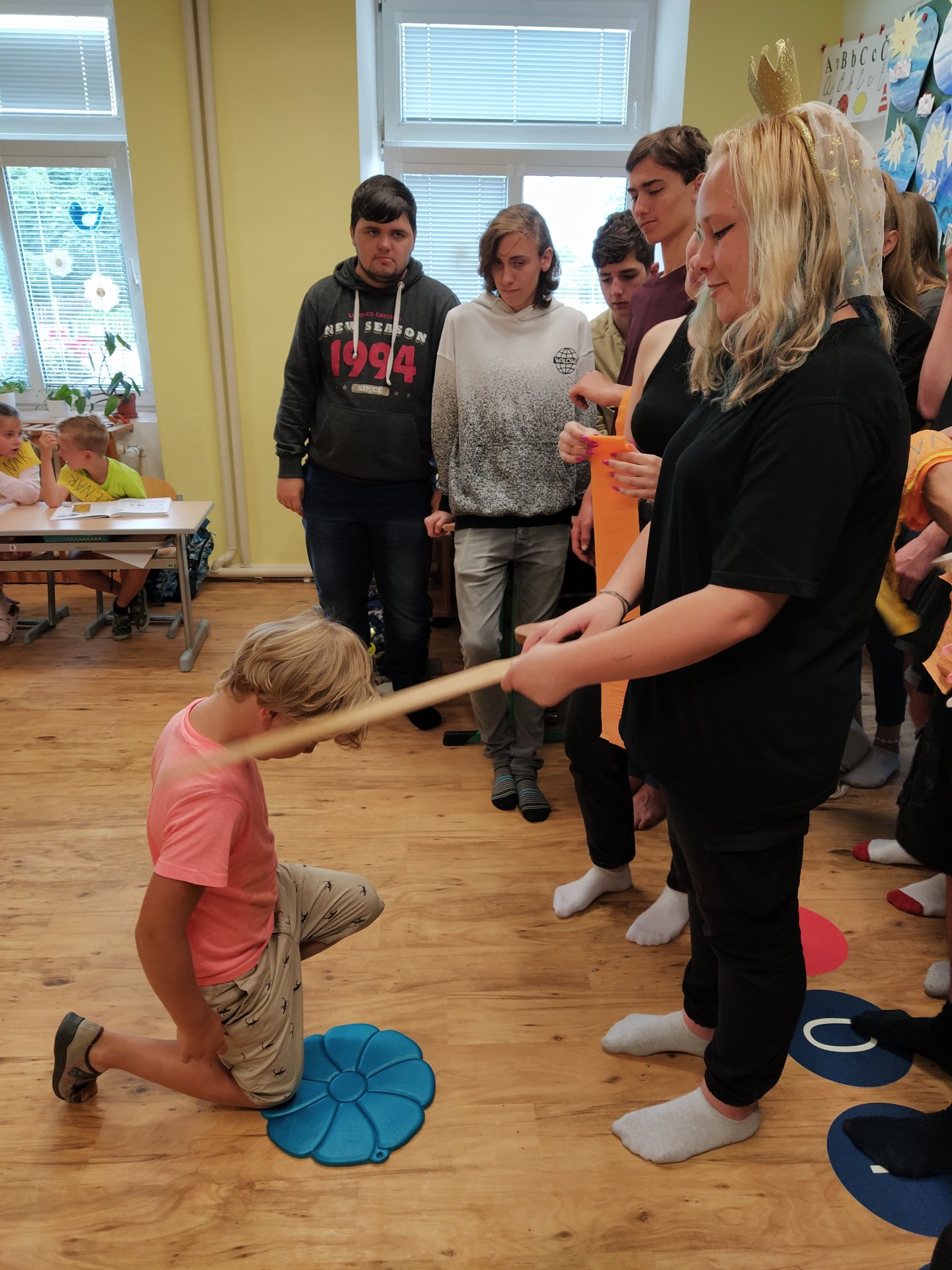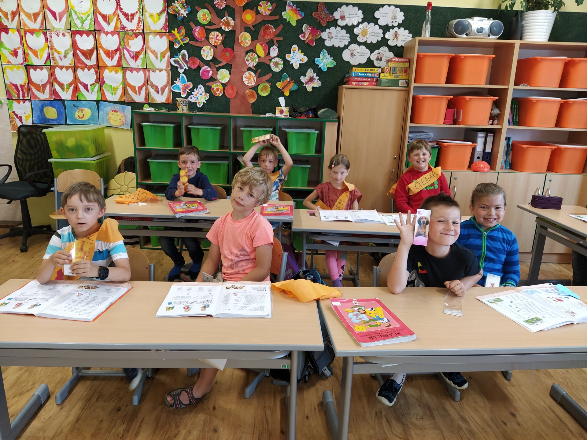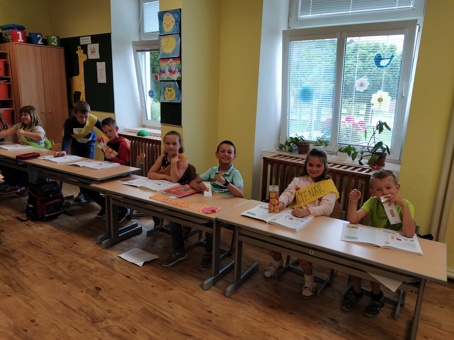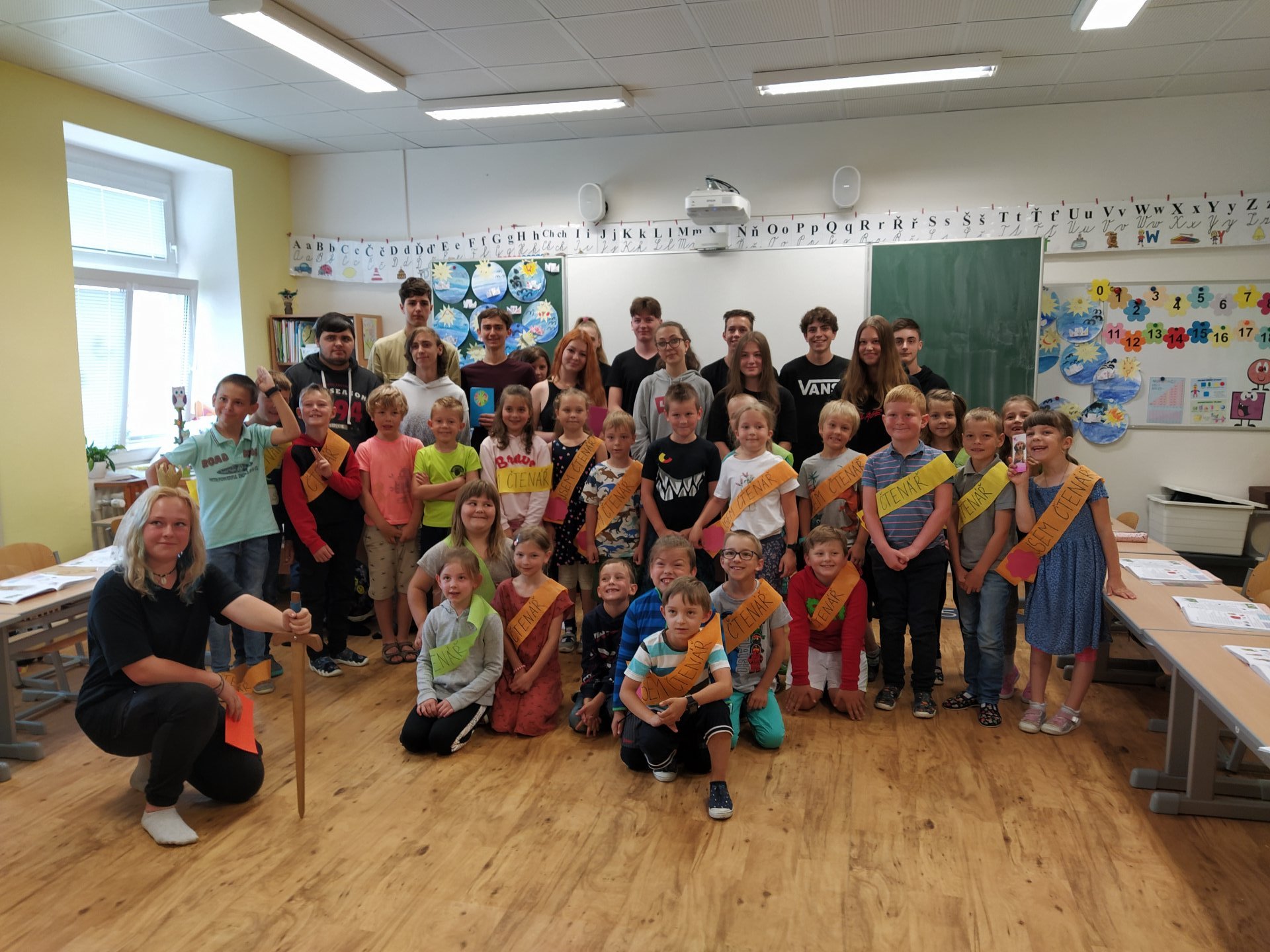 Ve středu 23.června došlo k netradičnímu setkání. Za prvňáčky přijeli ze Škvorce nejstarší žáci naší školy, deváťáci. Prvňáčci přečetli úryvek ze Slabikáře, za který je potom královna se svými pomocníky pasovala na čtenáře. Malí čtenáři dostali šerpu a záložku do knížky. Prvňáčci naopak dali každému staršímu kamarádovi na památku přání s básničkou, kterou sami napsali. Děkujeme za milou návštěvu a hezkou akci pro prvňáčky!