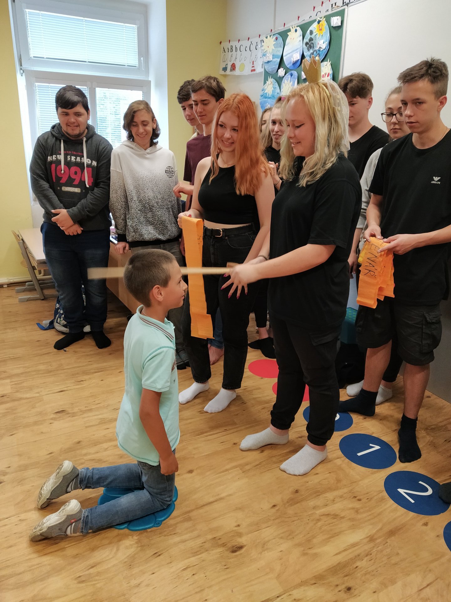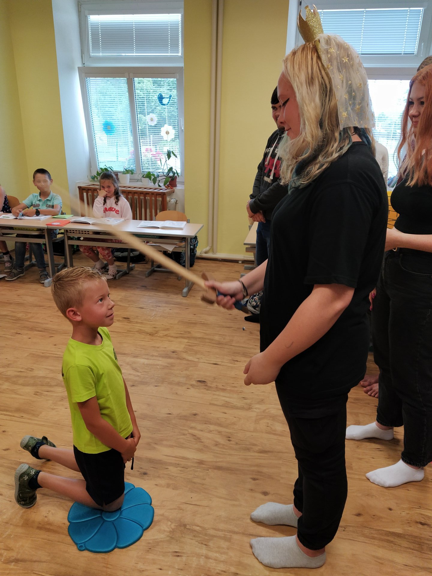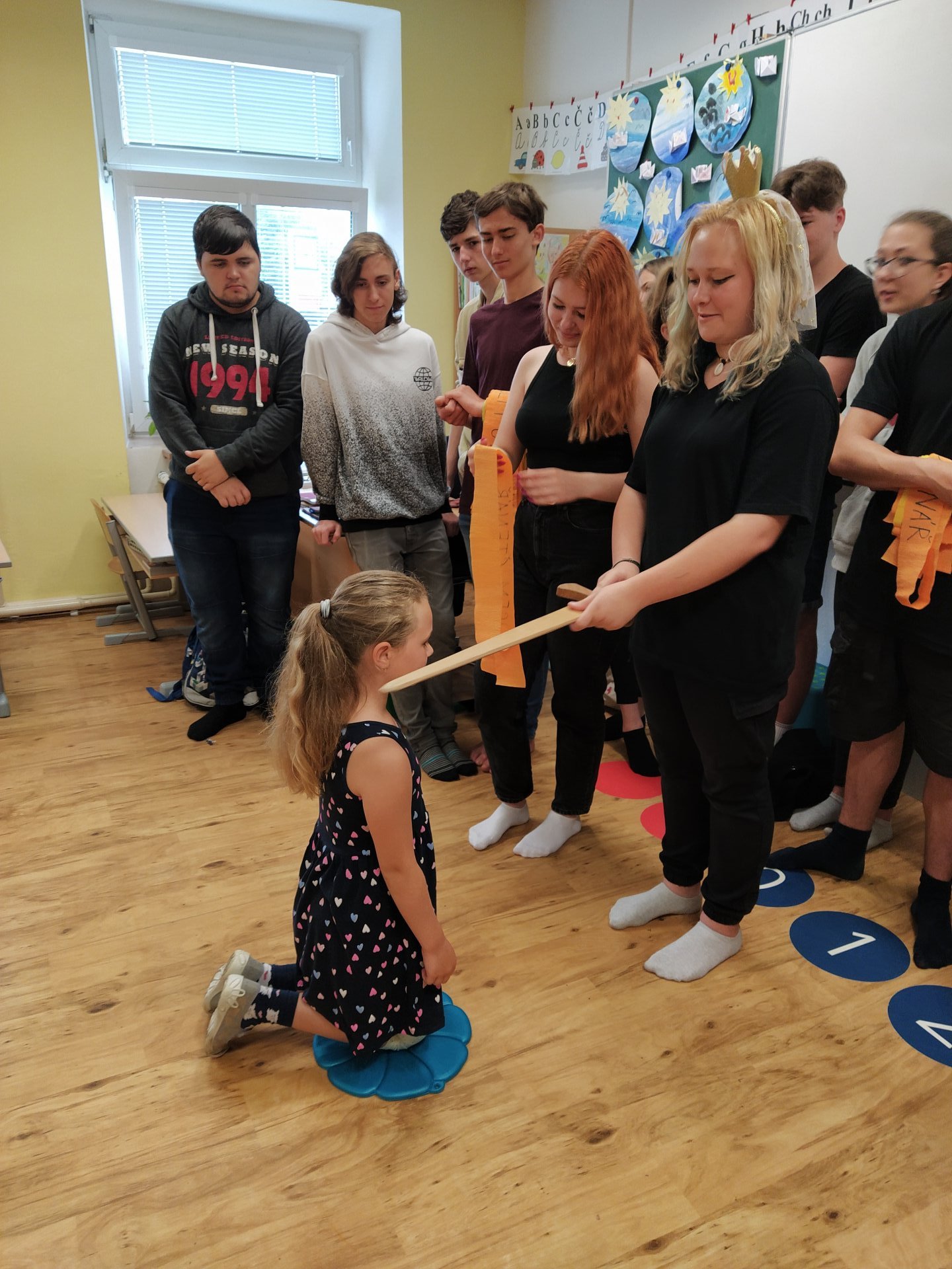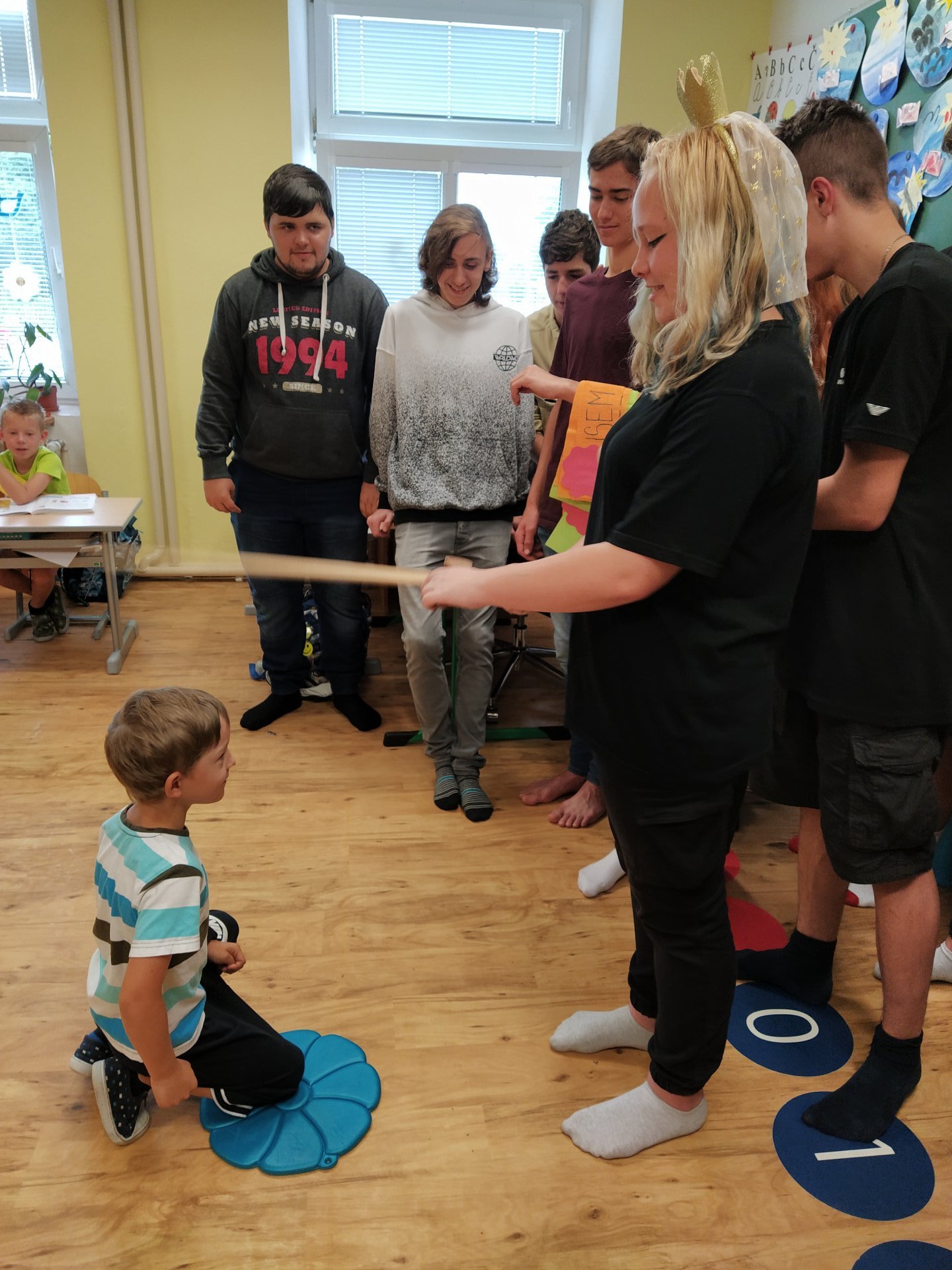 Ve středu 23.června došlo k netradičnímu setkání. Za prvňáčky přijeli ze Škvorce nejstarší žáci naší školy, deváťáci. Prvňáčci přečetli úryvek ze Slabikáře, za který je potom královna se svými pomocníky pasovala na čtenáře. Malí čtenáři dostali šerpu a záložku do knížky. Prvňáčci naopak dali každému staršímu kamarádovi na památku přání s básničkou, kterou sami napsali. Děkujeme za milou návštěvu a hezkou akci pro prvňáčky!