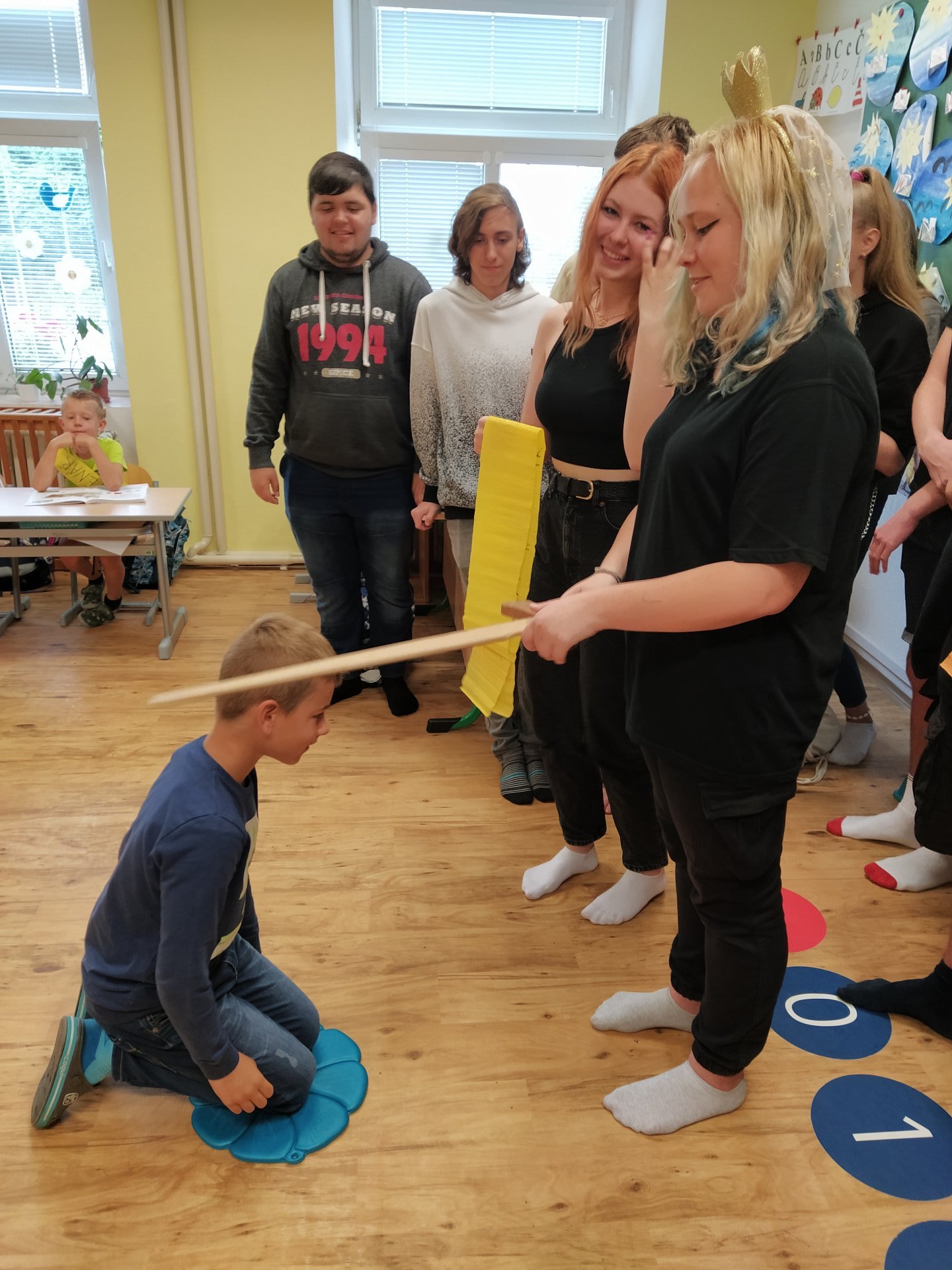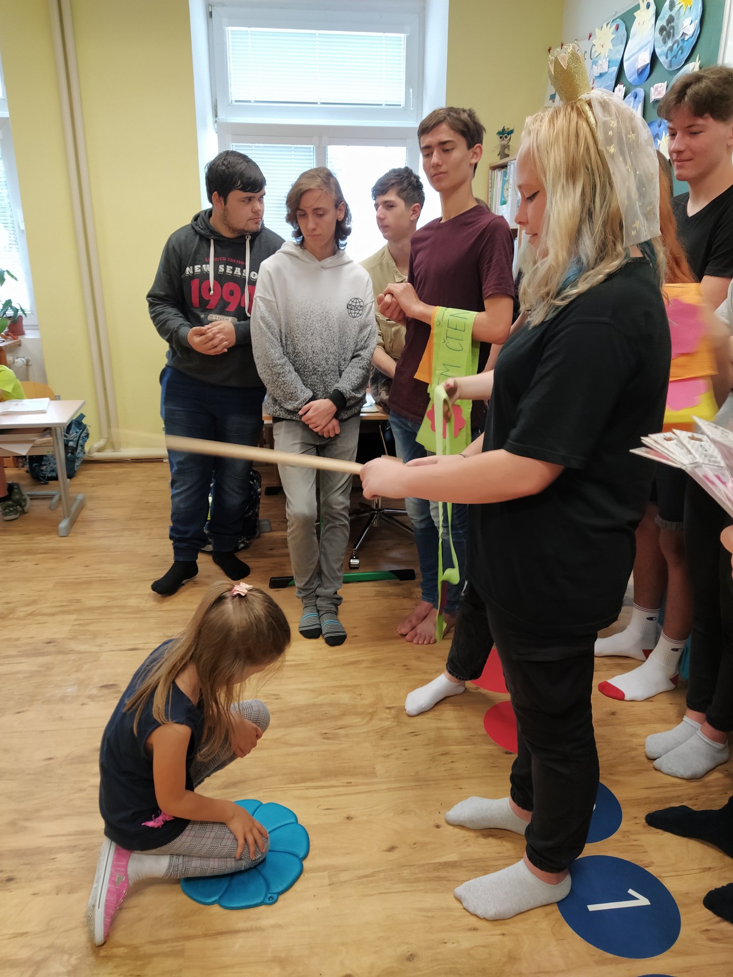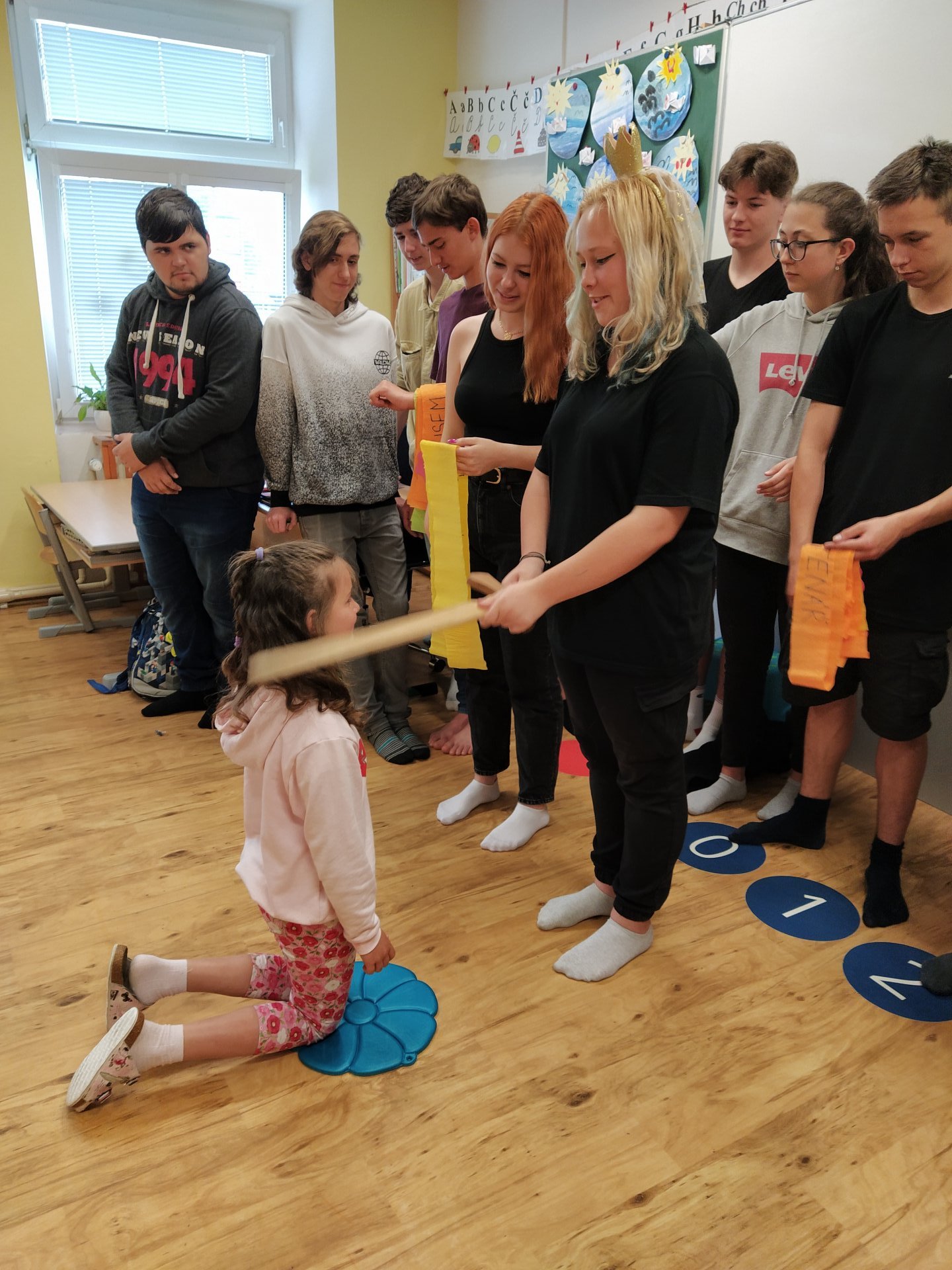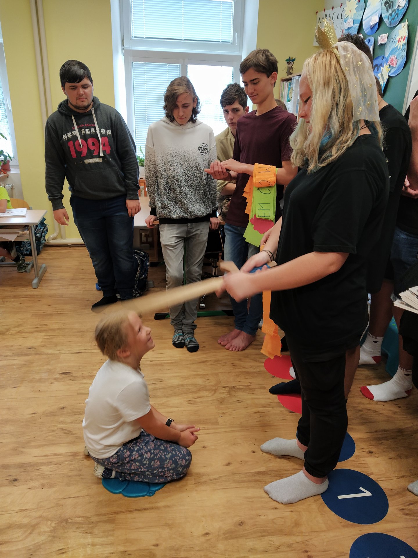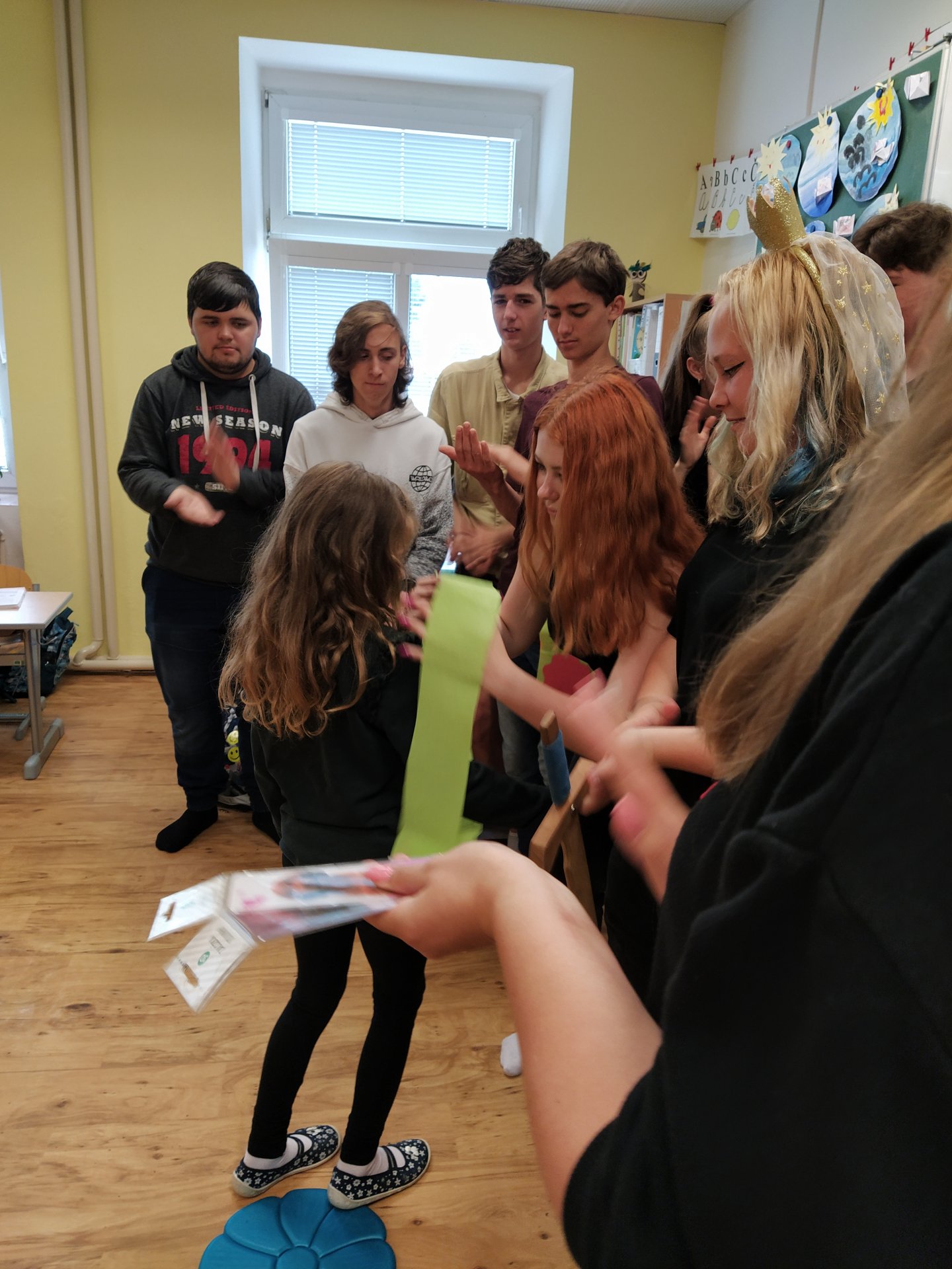 Ve středu 23.června došlo k netradičnímu setkání. Za prvňáčky přijeli ze Škvorce nejstarší žáci naší školy, deváťáci. Prvňáčci přečetli úryvek ze Slabikáře, za který je potom královna se svými pomocníky pasovala na čtenáře. Malí čtenáři dostali šerpu a záložku do knížky. Prvňáčci naopak dali každému staršímu kamarádovi na památku přání s básničkou, kterou sami napsali. Děkujeme za milou návštěvu a hezkou akci pro prvňáčky!