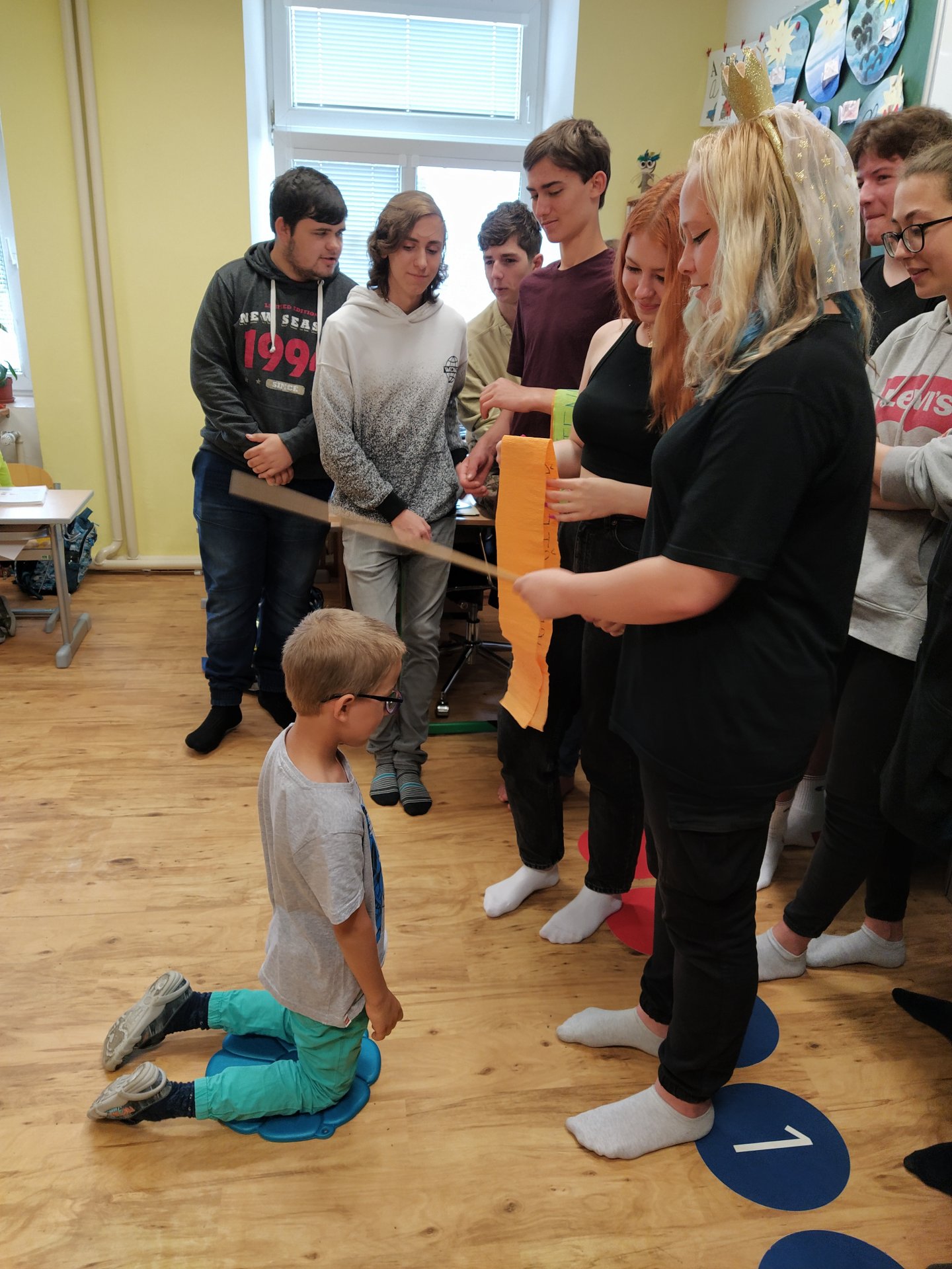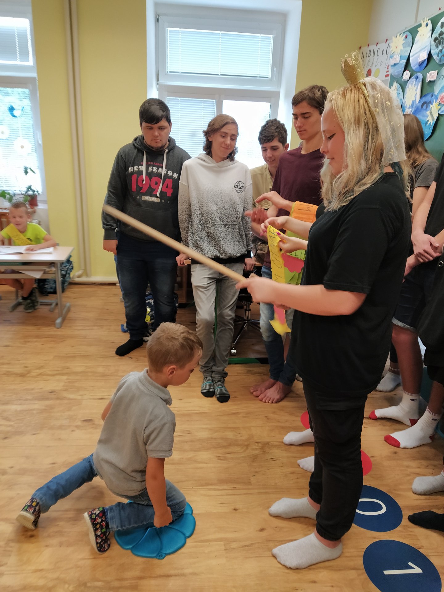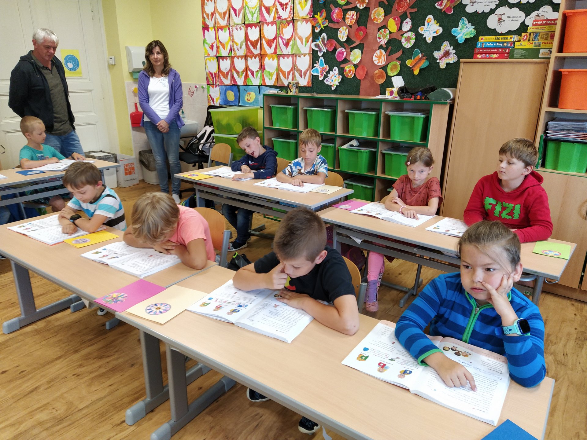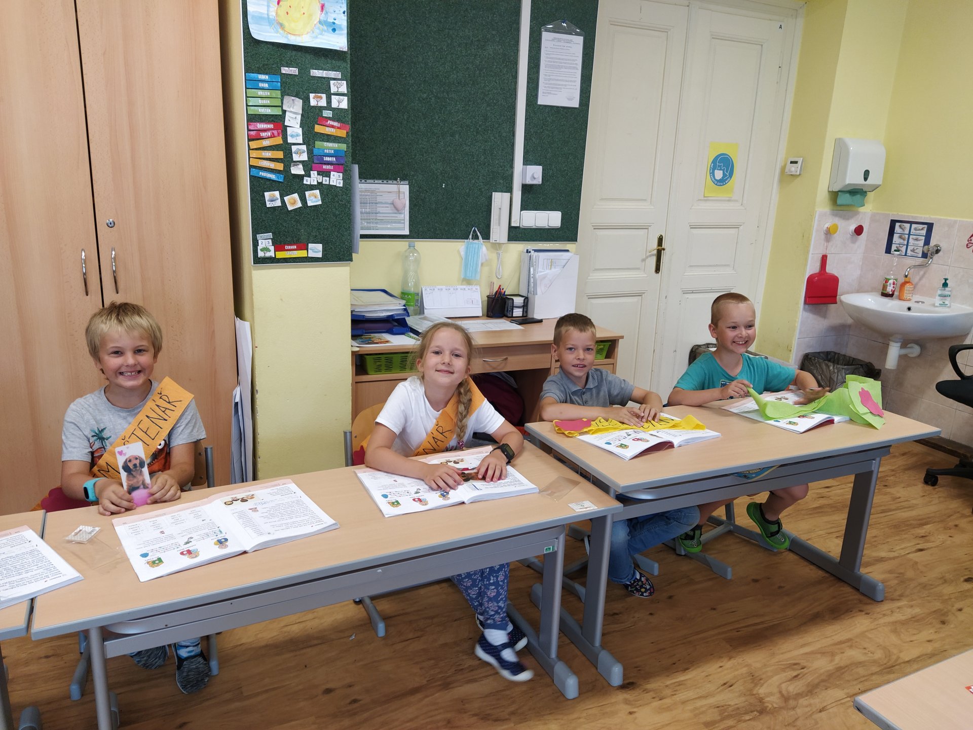 Ve středu 23.června došlo k netradičnímu setkání. Za prvňáčky přijeli ze Škvorce nejstarší žáci naší školy, deváťáci. Prvňáčci přečetli úryvek ze Slabikáře, za který je potom královna se svými pomocníky pasovala na čtenáře. Malí čtenáři dostali šerpu a záložku do knížky. Prvňáčci naopak dali každému staršímu kamarádovi na památku přání s básničkou, kterou sami napsali. Děkujeme za milou návštěvu a hezkou akci pro prvňáčky!