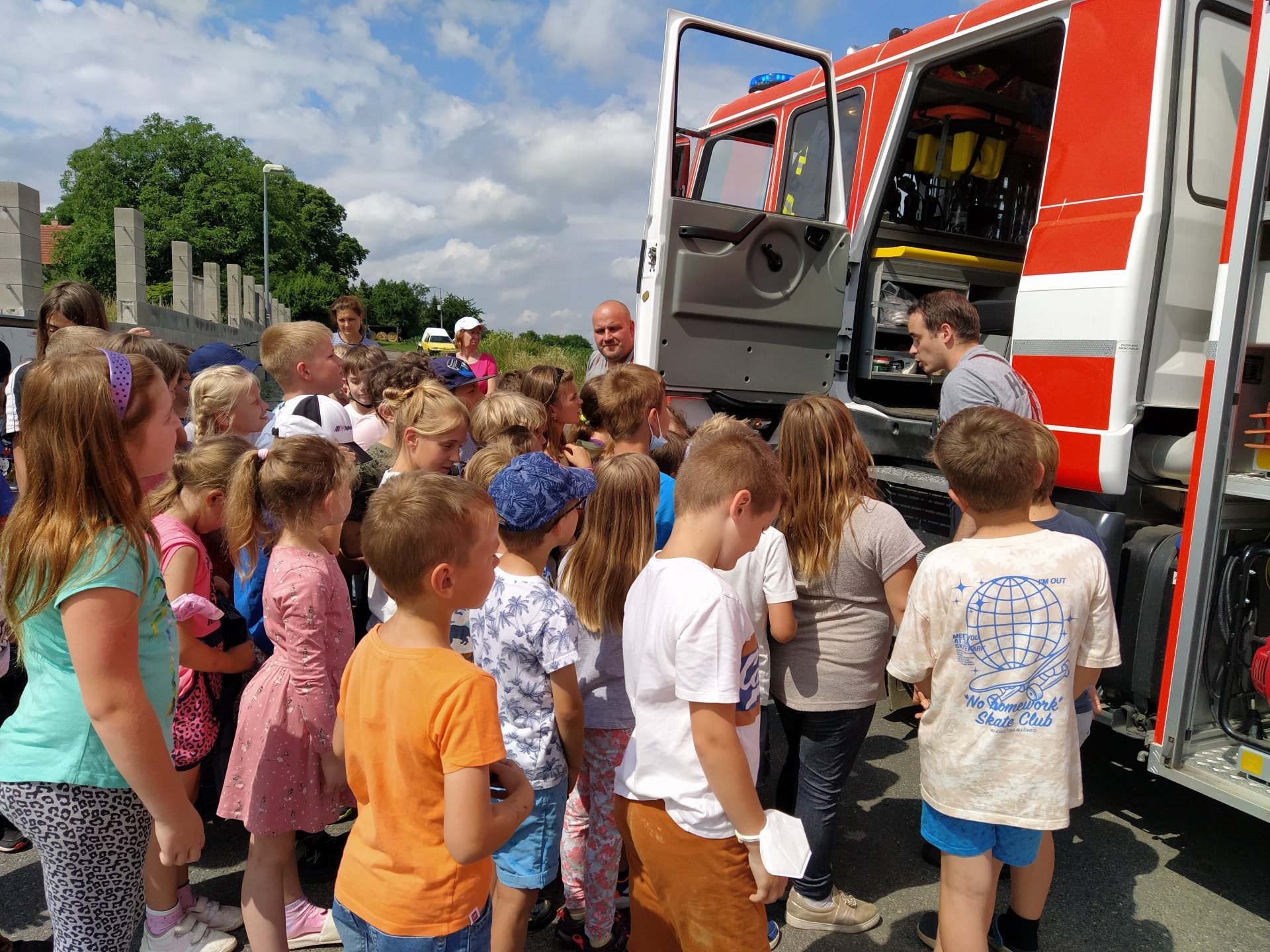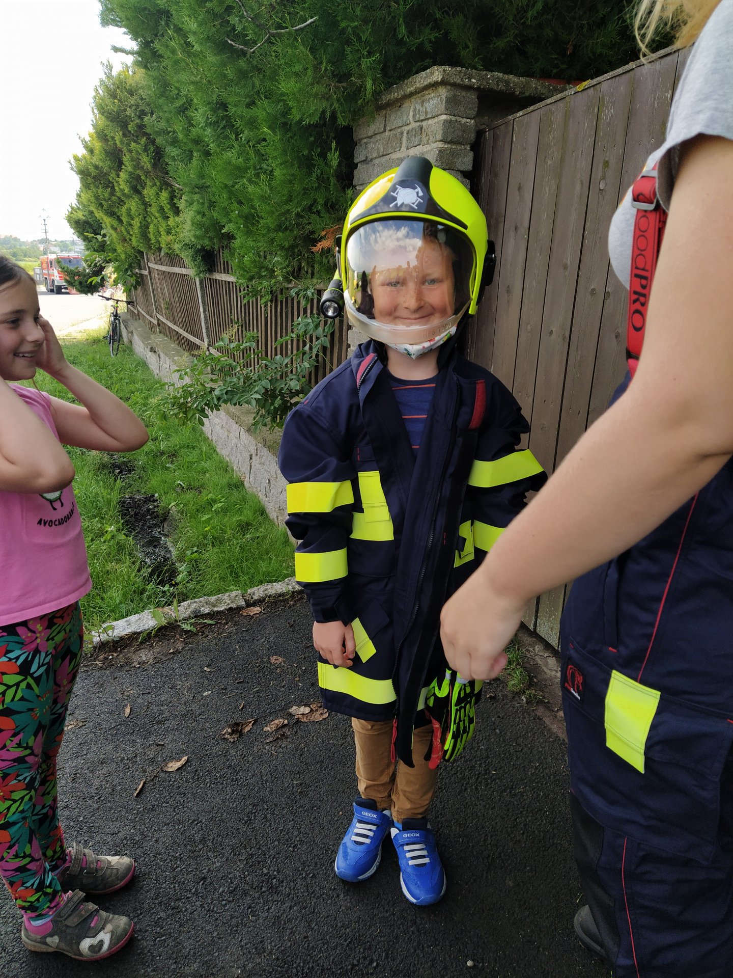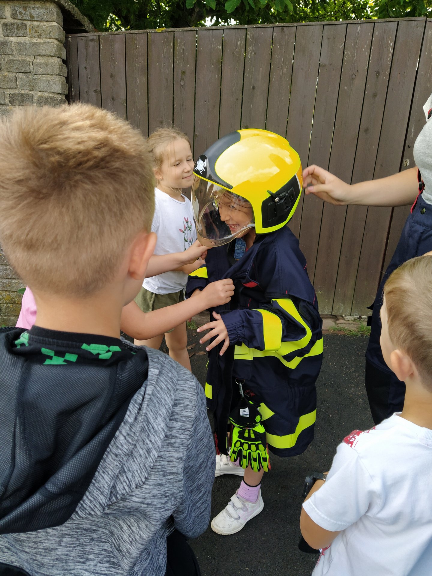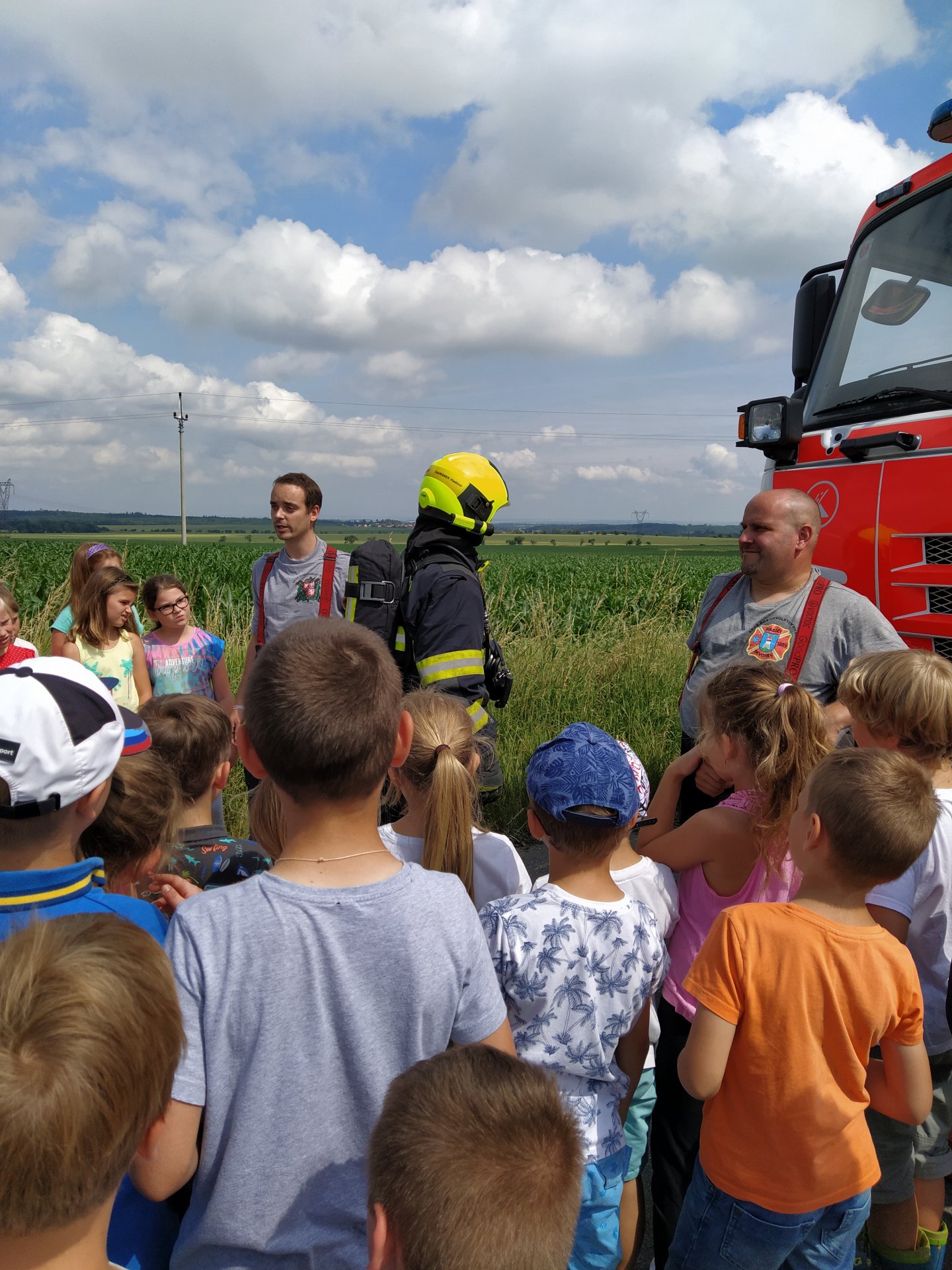 Předposlední školní den nám byl ve škole vyhlášen požární poplach. Naštěstí nikde nehořelo, šlo jen o nácvik opuštění budovy. S ostatními třídami jsme ho zvládli bez komplikací a poměrně rychle. Po návratu do tříd jsme si ještě chvilku pohráli. Od zábavy nás vyrušily hasičské sirény, které nás vylákaly na prostranství pod školou, kde nám hasička Zuzka a Týnka ukázaly hasičské oblečení, pověděly o hasičském kroužku a jejich sportovních aktivitách a soutěžích. Pak jsme se vystřídali s druhou skupinkou, kde nám hasič Honza ukázal auto a jeho veškerou výbavu. Spousta z nás se dozvěděla mnoho nových a zajímavých informací. Těšíme se na další podobné setkání, v duchu povídání, ne nutného opravdového zásahu.