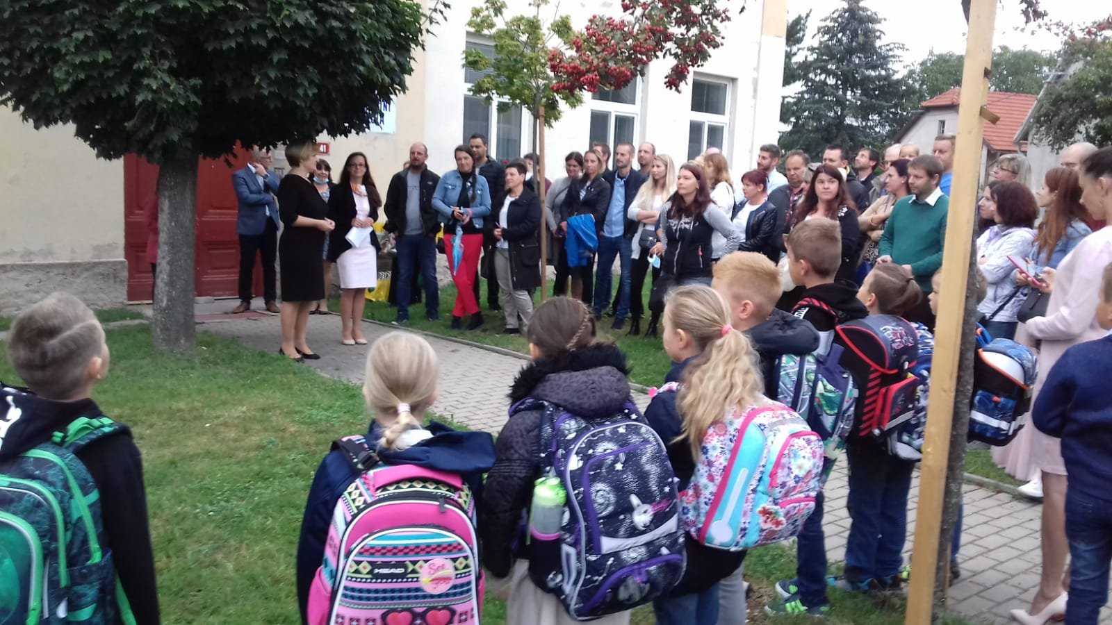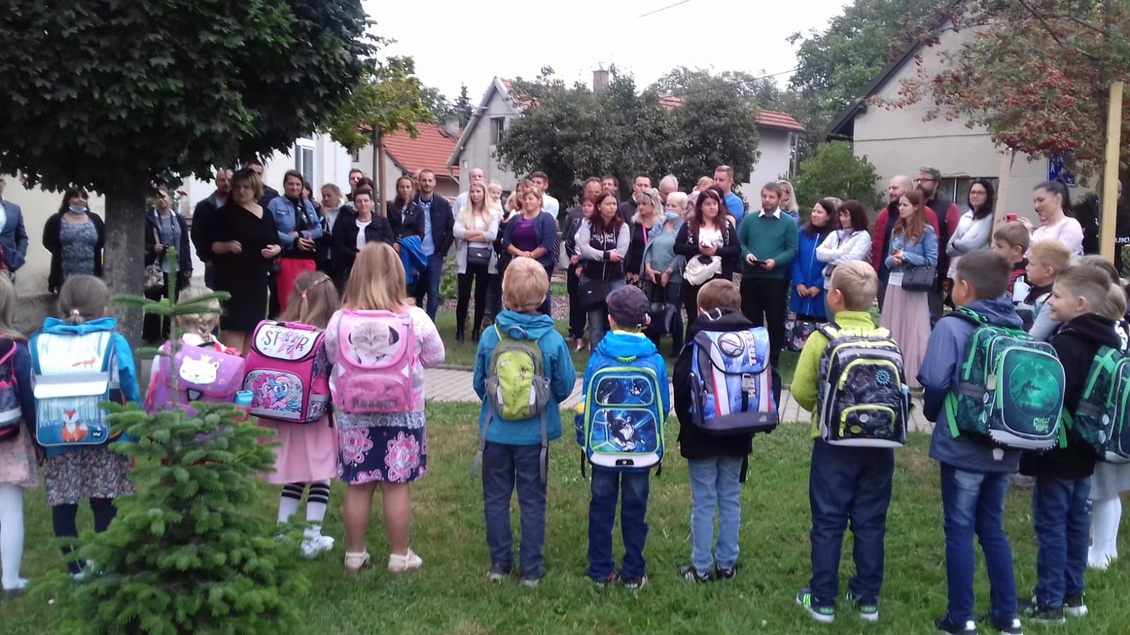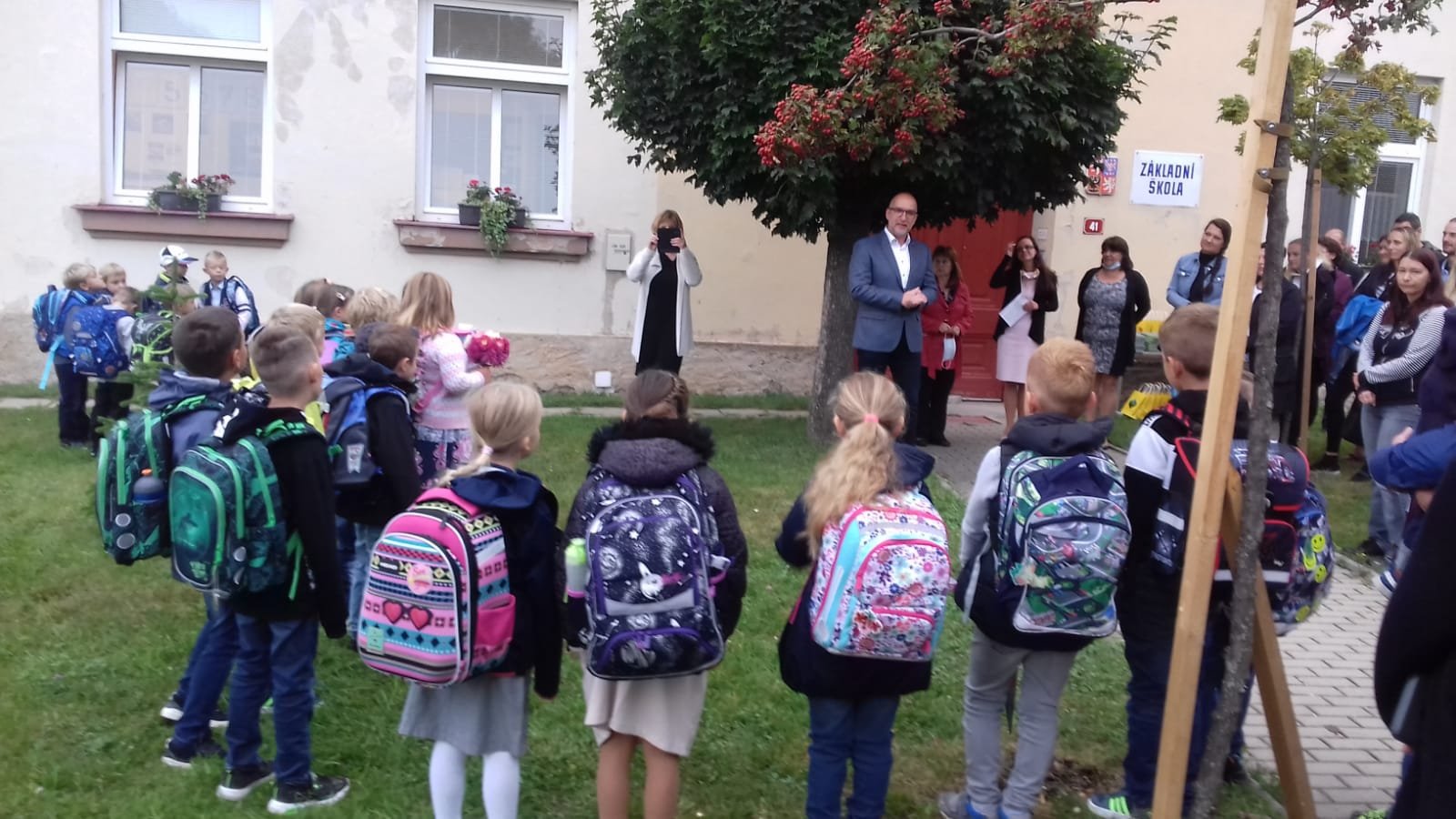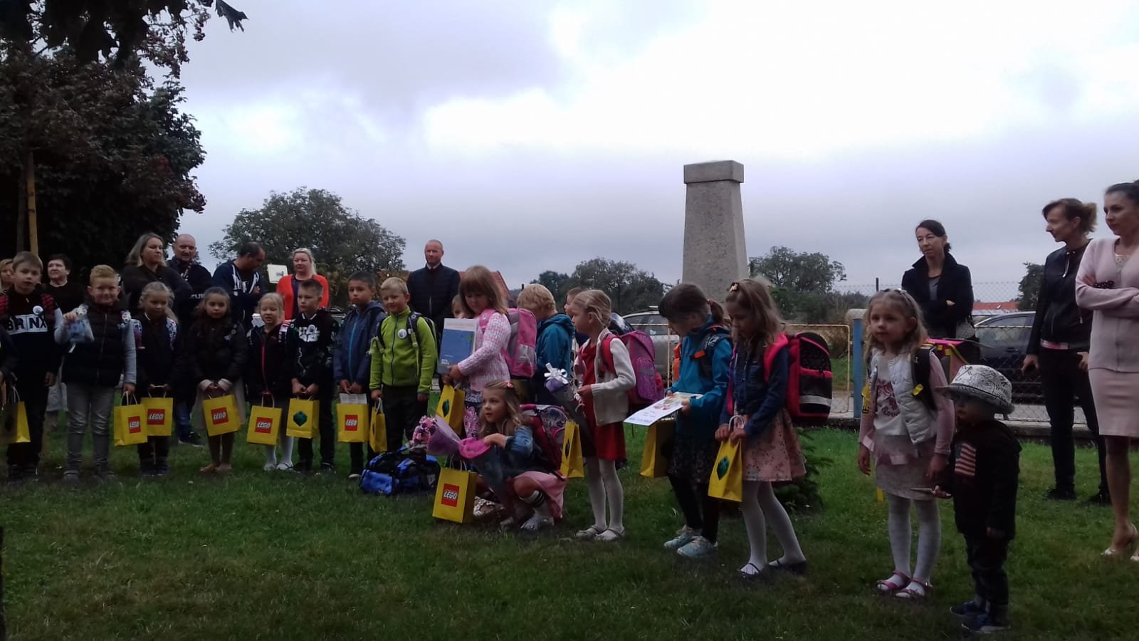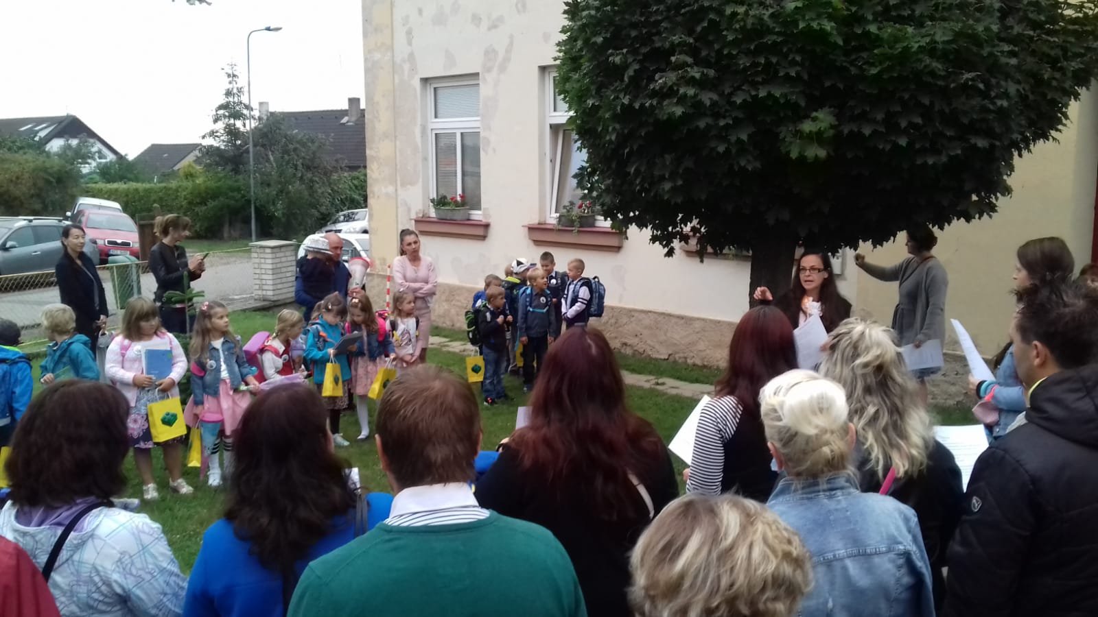 Sluníčko sice nesvítilo, ale všechny oči prvňáčků byly rozzářené a na tvářích spousta radosti. Jak jinak mělo proběhnout přivítání, než se svou novou paní učitelkou Mgr. Magdalénou Ryšavou, vychovatelkou Boženou Gramanovou, asistentkou Markétou Kulhavou, a to za podpory zástupce Městyse Škvorec Ing. Z. Doboše.