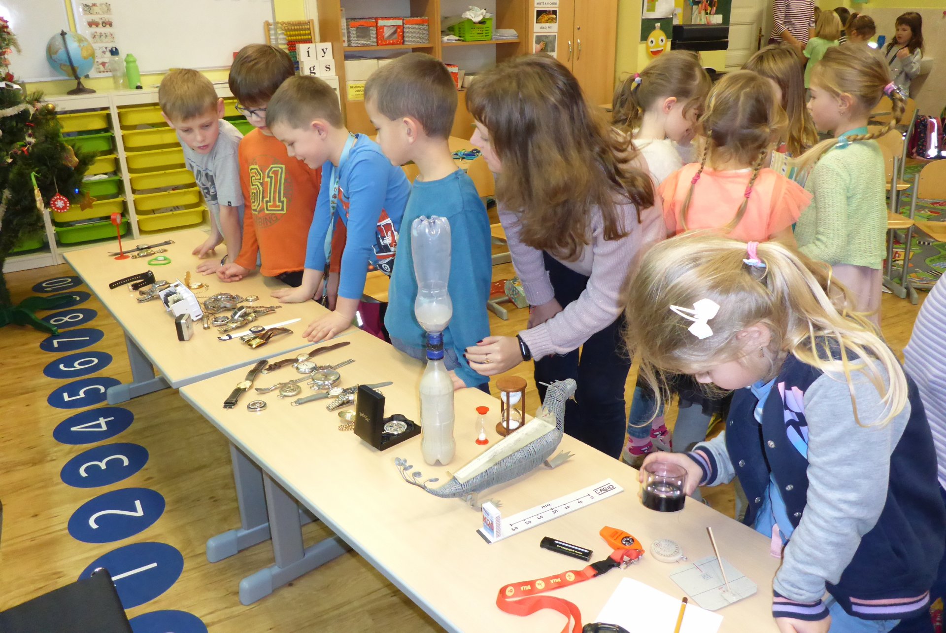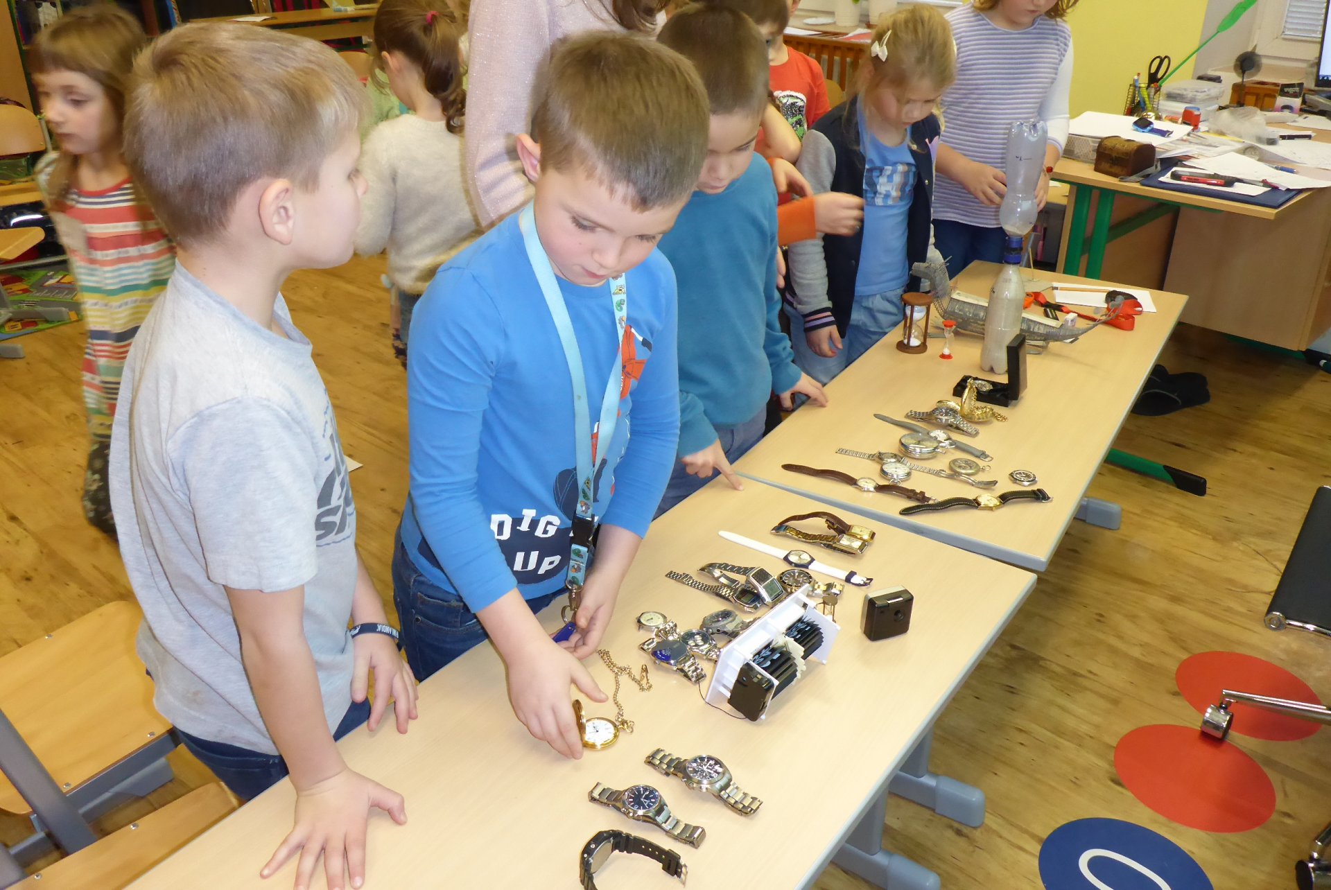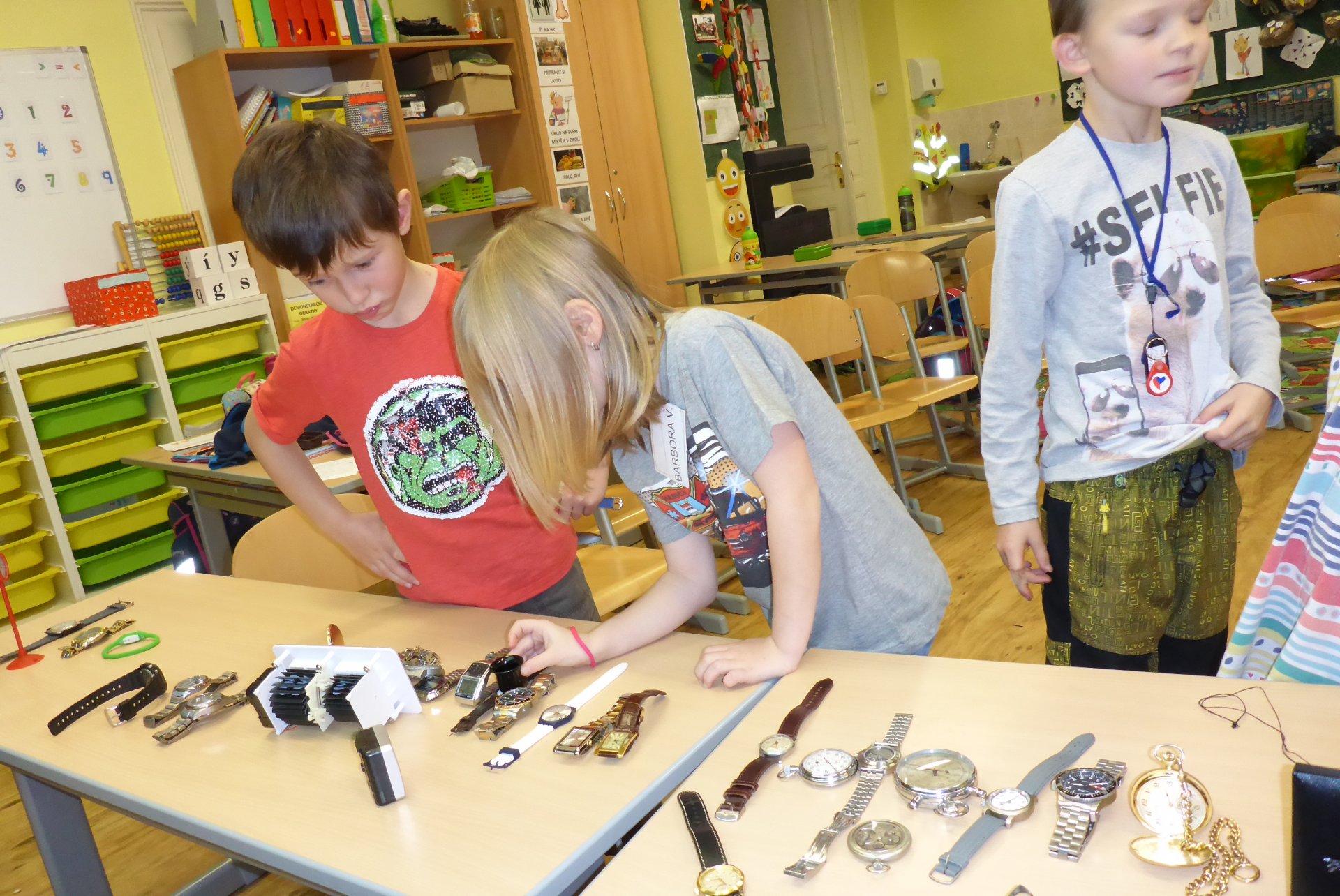 Poslední hodinu se děti v přípravě na témata v matematice a prvouce dozvěděly mnoho zajímavého o čase a hodinách; k vidění byly i takové rarity, jako replika 3000 let starých čínských ohňových hodin ve tvaru draka, hodinky pro nevidomé, hodinky pro kosmonauty či mechanické digitálky. Děti zapojily skoro všechny smysly - zrak (ukázky včetně hodinových strojků), sluch (tikání, zvonění), čich (vonná tyčinka v doutnákových hodinách), hmat (hmatové hodinky pro nevidomé). Pouze k ochutnání žádné hodinky nebyly... :-)