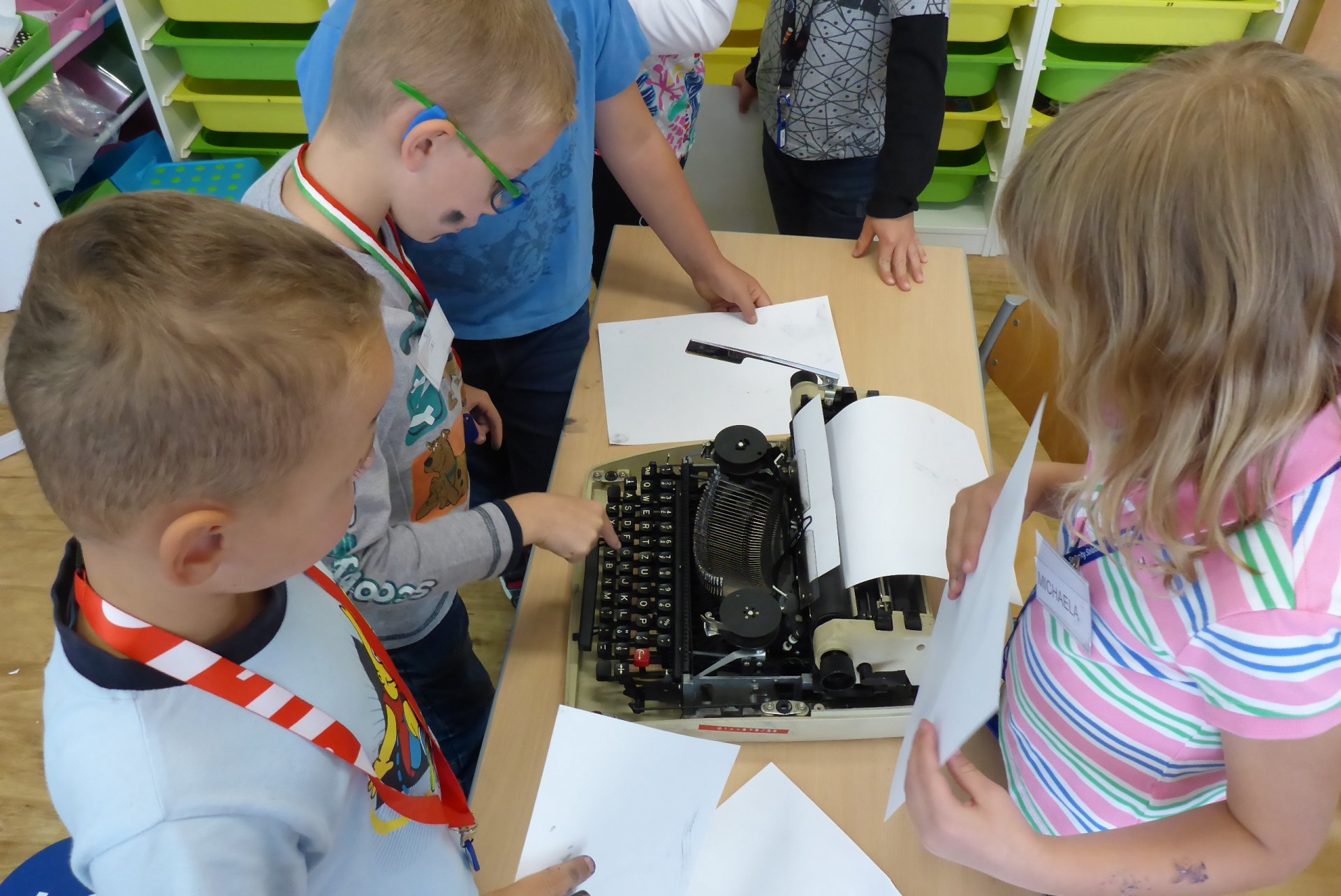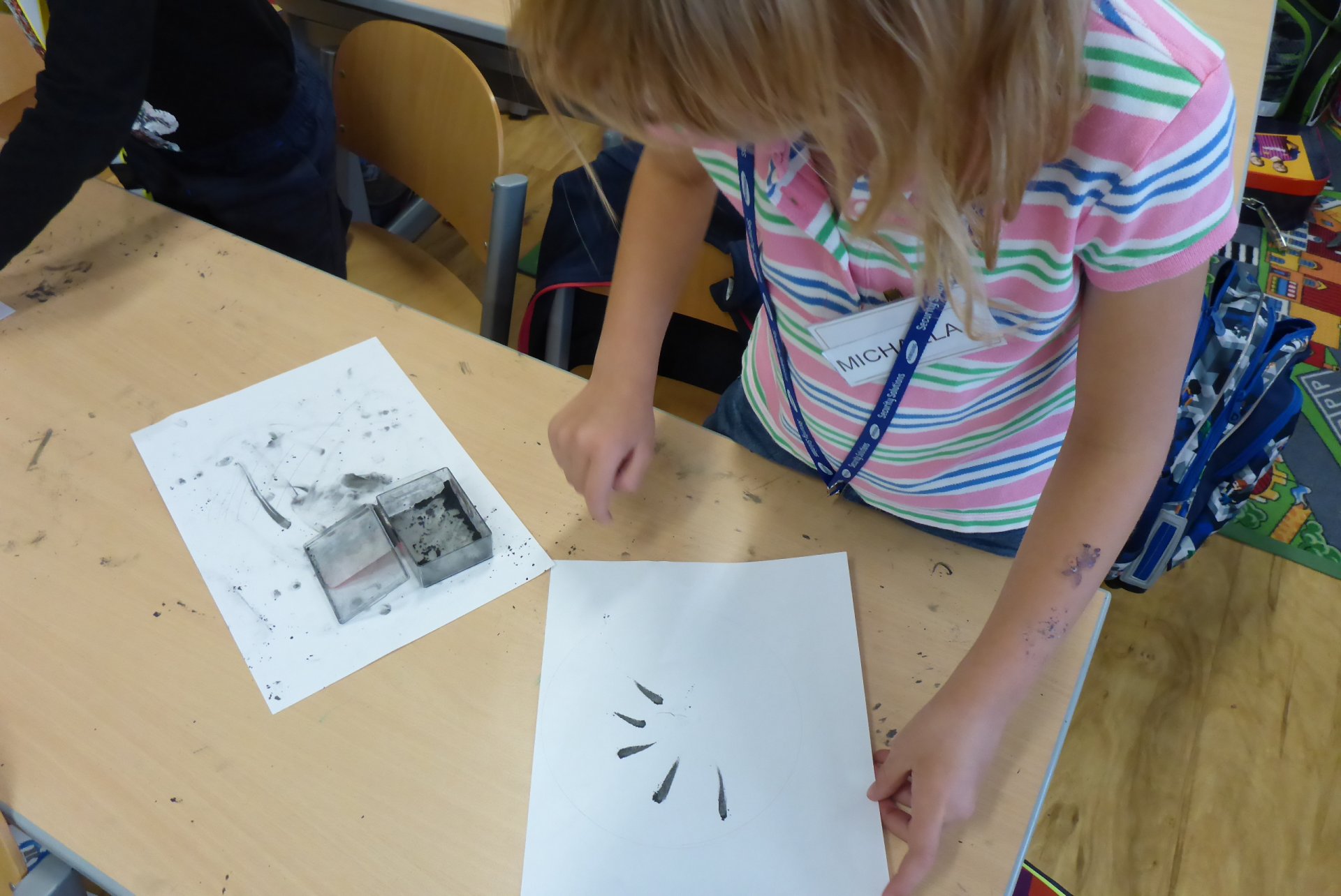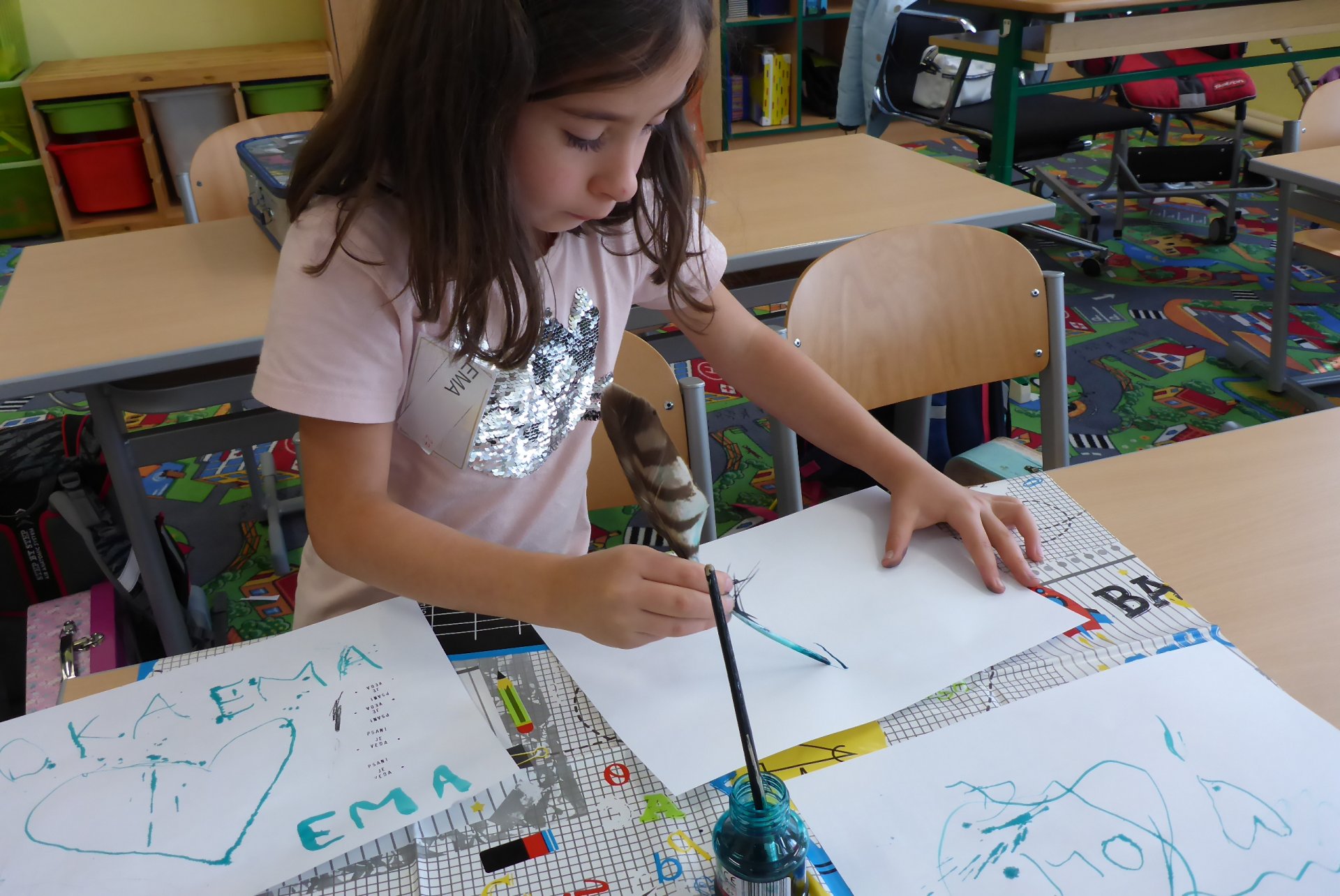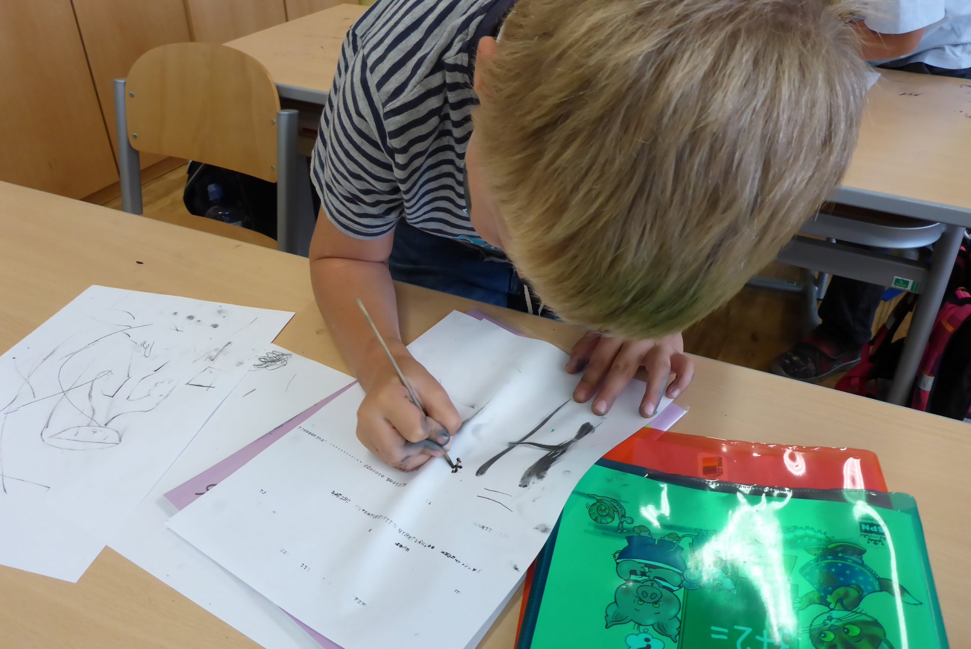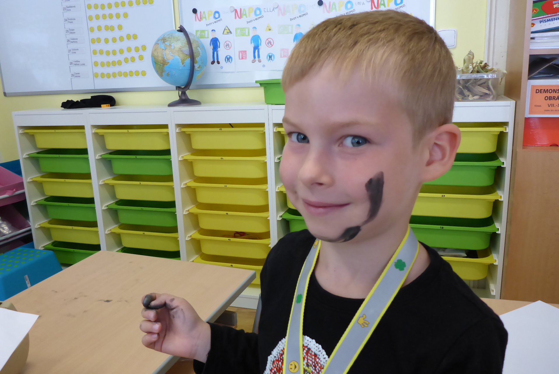 Pokud se Vám dnes děti vrátily domů nepatrně umouněné či různě zbarvené, vězte, že za to může naše dnešní písařská dílna. Vyzkoušeli jsme si totiž veškeré psací náčiní počínaje ohořelým dřívkem a konče psacím pianem :-)