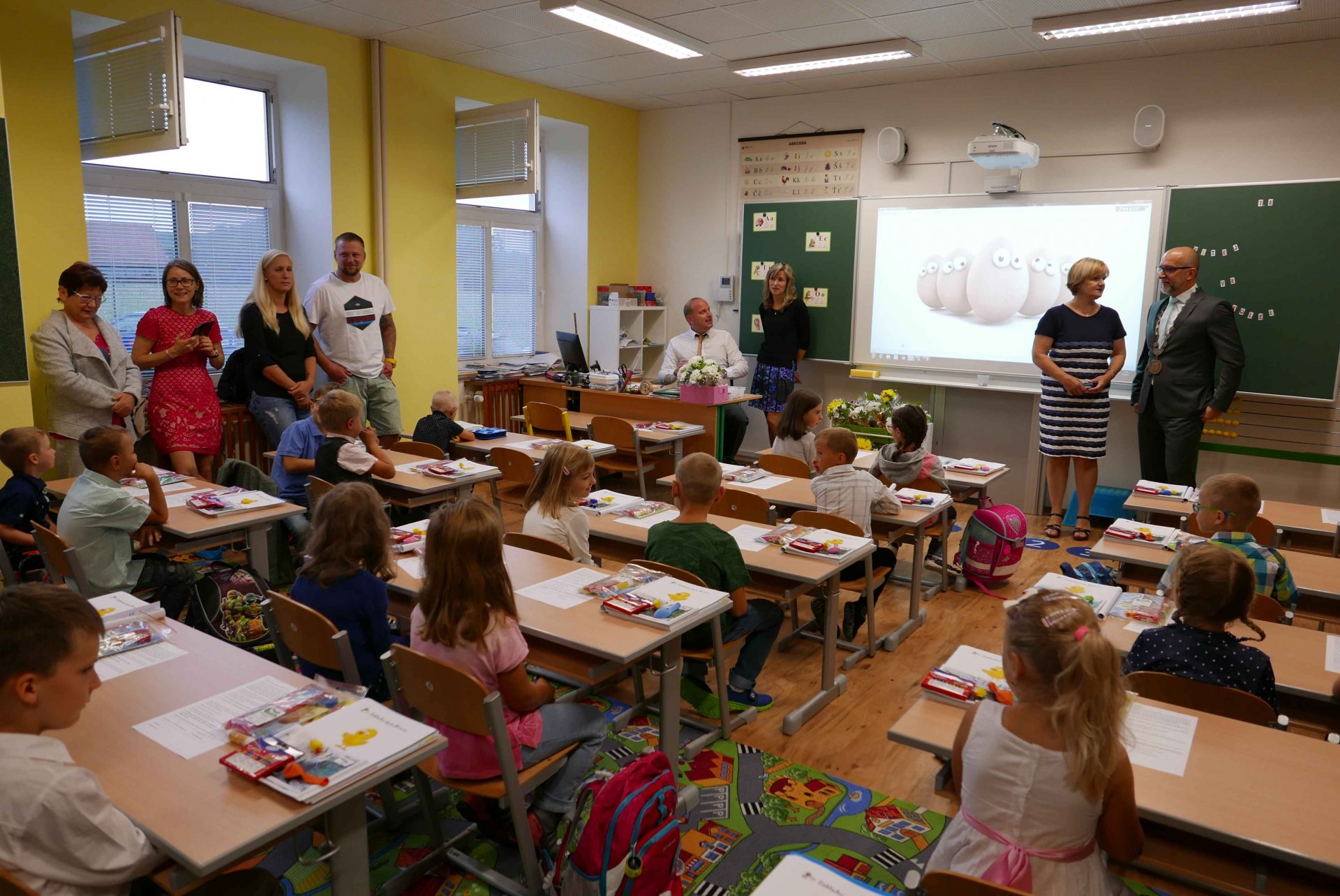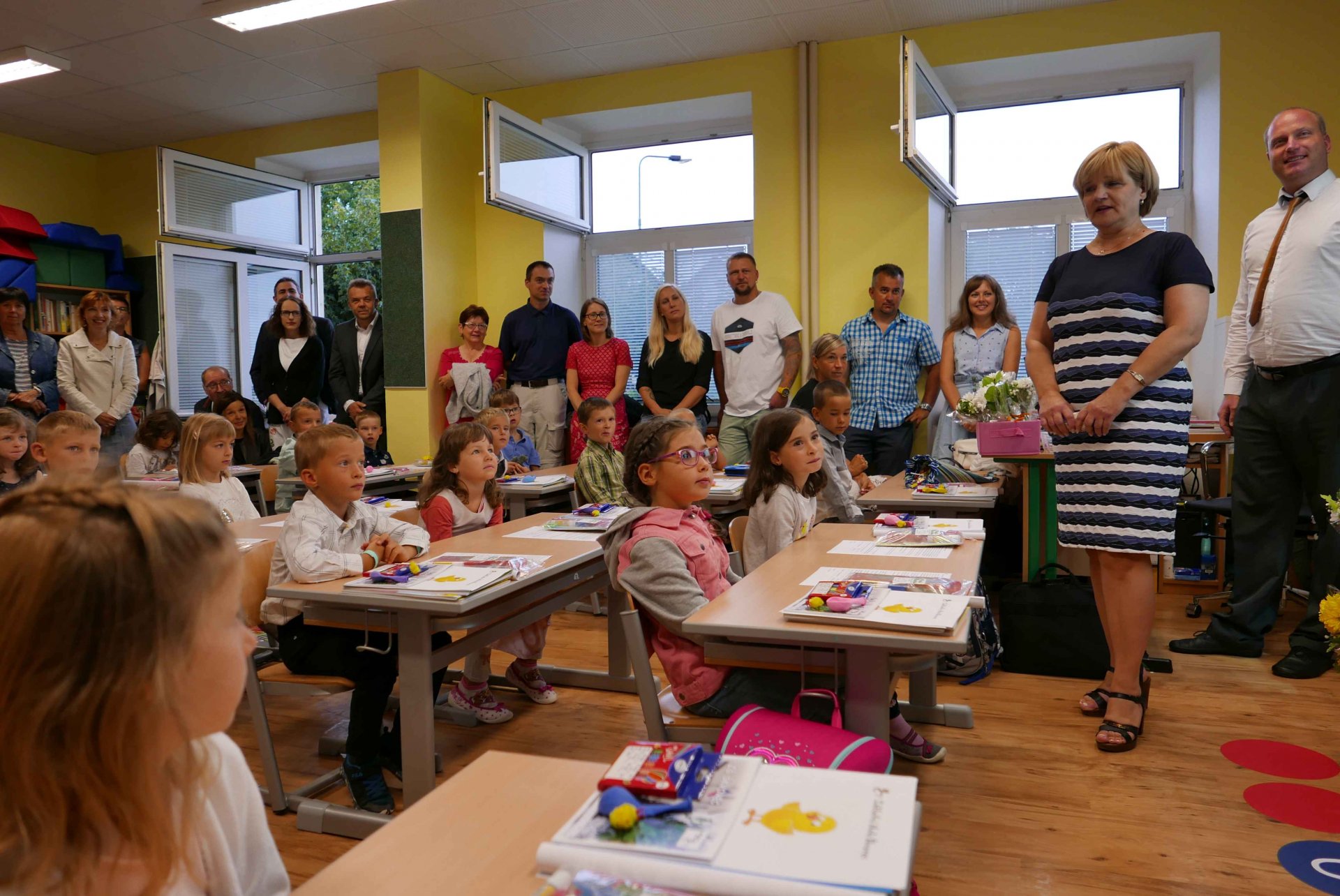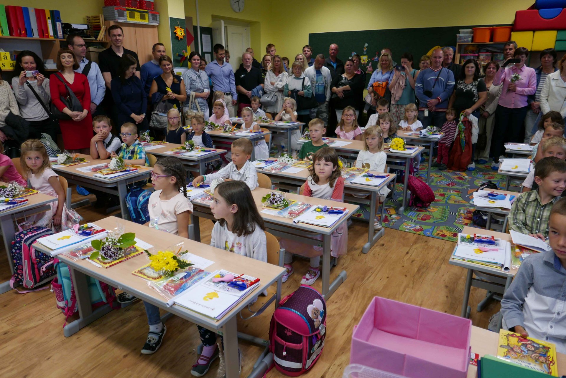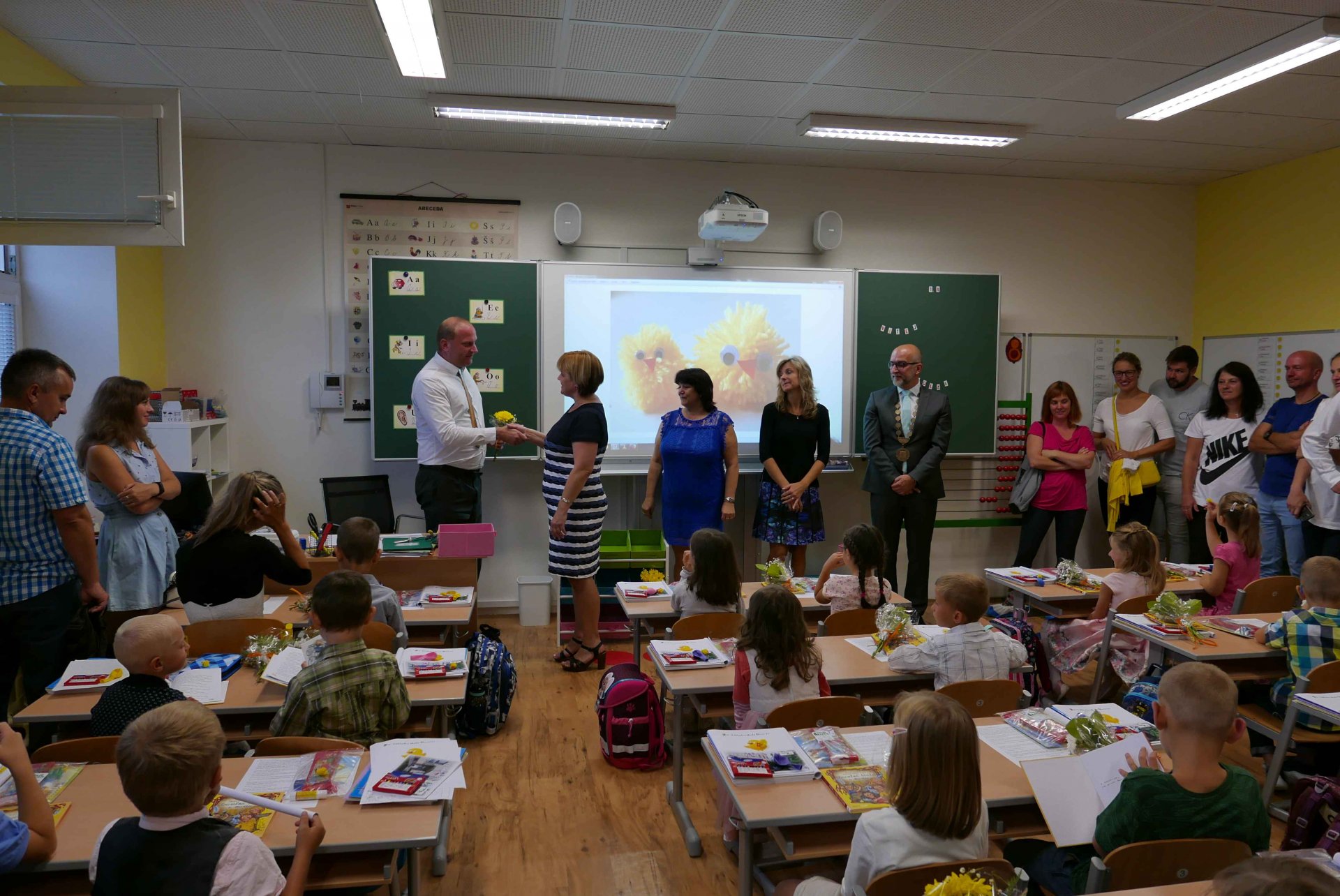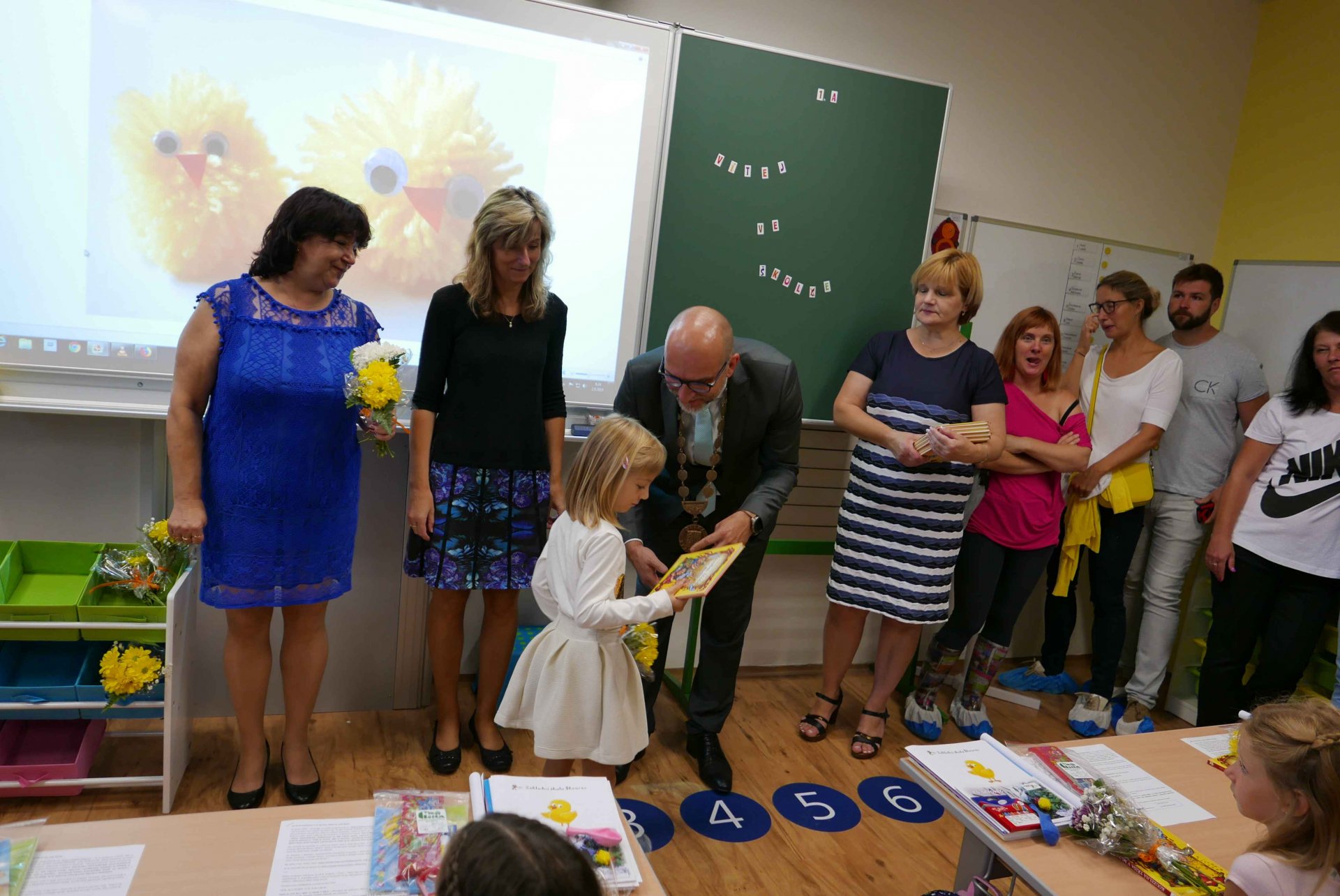 Přestože jsme třída "kuřátek", dne 2/9 byla třída 1.A zaplněna spíše jako krabička "sardinek". Do školy totiž poprvé přišlo 29 prvňáčků a jejich rodiče či prarodiče. I školních dospěláků bylo požehnaně - kromě mne, tř. učitele, nás poctila návštěvou i paní ředitelka, pan zastupitel Doboš, 3 kolegyně ze š. družiny a p. asistentka. Každý žáček dostal kytici a pěknou knížku (málem jsme do 1.A přijali i p. ředitelku ;-)) a zazpívali jsme si naši kuřecí hymnu.