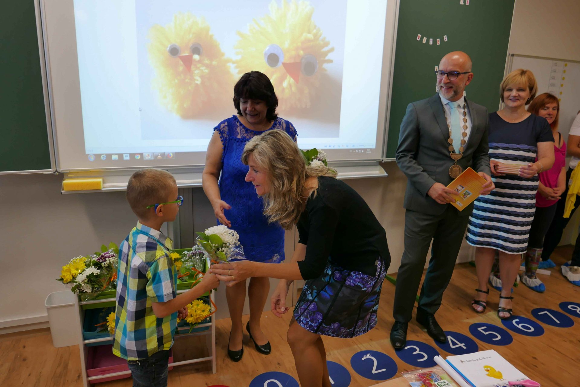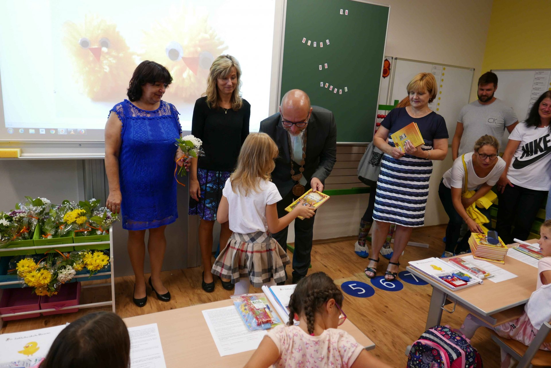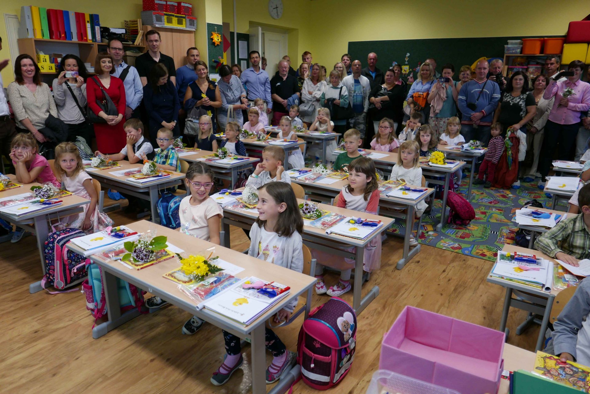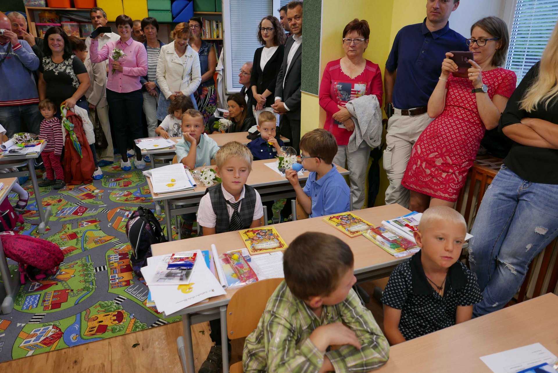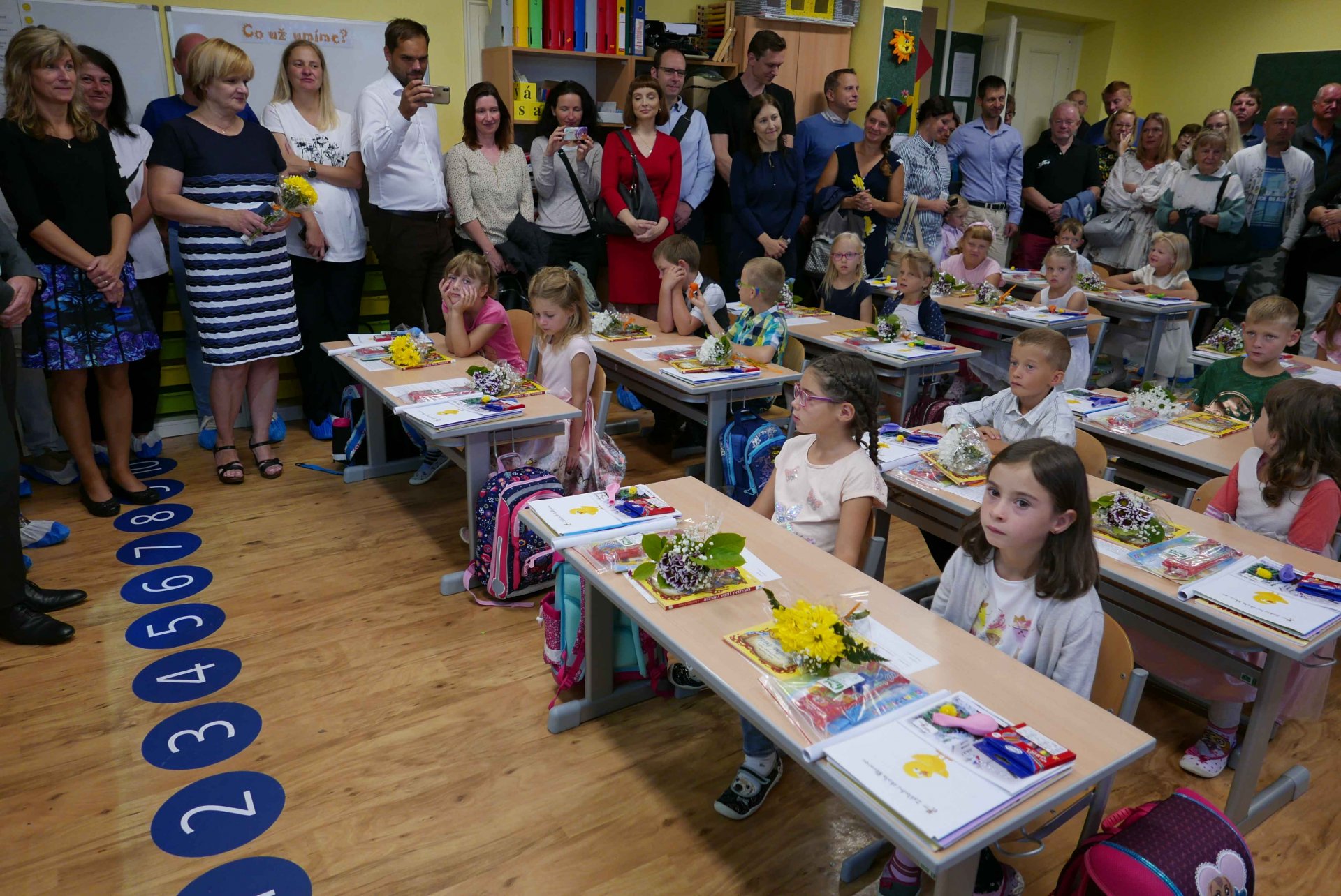 Přestože jsme třída "kuřátek", dne 2/9 byla třída 1.A zaplněna spíše jako krabička "sardinek". Do školy totiž poprvé přišlo 29 prvňáčků a jejich rodiče či prarodiče. I školních dospěláků bylo požehnaně - kromě mne, tř. učitele, nás poctila návštěvou i paní ředitelka, pan zastupitel Doboš, 3 kolegyně ze š. družiny a p. asistentka. Každý žáček dostal kytici a pěknou knížku (málem jsme do 1.A přijali i p. ředitelku ;-)) a zazpívali jsme si naši kuřecí hymnu.