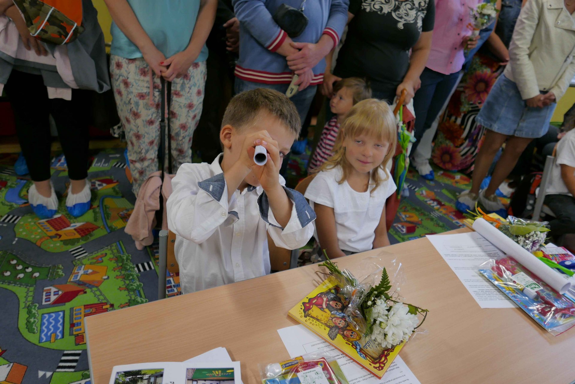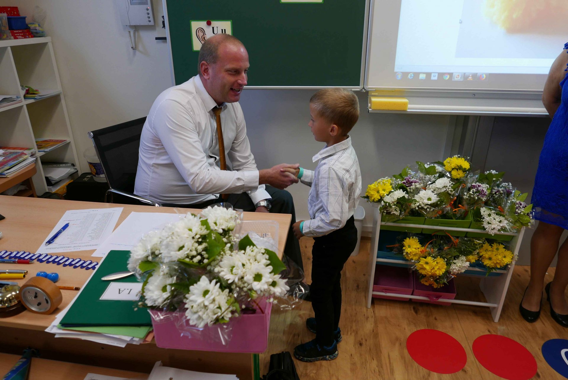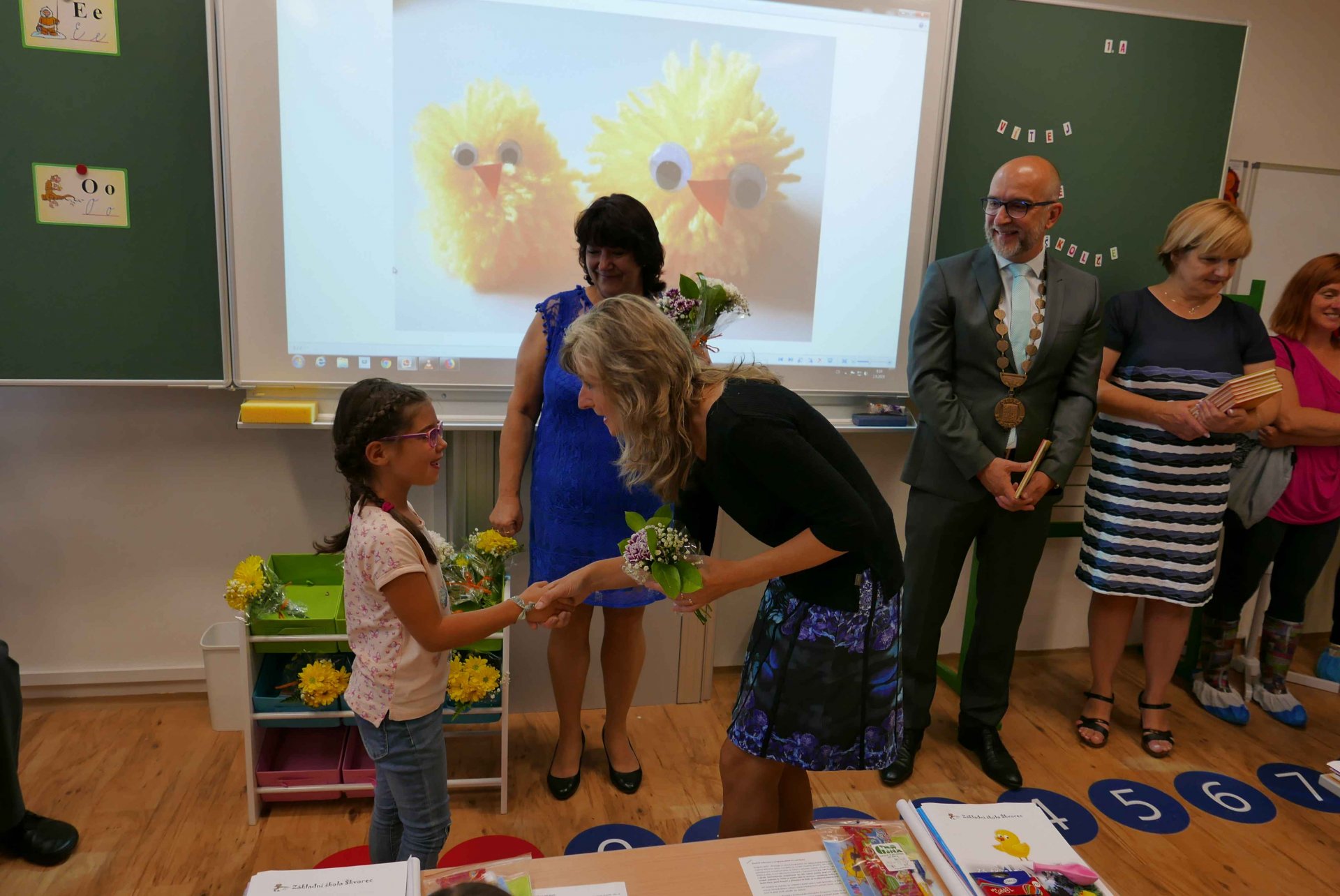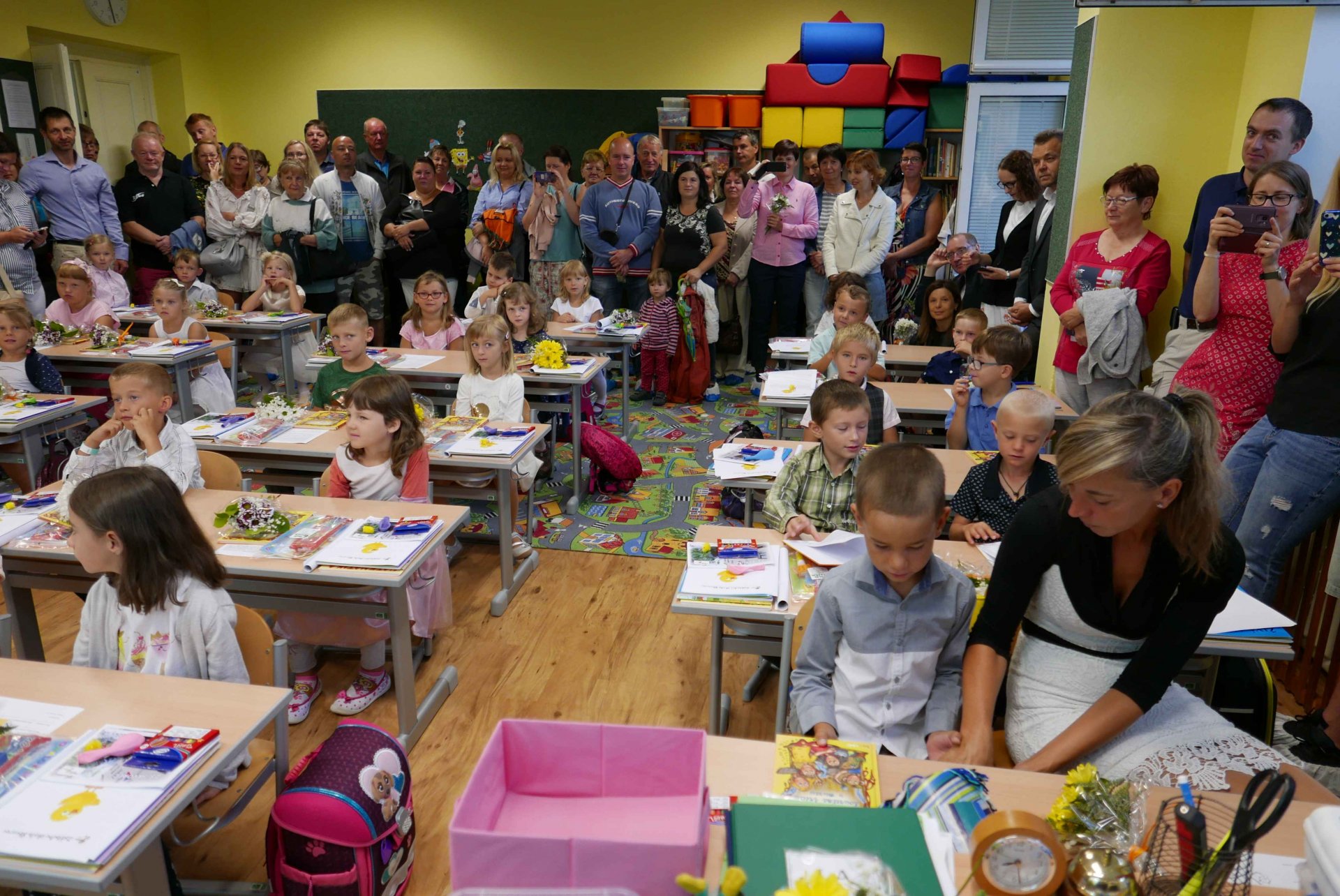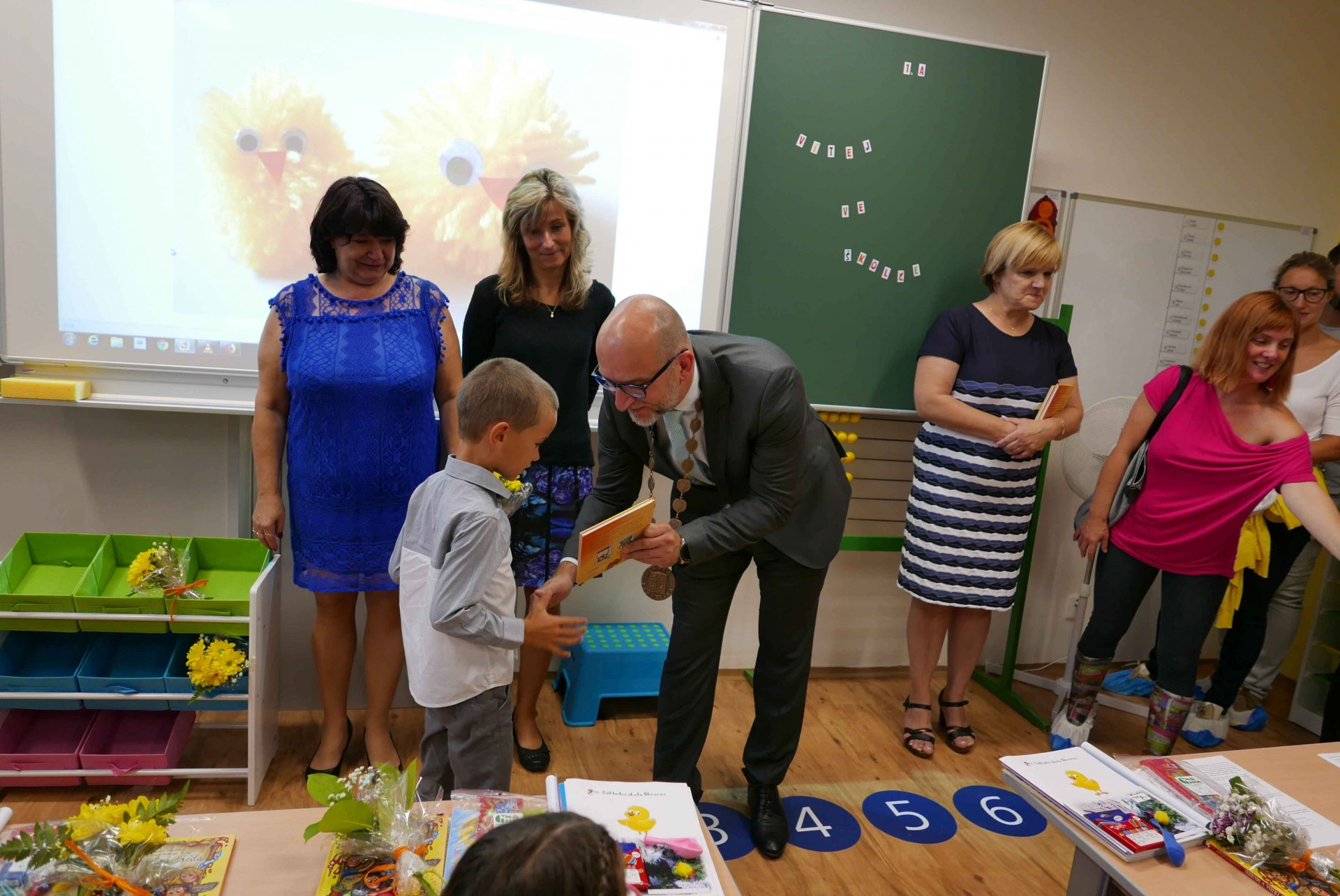 Přestože jsme třída "kuřátek", dne 2/9 byla třída 1.A zaplněna spíše jako krabička "sardinek". Do školy totiž poprvé přišlo 29 prvňáčků a jejich rodiče či prarodiče. I školních dospěláků bylo požehnaně - kromě mne, tř. učitele, nás poctila návštěvou i paní ředitelka, pan zastupitel Doboš, 3 kolegyně ze š. družiny a p. asistentka. Každý žáček dostal kytici a pěknou knížku (málem jsme do 1.A přijali i p. ředitelku ;-)) a zazpívali jsme si naši kuřecí hymnu.