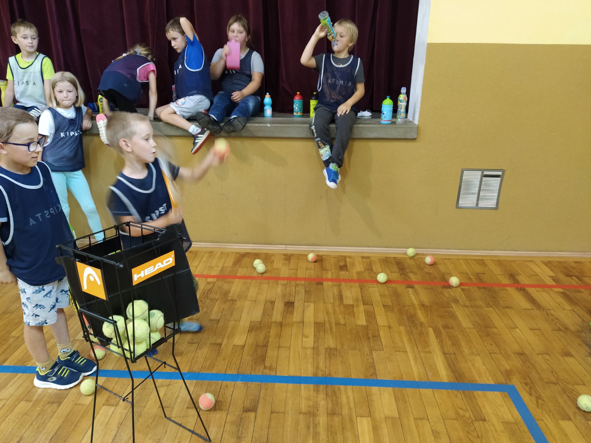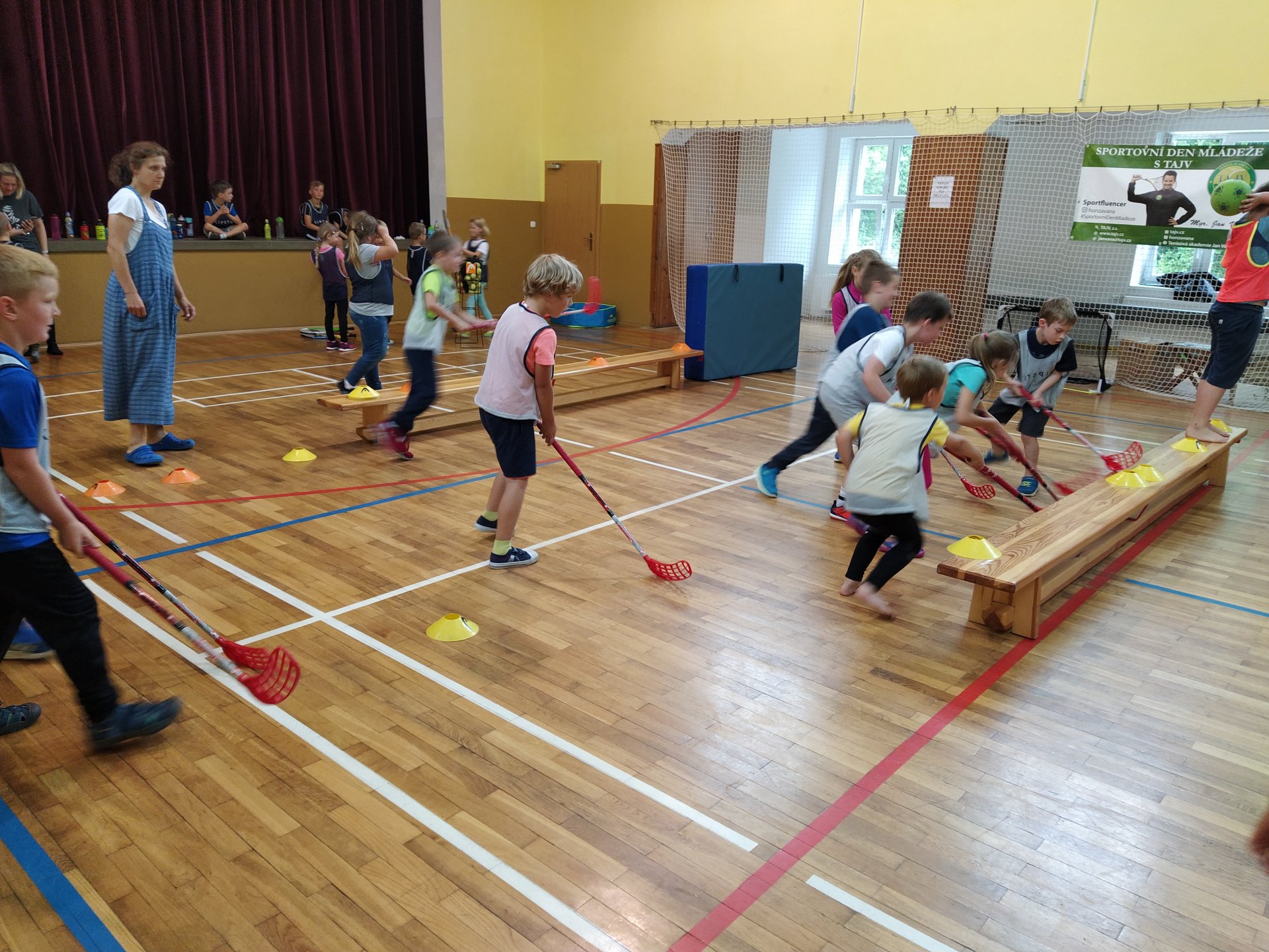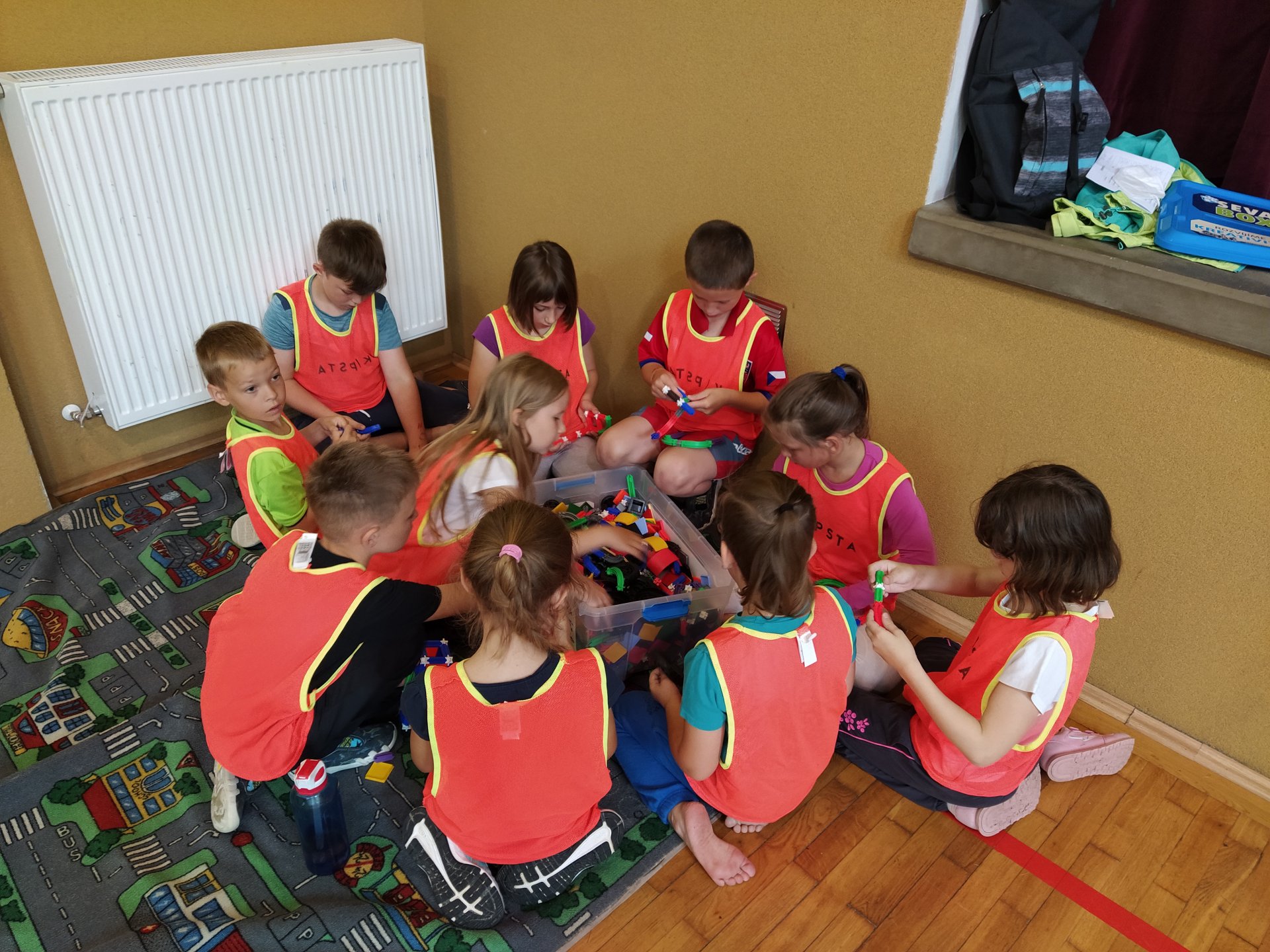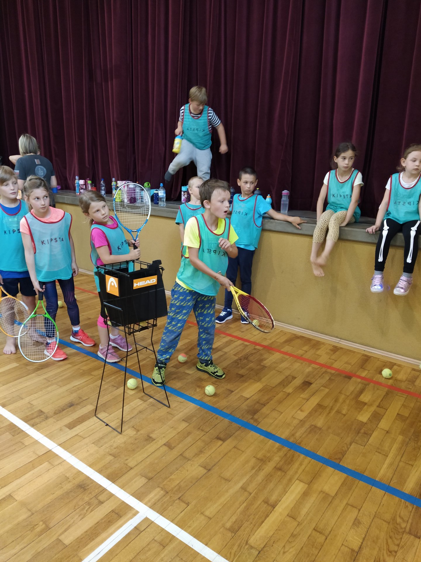 Vytvořili jsme celkem 5 smíšených týmů a rotačně si každý tým vyzkoušel 4 sporty - tenis, florbal, fotbal, házenou a jedno odpočinkové stanoviště (stavění stavebnice).