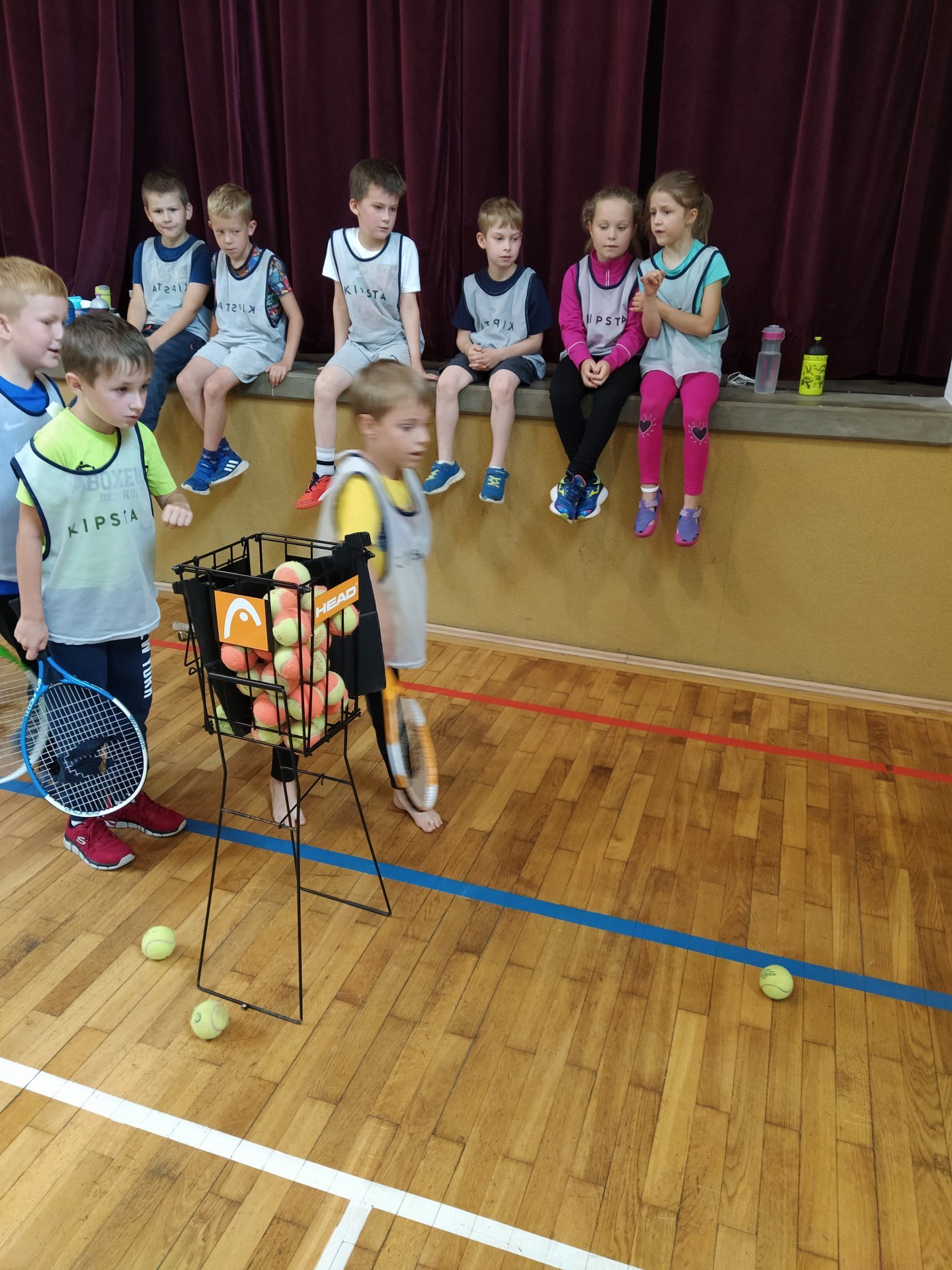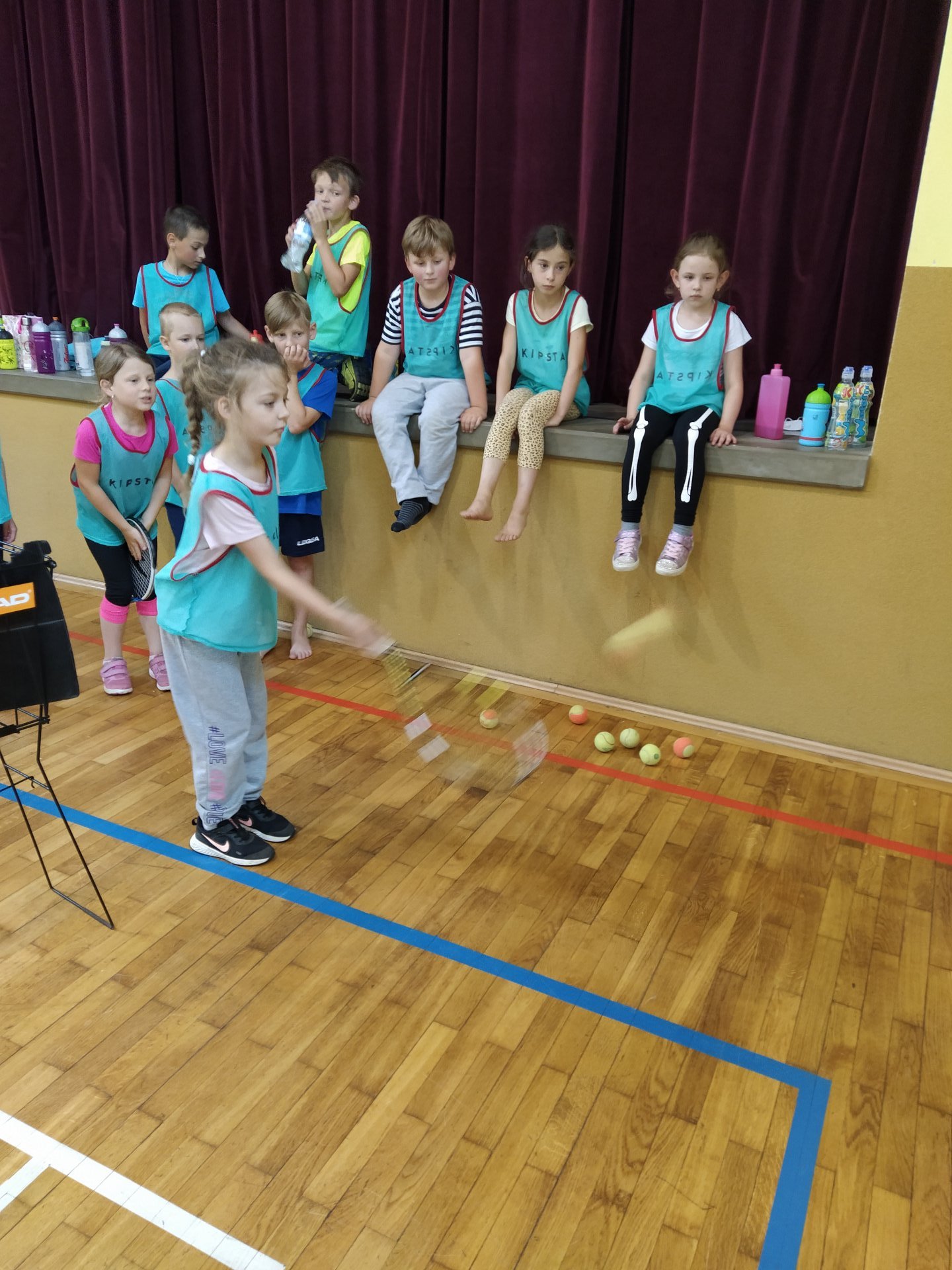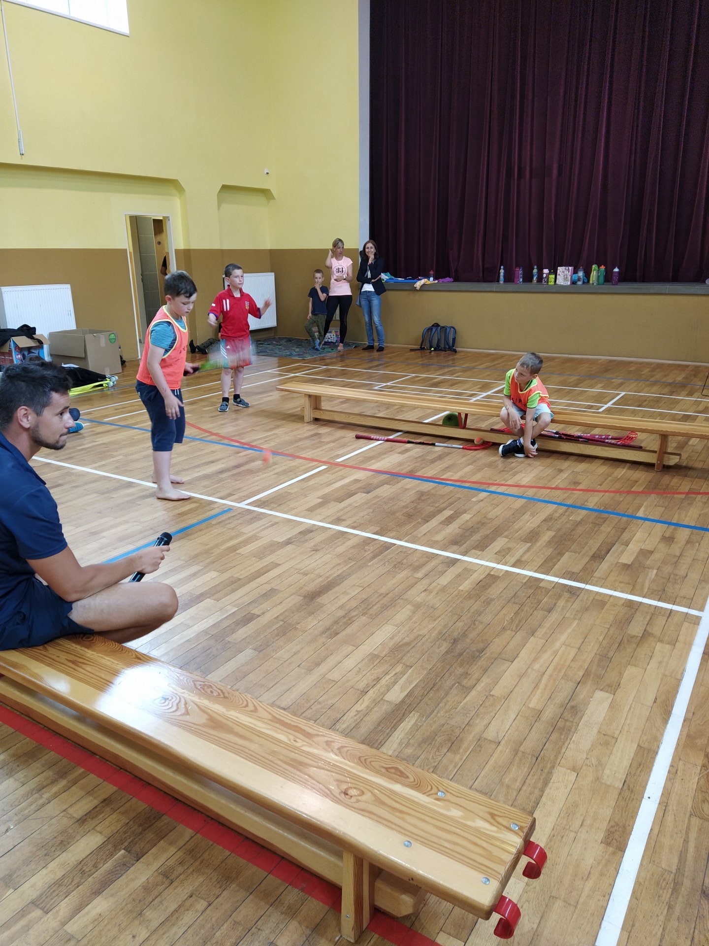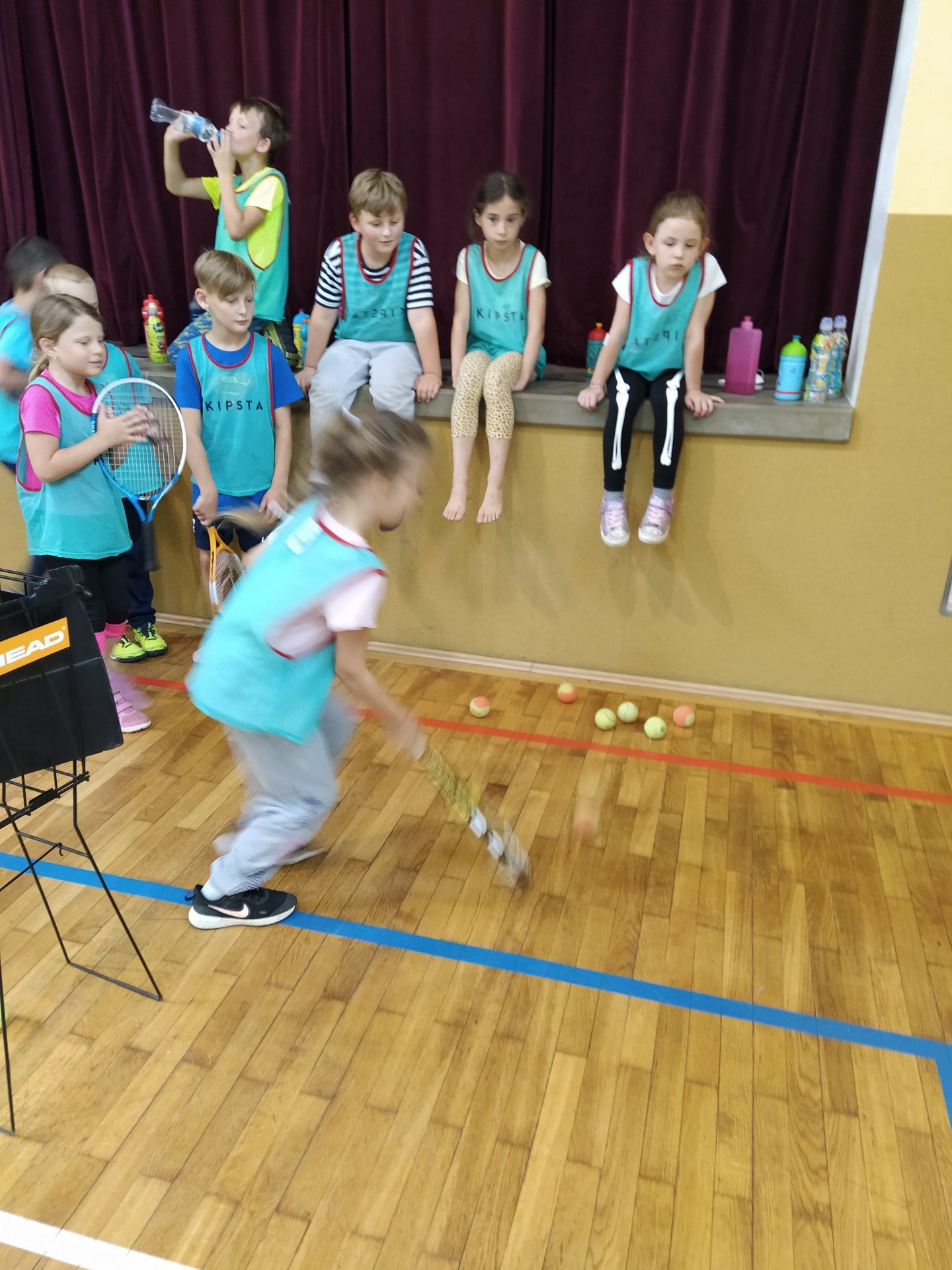 Vytvořili jsme celkem 5 smíšených týmů a rotačně si každý tým vyzkoušel 4 sporty - tenis, florbal, fotbal, házenou a jedno odpočinkové stanoviště (stavění stavebnice).