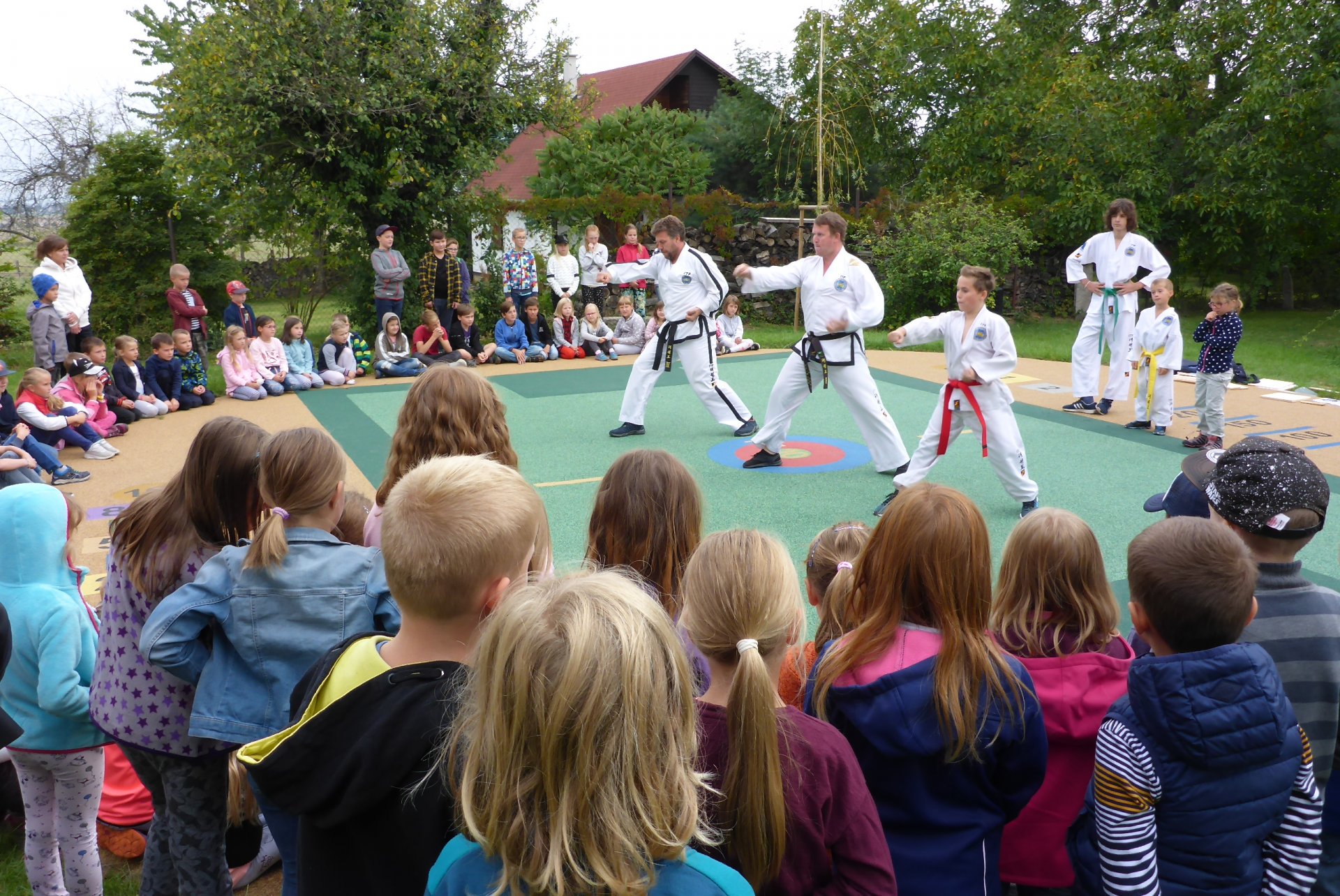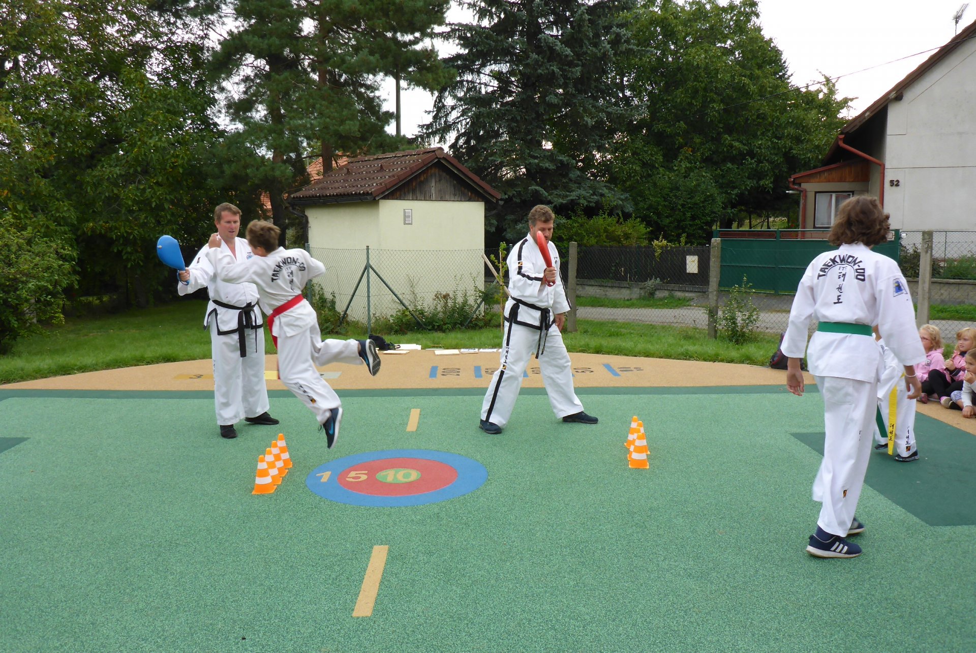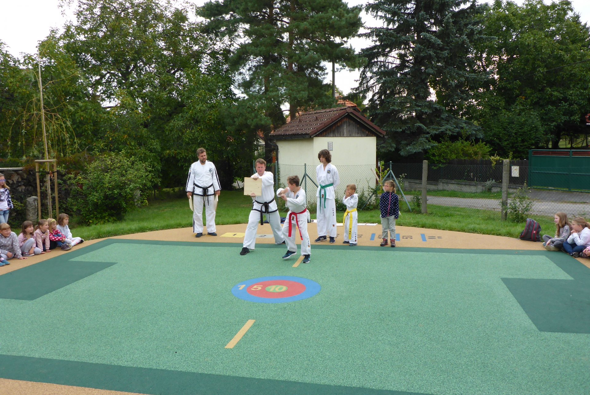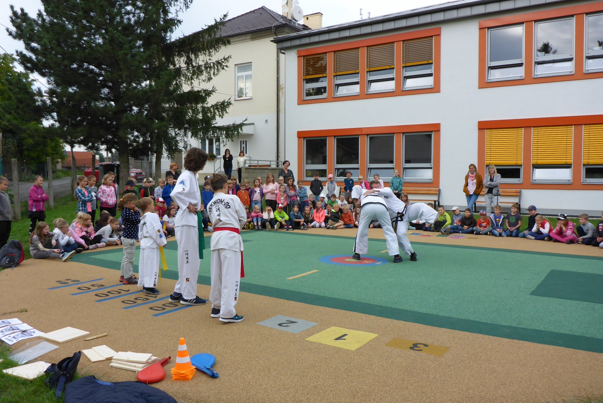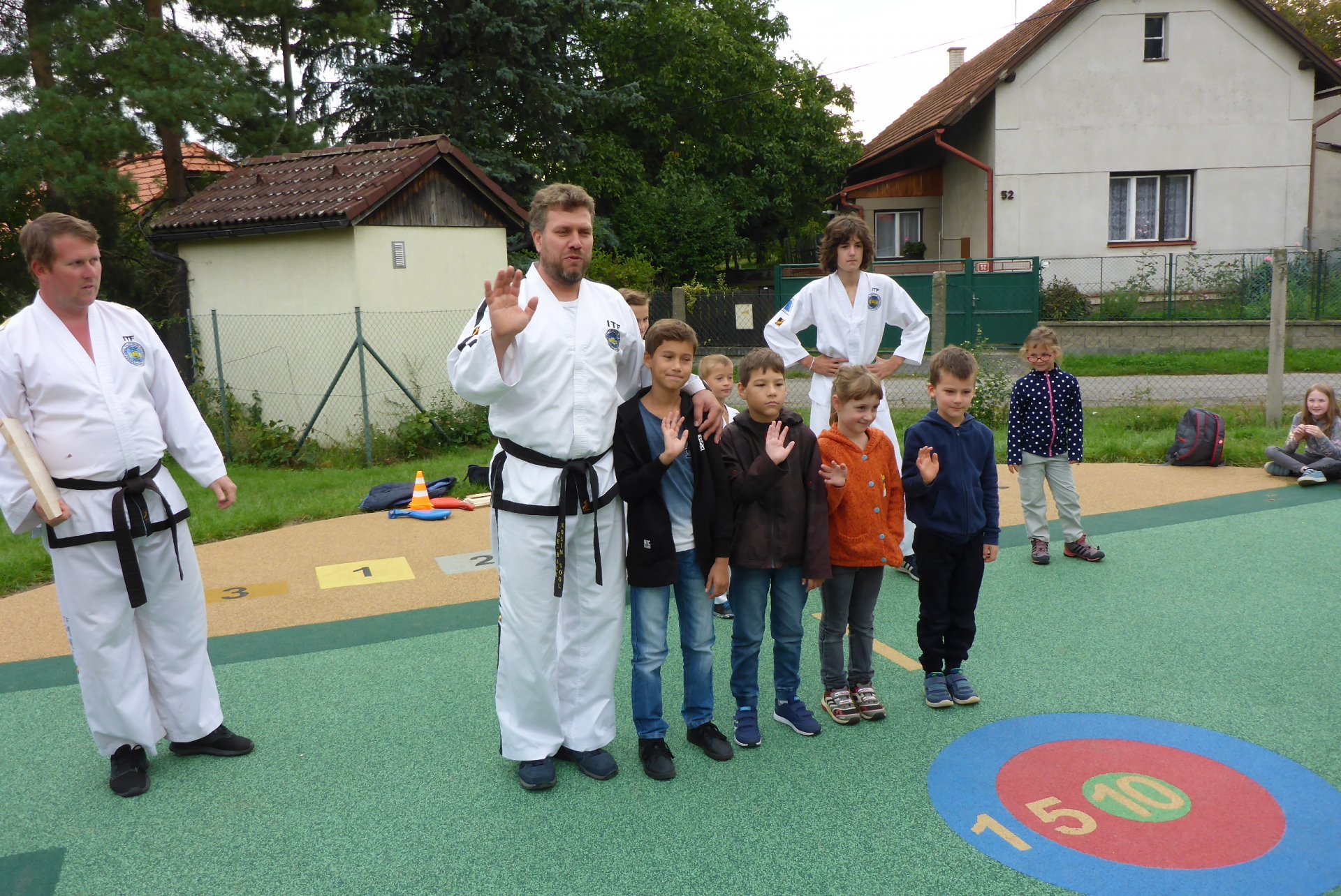 Na novém hřišti v Třebohosticích dnes proběhla ukázka korejského bojového umění řečeného TAEKWONDO, www.tkd.cz. Viděli jsme v akci i několik dětí z naší ZŠ.