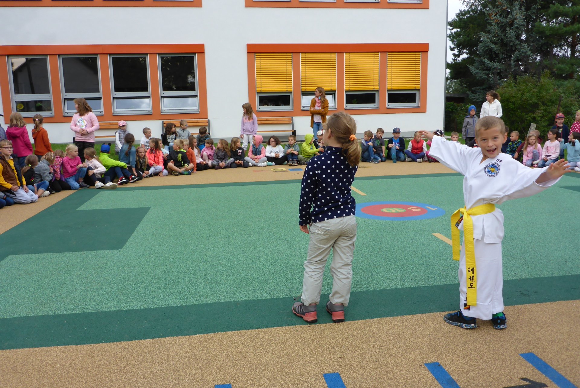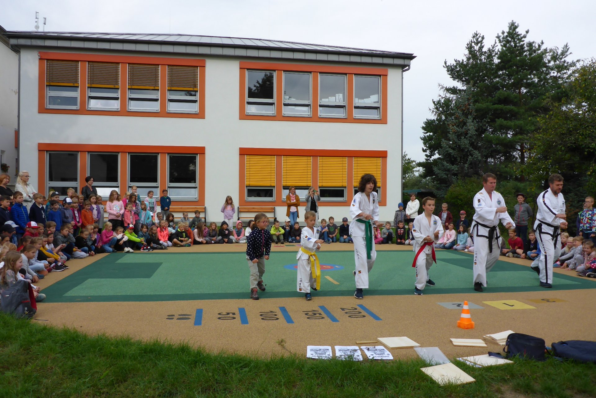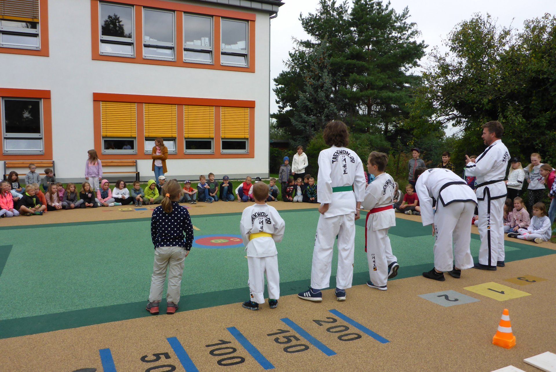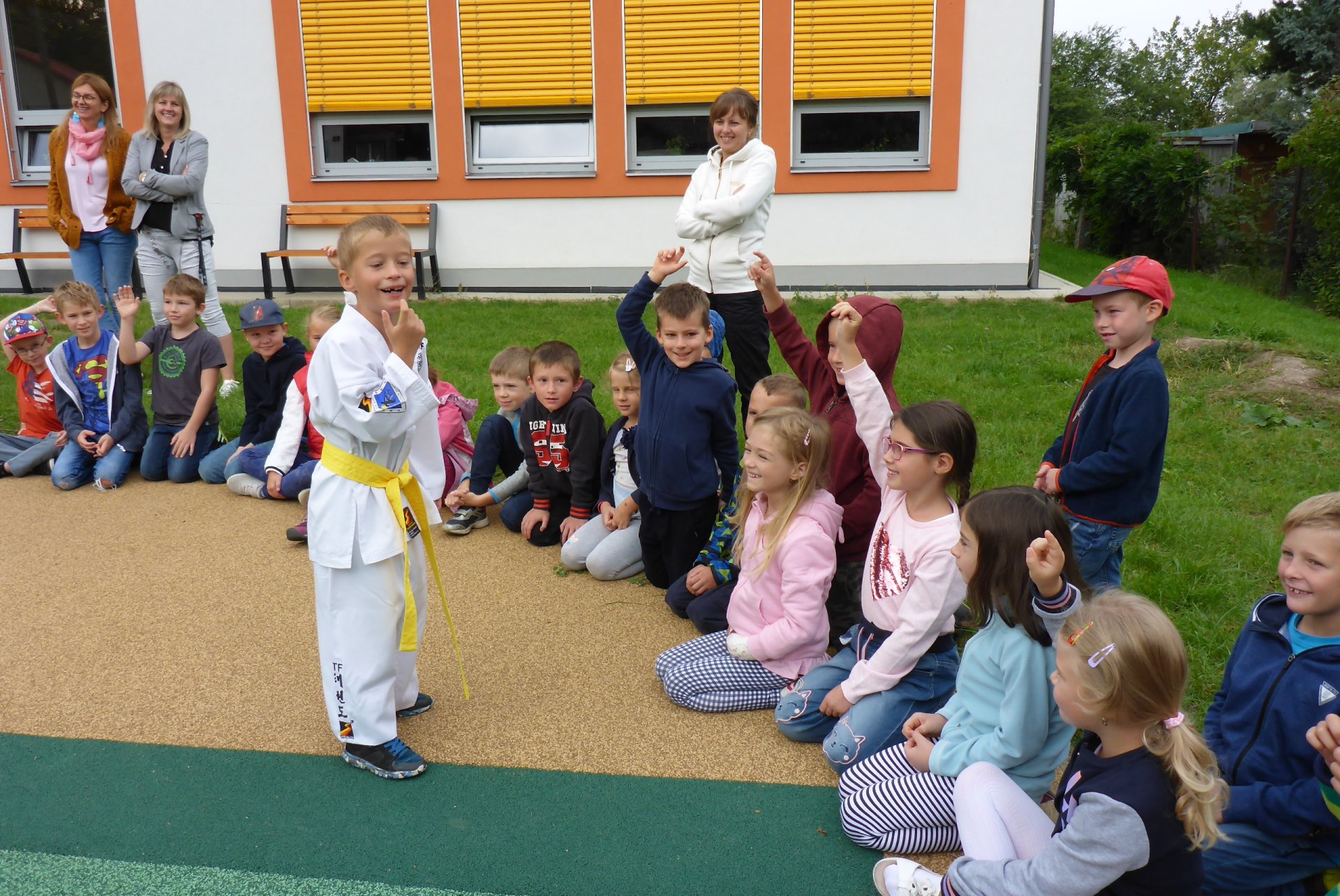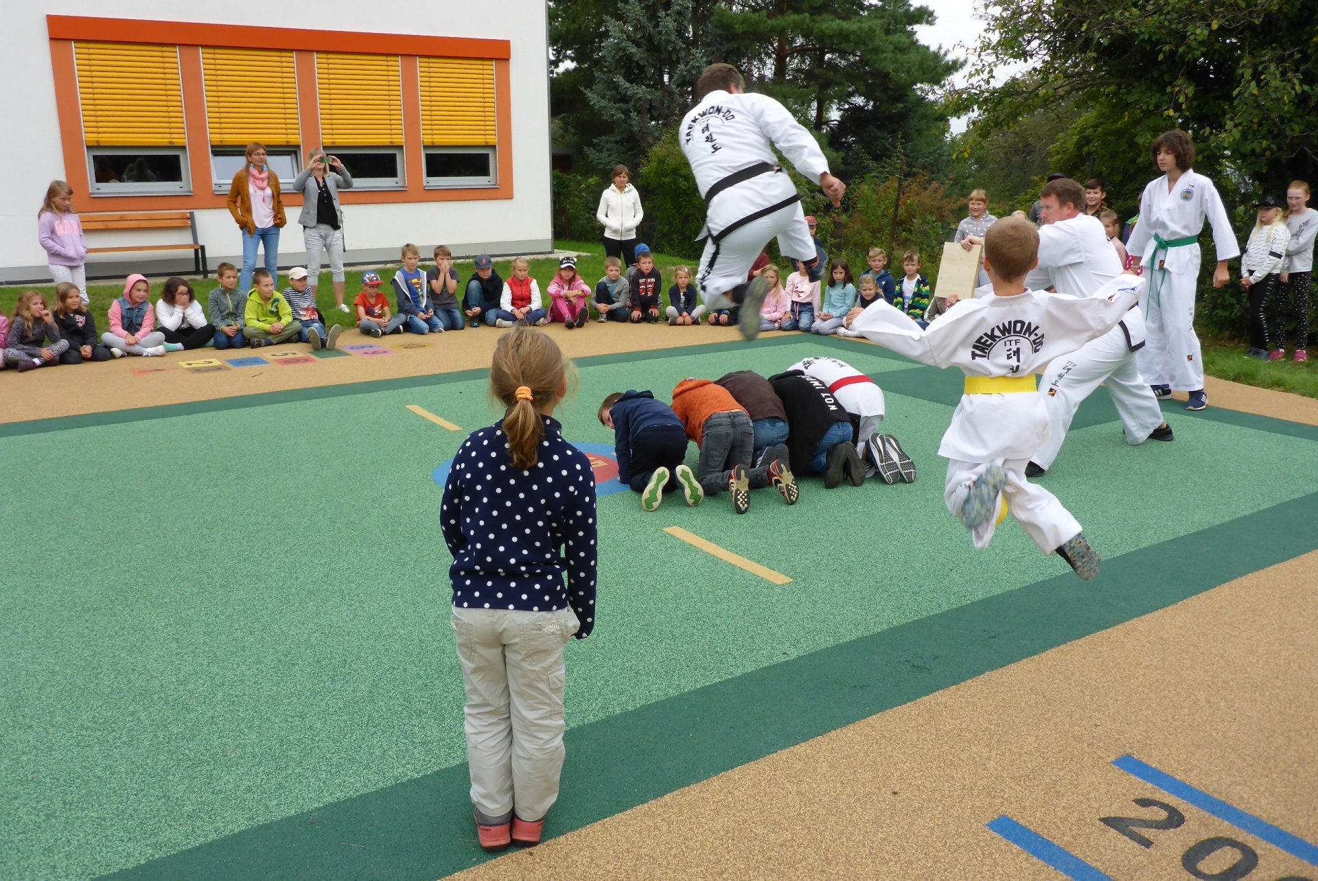 Na novém hřišti v Třebohosticích dnes proběhla ukázka korejského bojového umění řečeného TAEKWONDO, www.tkd.cz. Viděli jsme v akci i několik dětí z naší ZŠ.