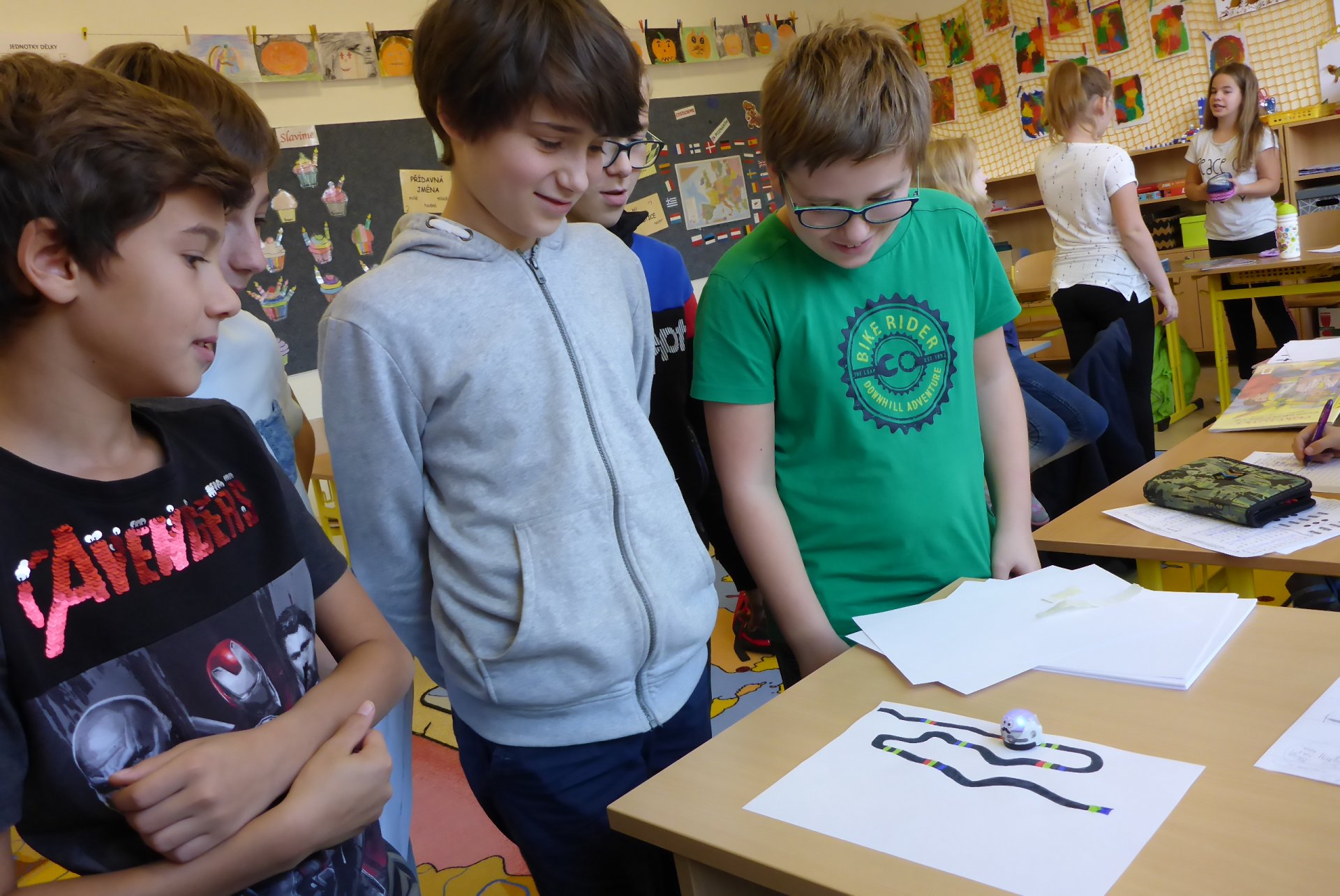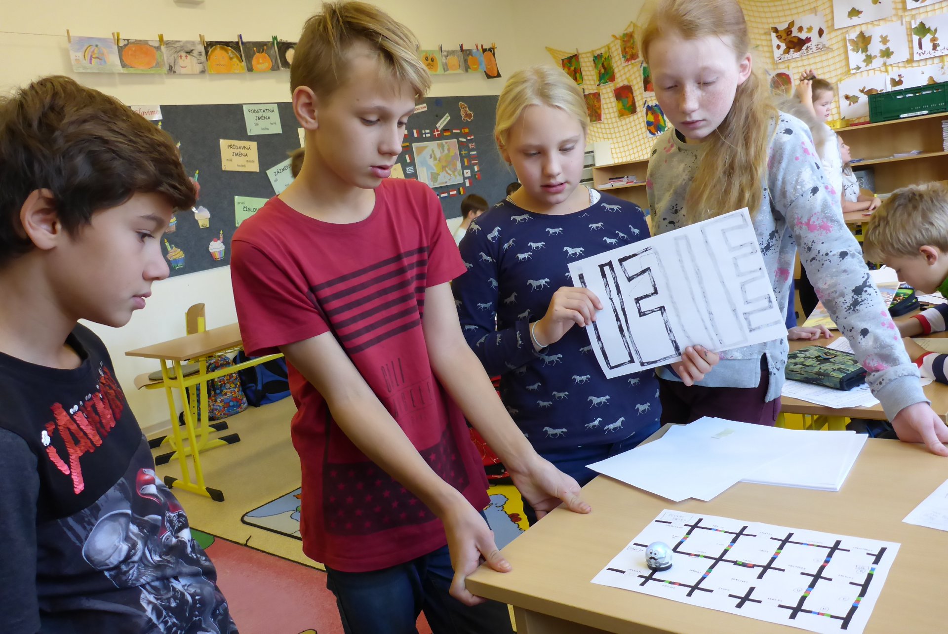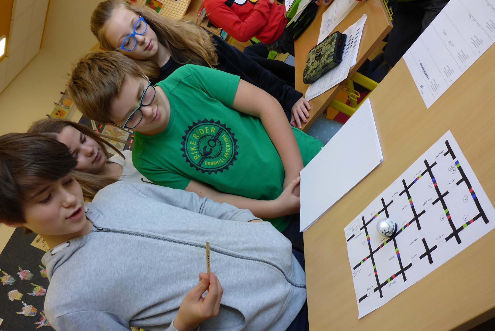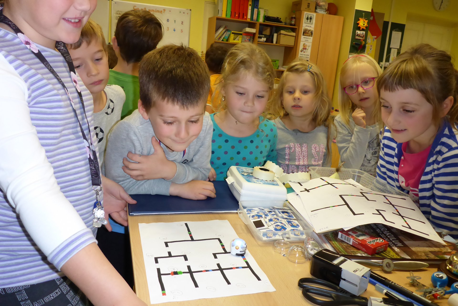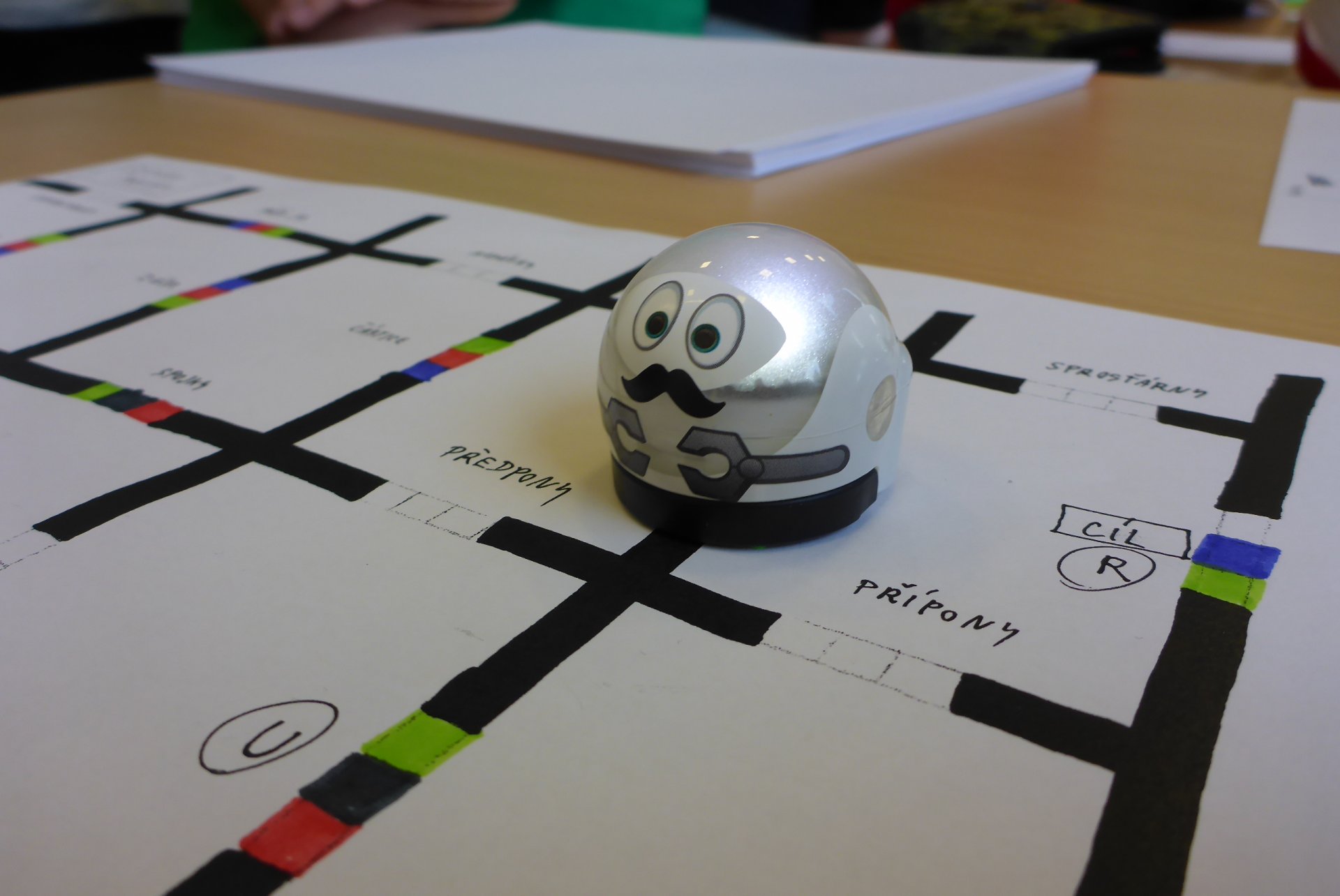 Děti měly možnost se seznámit s Ozobotem, tzv. Ozíkem. Je to výukový robůtek o velikosti golfového míčku, který jezdí, svítí a dá se personifikovat (v našem případě hotový Hercule Poirot, že?). Pomůže při vzdělávání v informatice, programování, algoritmizaci, napomůže matematickému, logickému a analytickému myšlení, podpoří kreativitu, myšlení předem i výtvarnou a manuální zručnost. Formou hry pak pomůže oživit výuku a procvičit probíranou látku prakticky jakéhokoli předmětu. Děti mohou vyrábět pracovní listy a nejrůznější bludiště, robot je kontroluje. V našem případě byl (např. pro 5. B) vyroben pracovní list na procvičení slovních druhů v ČJ.