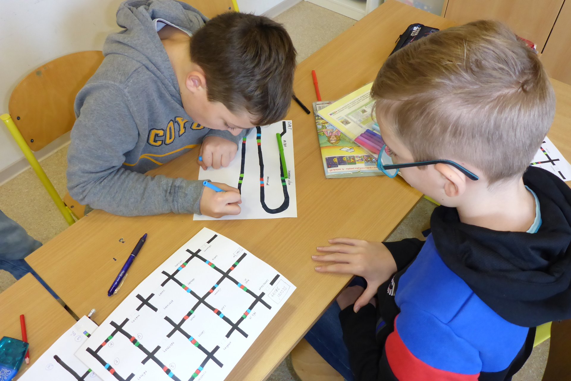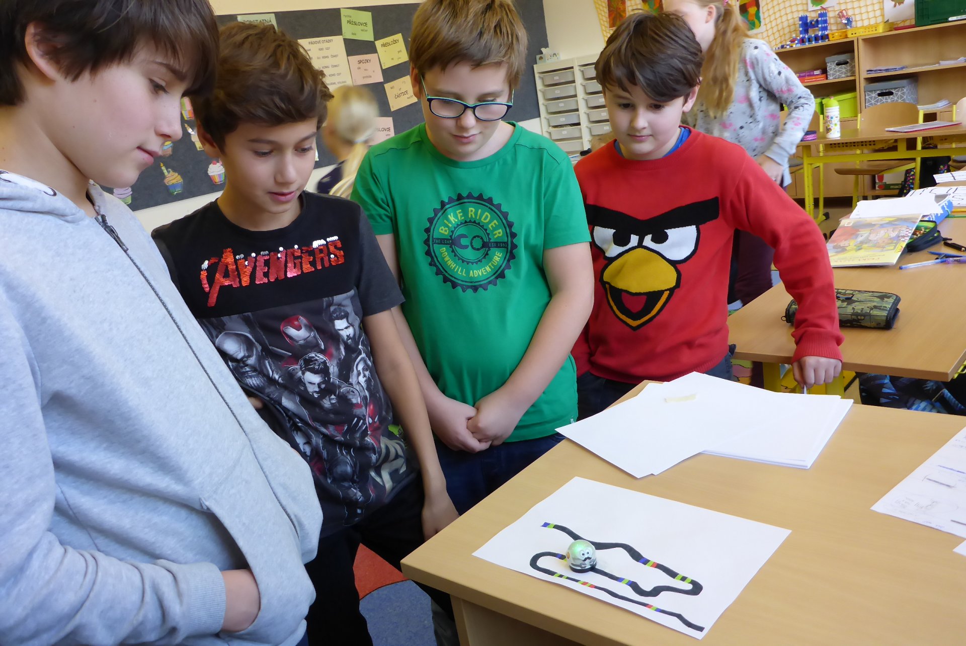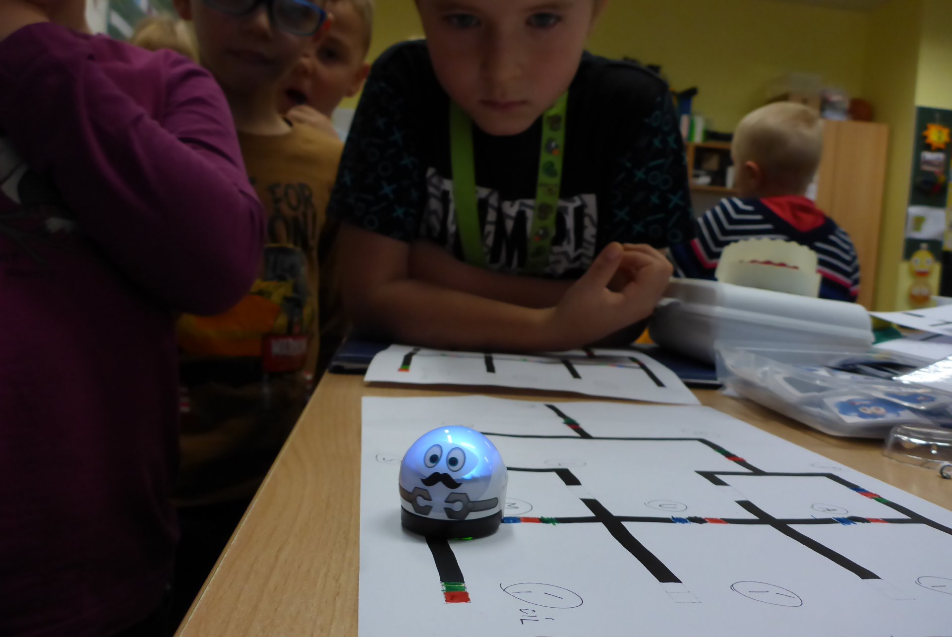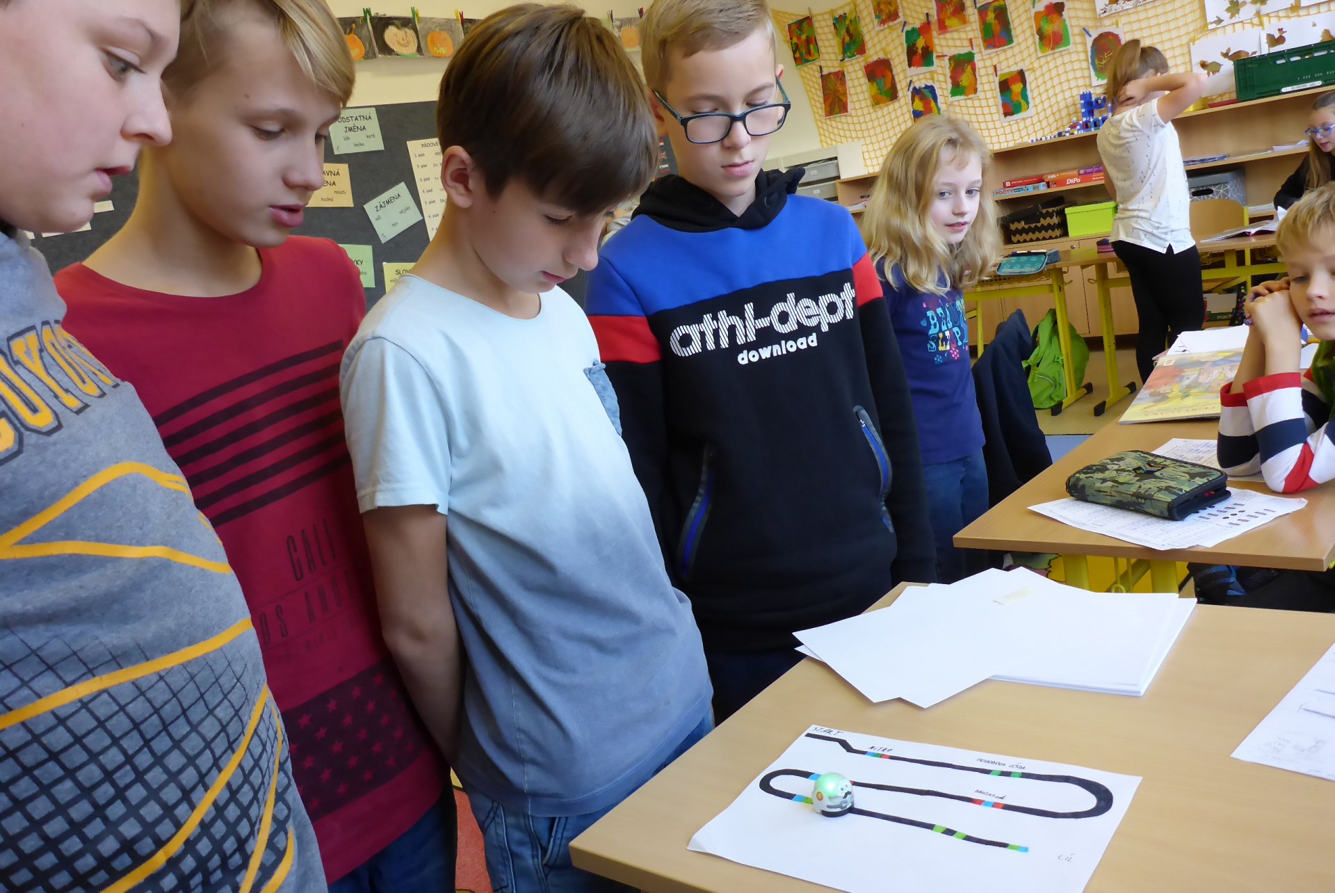 Děti měly možnost se seznámit s Ozobotem, tzv. Ozíkem. Je to výukový robůtek o velikosti golfového míčku, který jezdí, svítí a dá se personifikovat (v našem případě hotový Hercule Poirot, že?). Pomůže při vzdělávání v informatice, programování, algoritmizaci, napomůže matematickému, logickému a analytickému myšlení, podpoří kreativitu, myšlení předem i výtvarnou a manuální zručnost. Formou hry pak pomůže oživit výuku a procvičit probíranou látku prakticky jakéhokoli předmětu. Děti mohou vyrábět pracovní listy a nejrůznější bludiště, robot je kontroluje. V našem případě byl (např. pro 5. B) vyroben pracovní list na procvičení slovních druhů v ČJ.