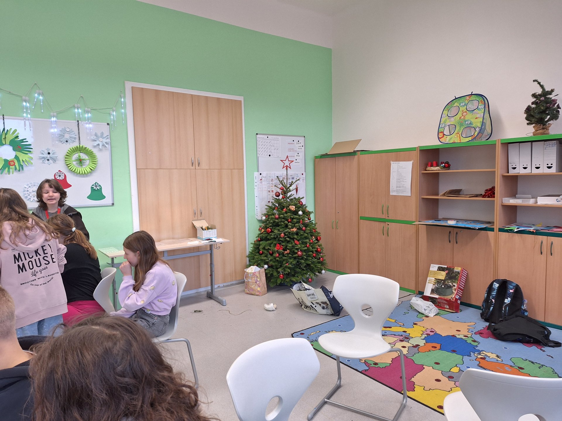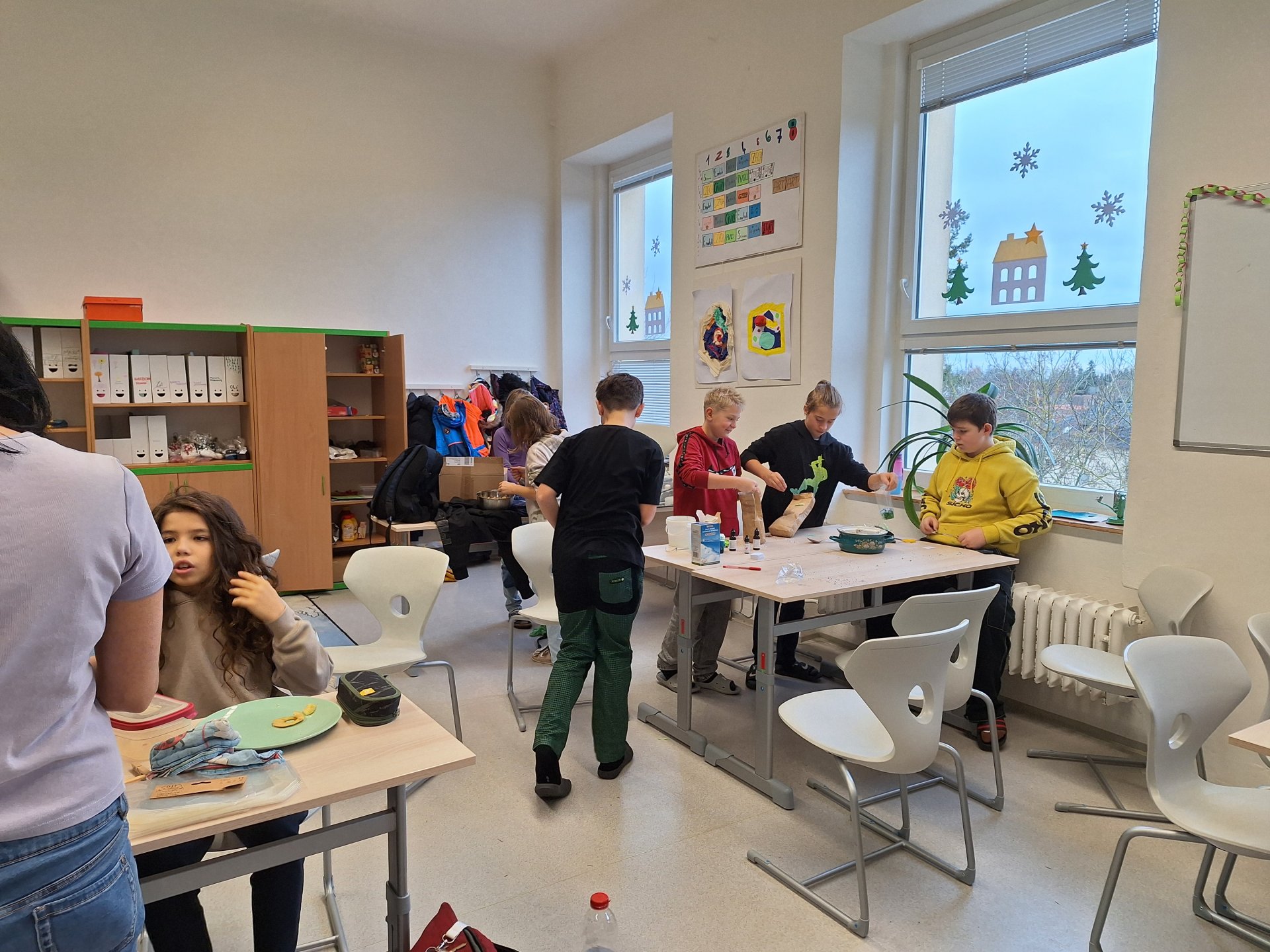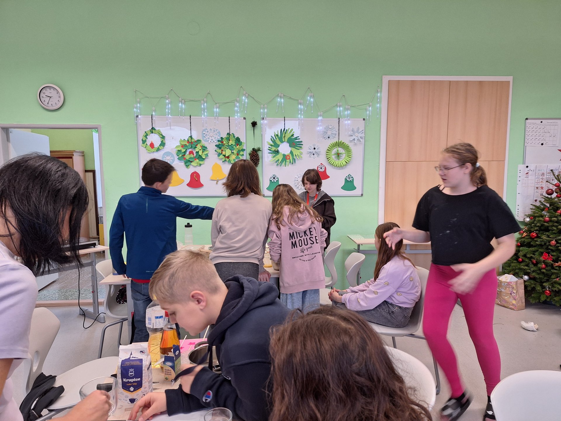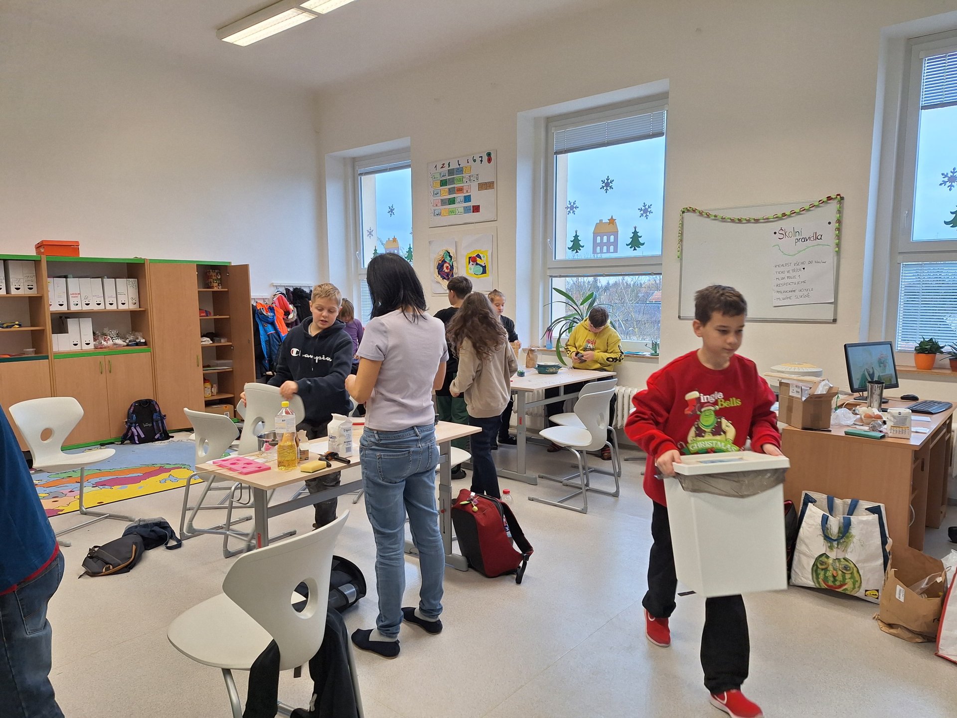 V pátek 29.11. probíhaly vánoční dílny, kde děti připravovaly své výrobky pro jarmark, který proběhl v neděli, 1.12. Naše třída se však na jarmark začala připravovat již řadu týdnů předtím. Řada dětí na výrobcích pracovala již doma a v dílnách probíhaly jen dokončovací práce. Děti vyráběly ručně vázané náramky, odlévaly sošky andílků, vyráběly voňavá mýdla, lízátka z karamelu, skřítky, pekly a zdobily perníčky, hořické trubičky, slaný karamel.... Na jarmarku se pak staly hitem párky v rohlíku. Bylo to fajn a už se těšíme na vánoční svátky. J. Horníčková